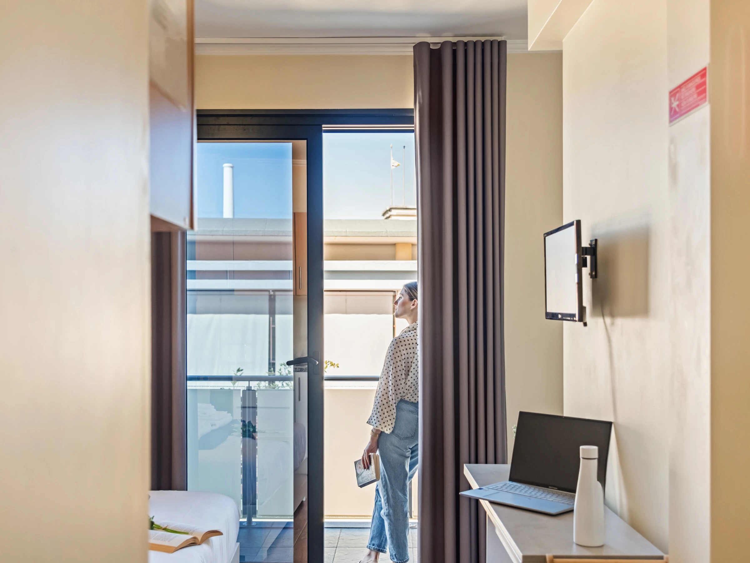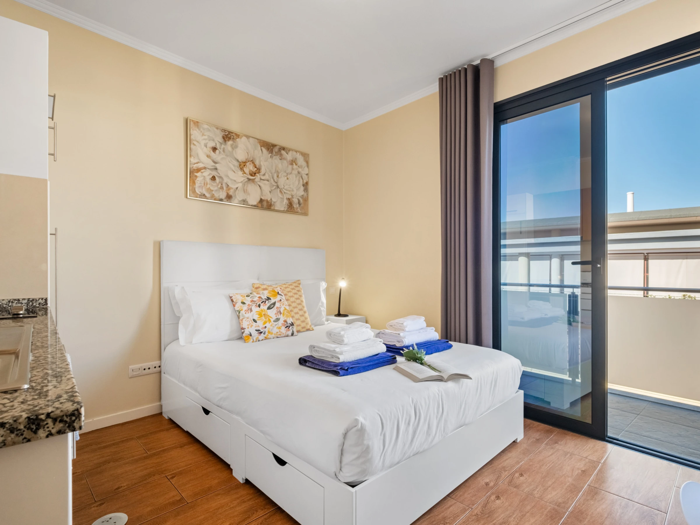 Al entrar, encuentra un espacio funcional y bien organizado, compuesto por una cama de matrimonio, armario y un pequeño escritorio, ideal para quien necesita conciliar ocio con trabajo.