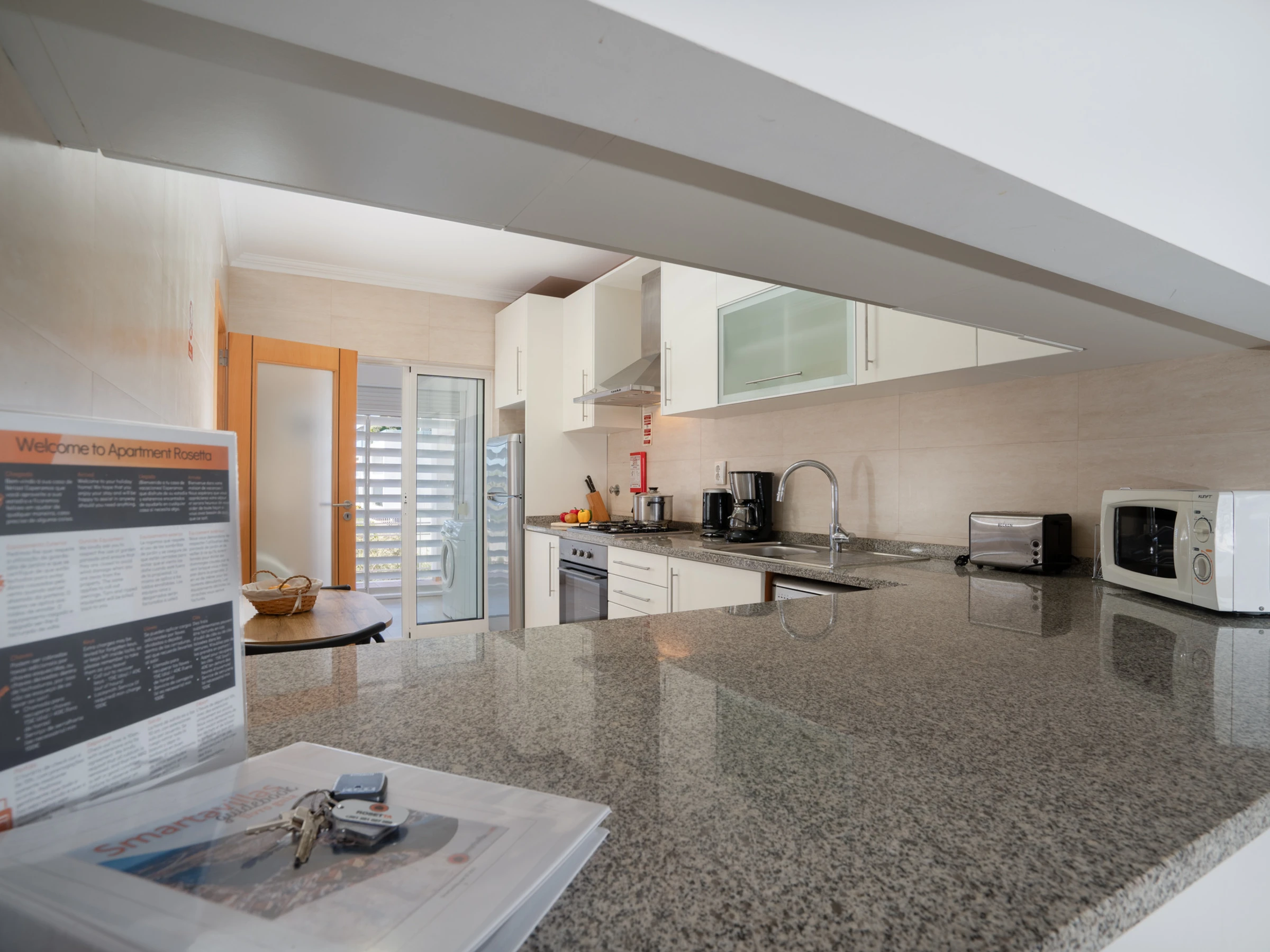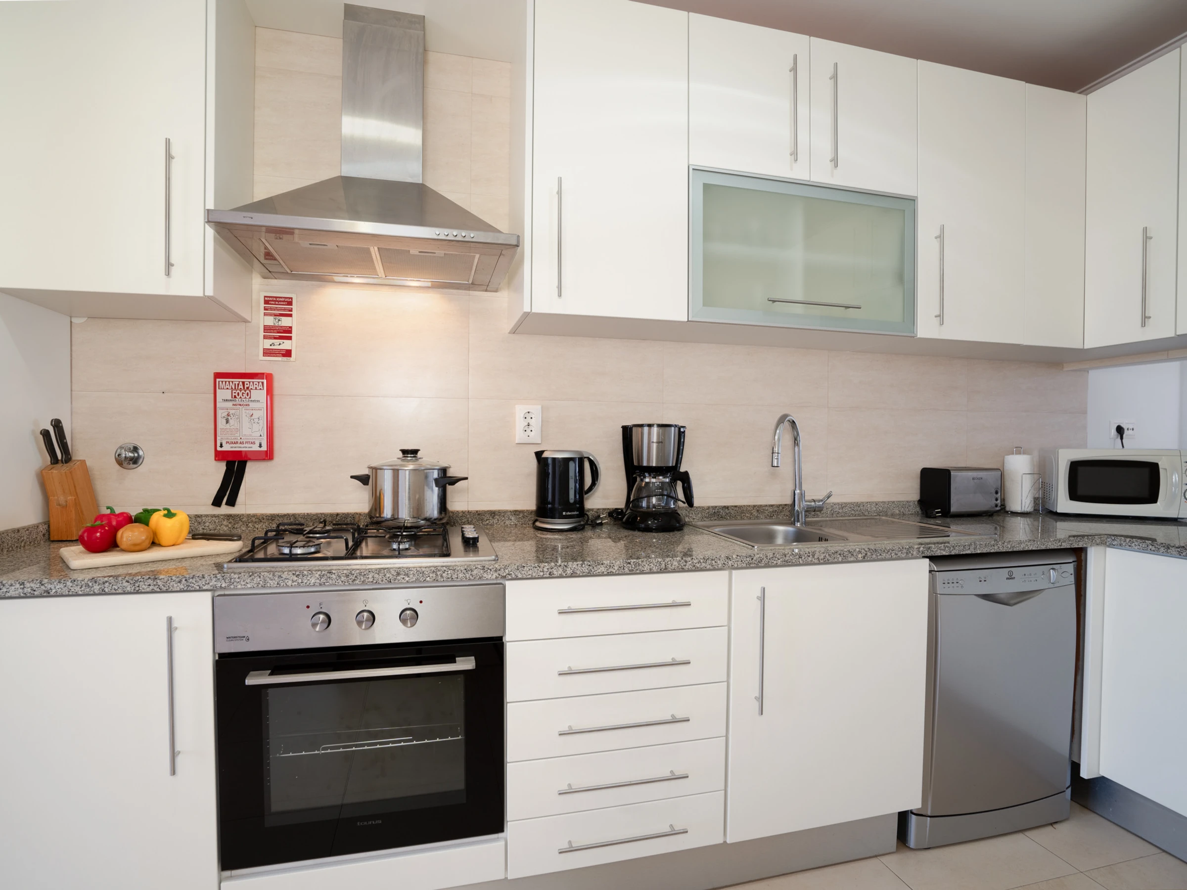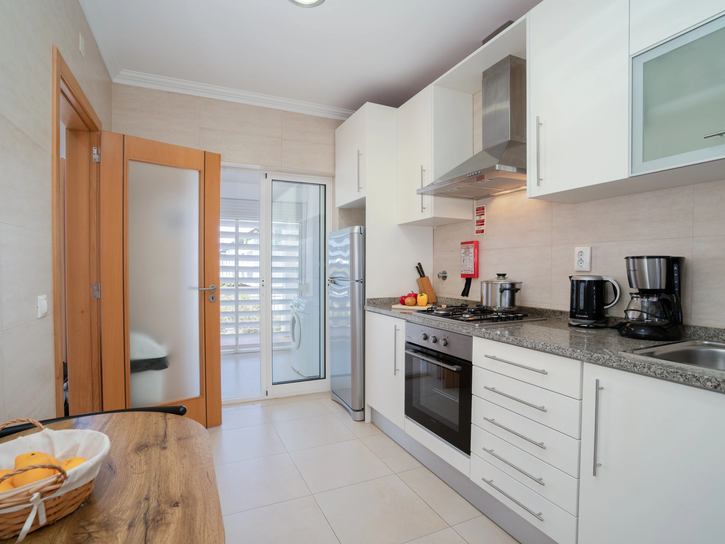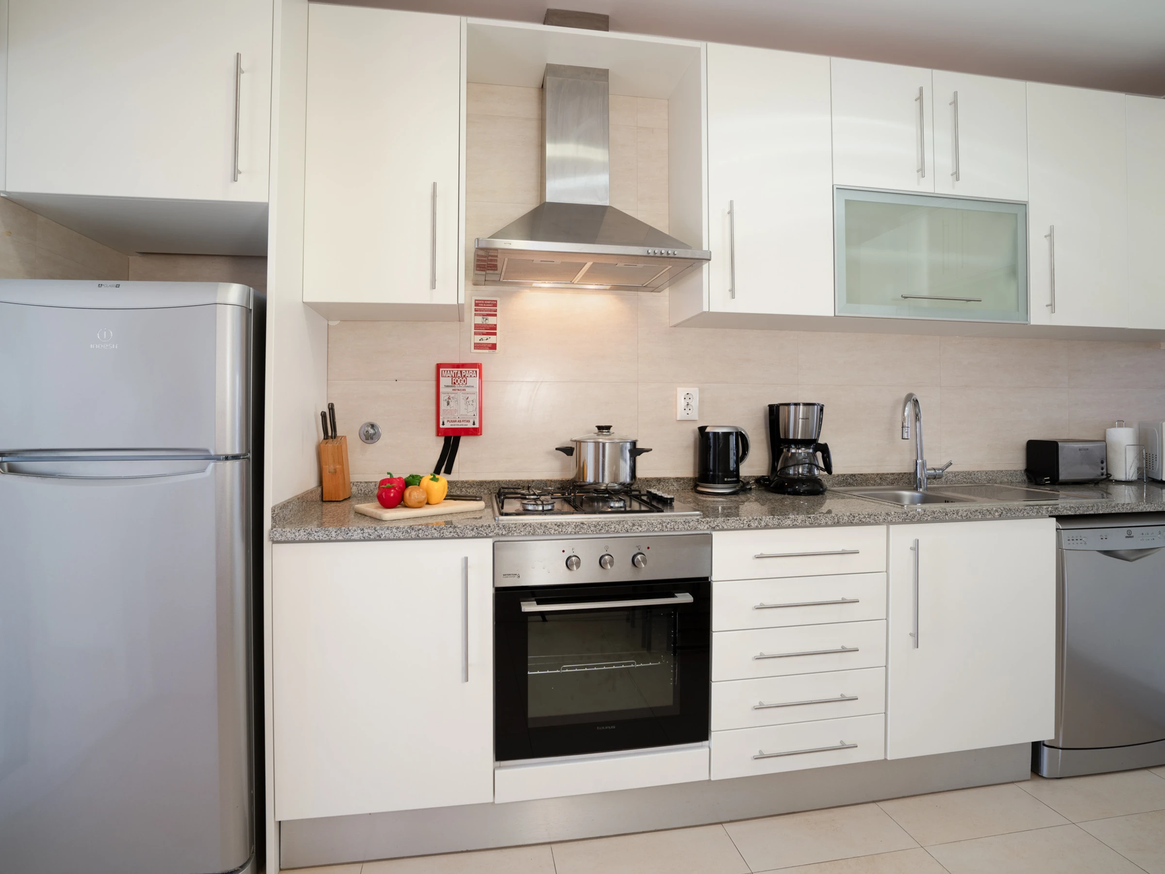 El salón ofrece sofás cómodos y una mesa de comedor, mientras que la cocina de estilo galera está equipada con electrodomésticos modernos, incluyendo un lavavajillas, lavadora y cafetera, además de una barra de desayuno y muchos utensilios para hacer la autopreparación de comidas fácil y agradable.