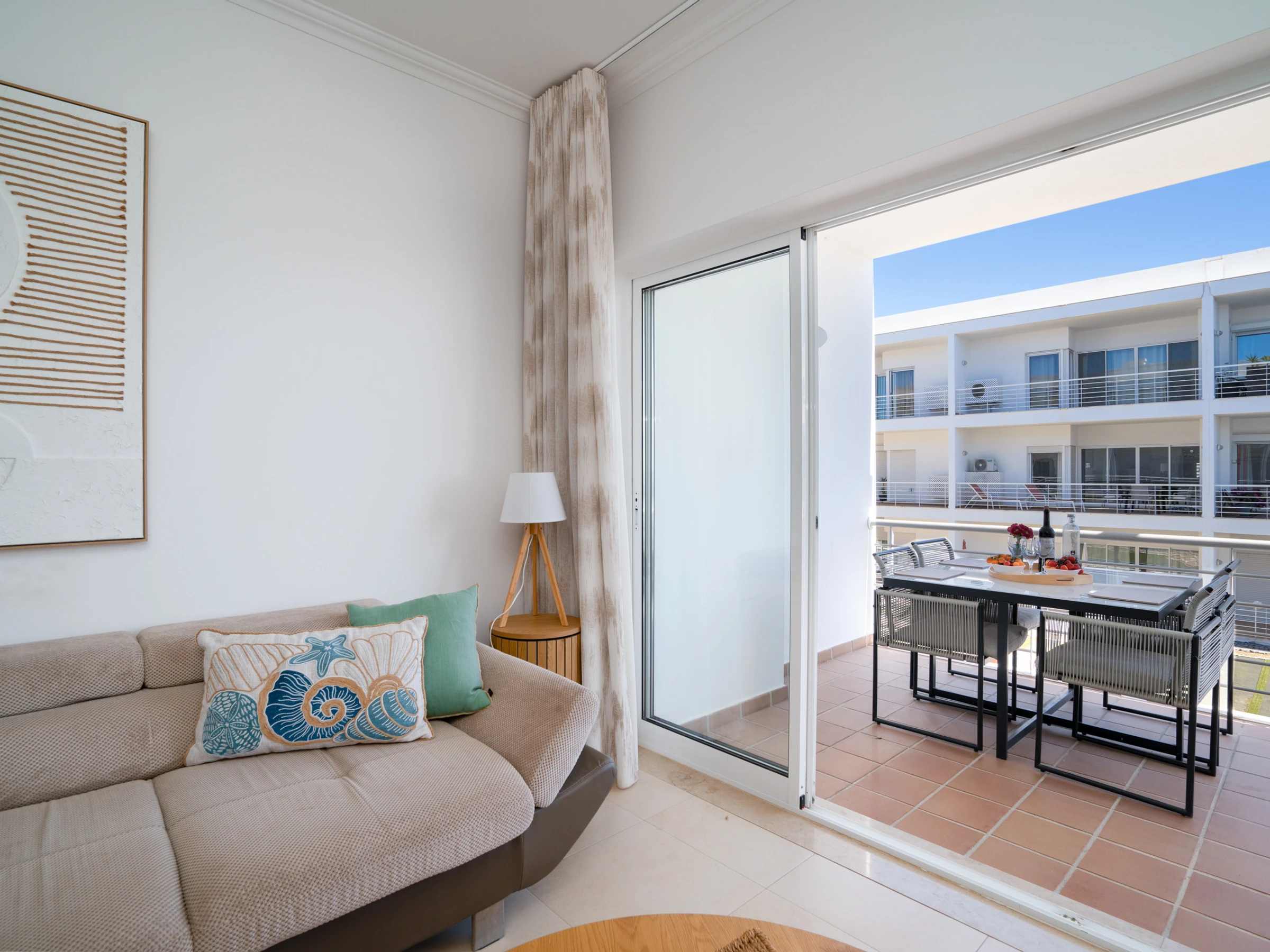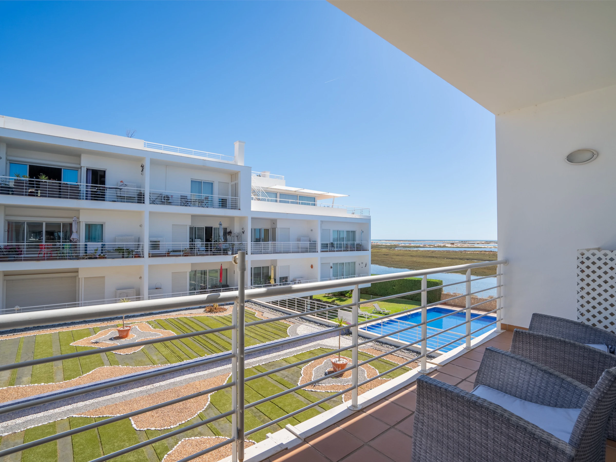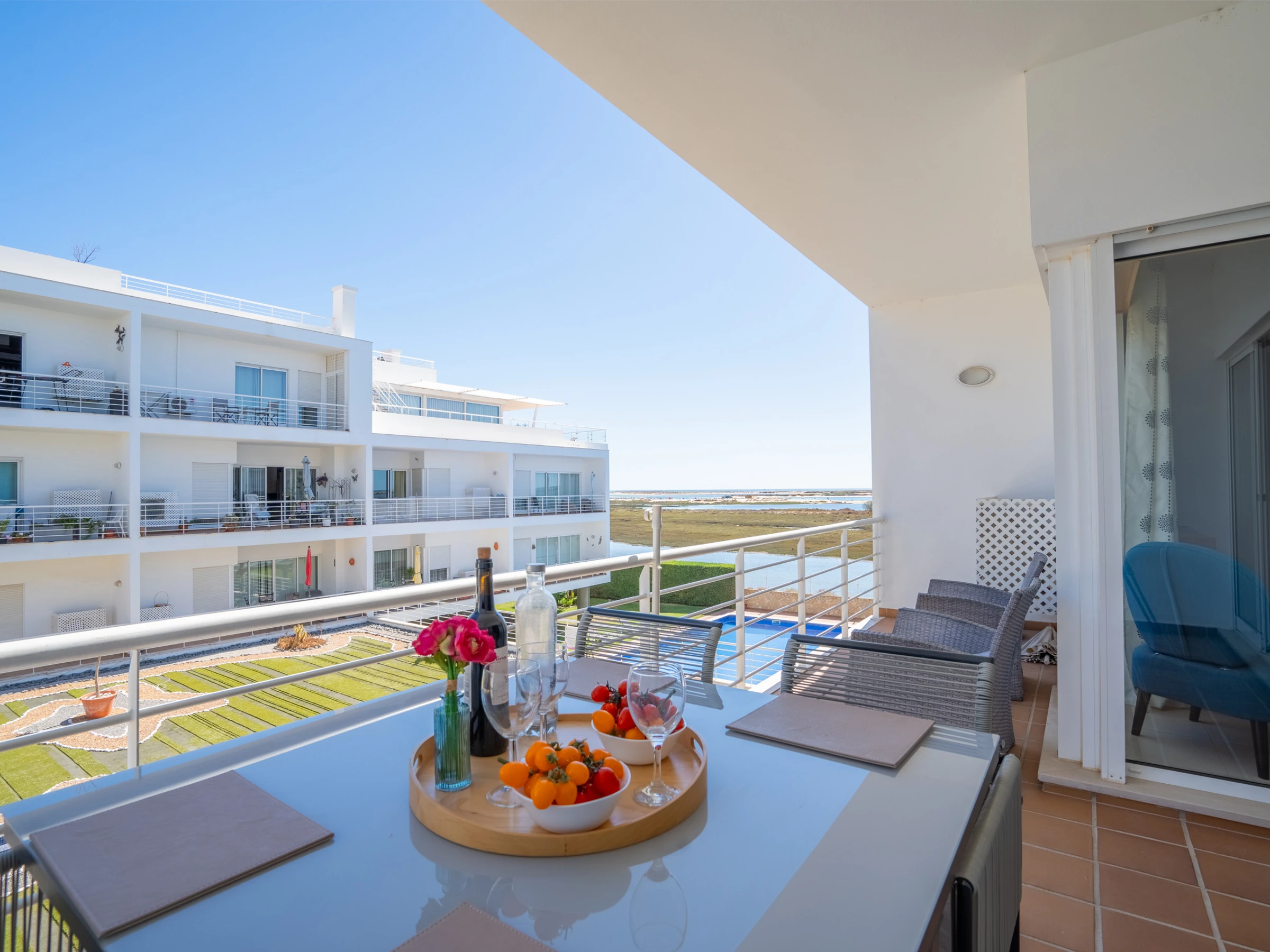 El apartamento cuenta con un balcón privado, perfecto para cenar al aire libre, disfrutar de un café matutino o simplemente sentarse con un libro mientras se disfruta del aire marino fresco y las vistas de la Ria Formosa.