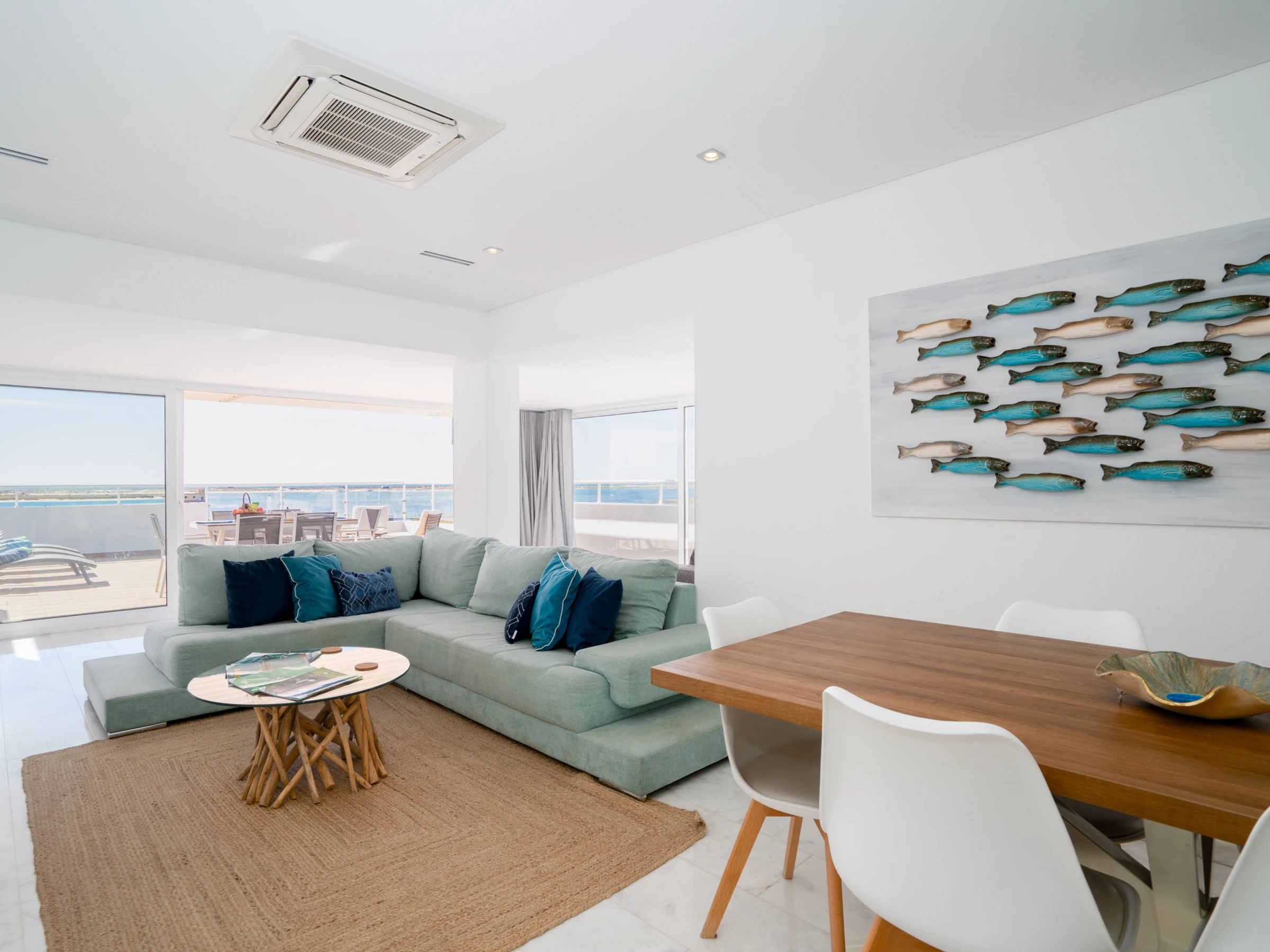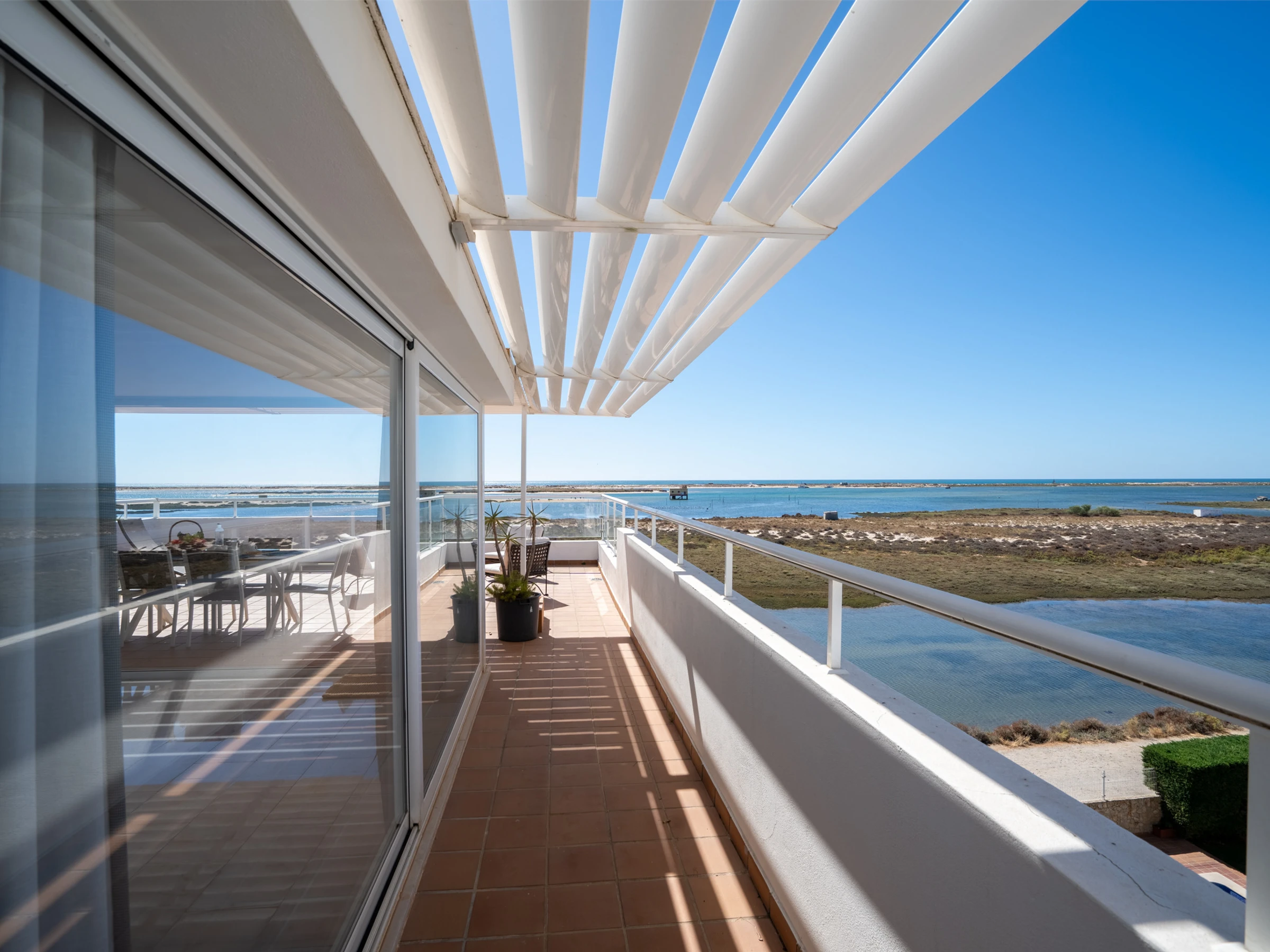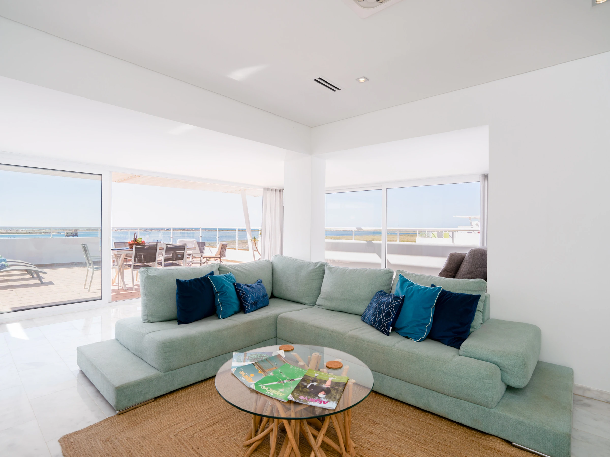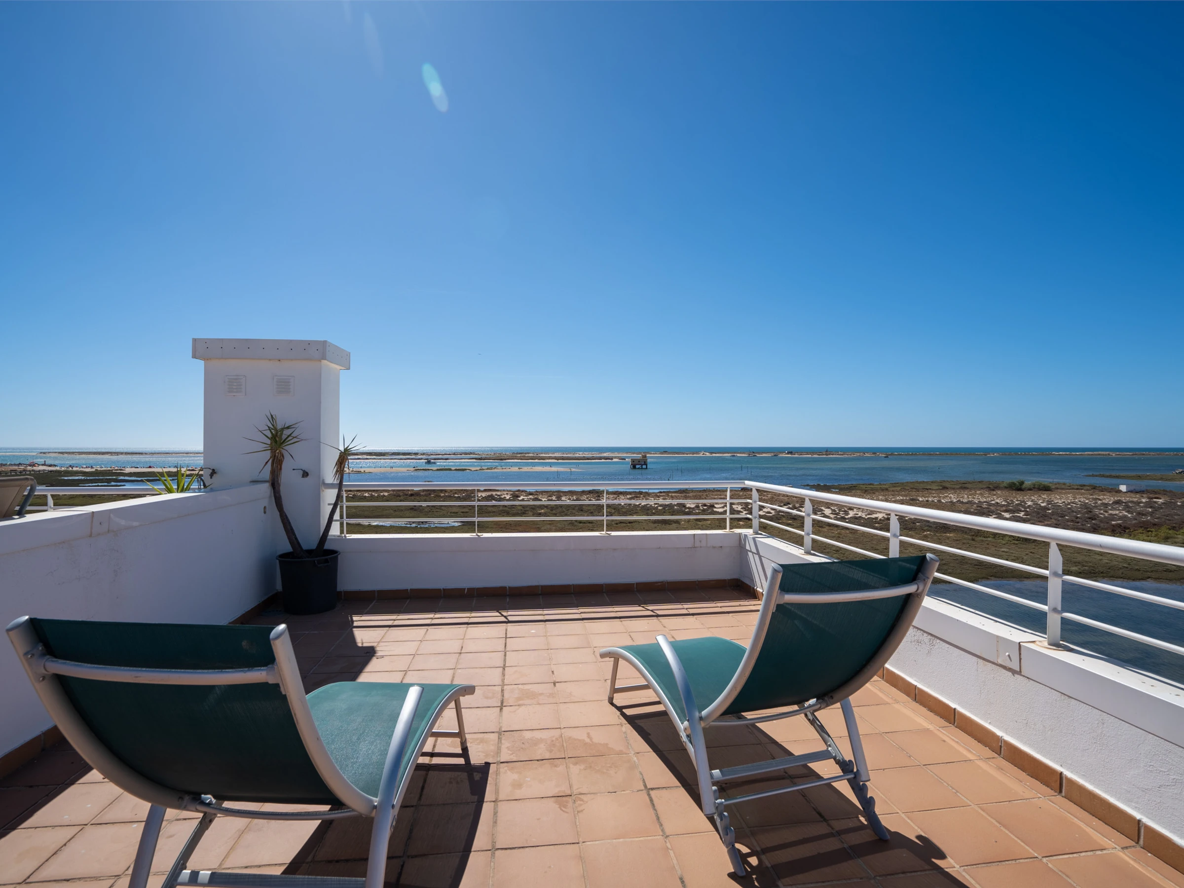 Precioso apartamento en el último piso en Fuseta con impresionante vista sobre la Ria Formosa y el Océano Atlántico que cuenta con 2 dormitorios luminosos, 2 baños y una elegante zona de estar diáfana con sofás y espacio para comedor. Relájese en la terraza envolvente con tumbonas o disfrute de una comida al aire libre con vistas al mar. La terraza privada superior es el lugar perfecto para los amantes del sol y ¡ofrece una vista increíble! A solo 2 minutos a pie de restaurantes y cafés y a 10 minutos de paseo de la playa dorada de la laguna.