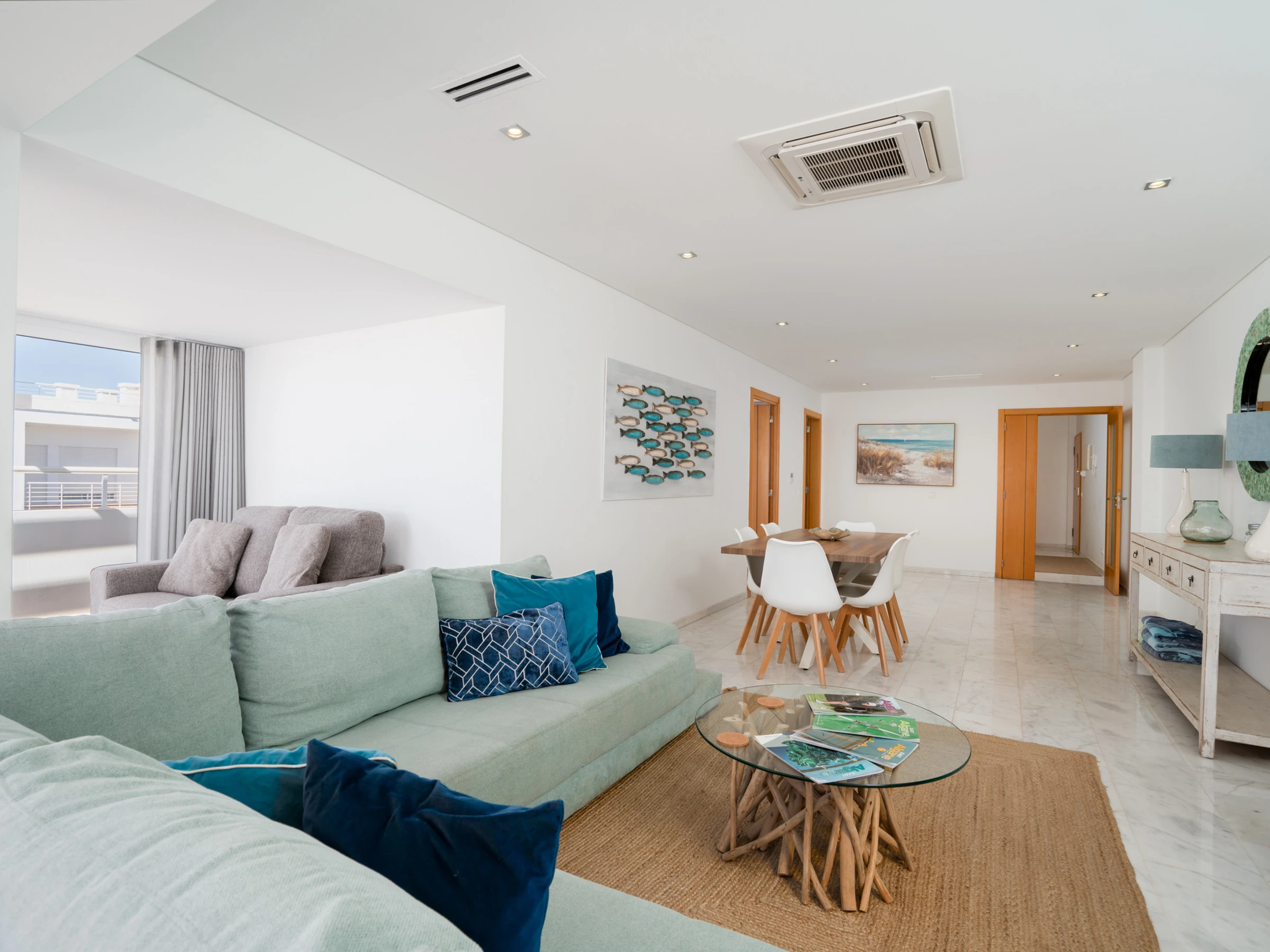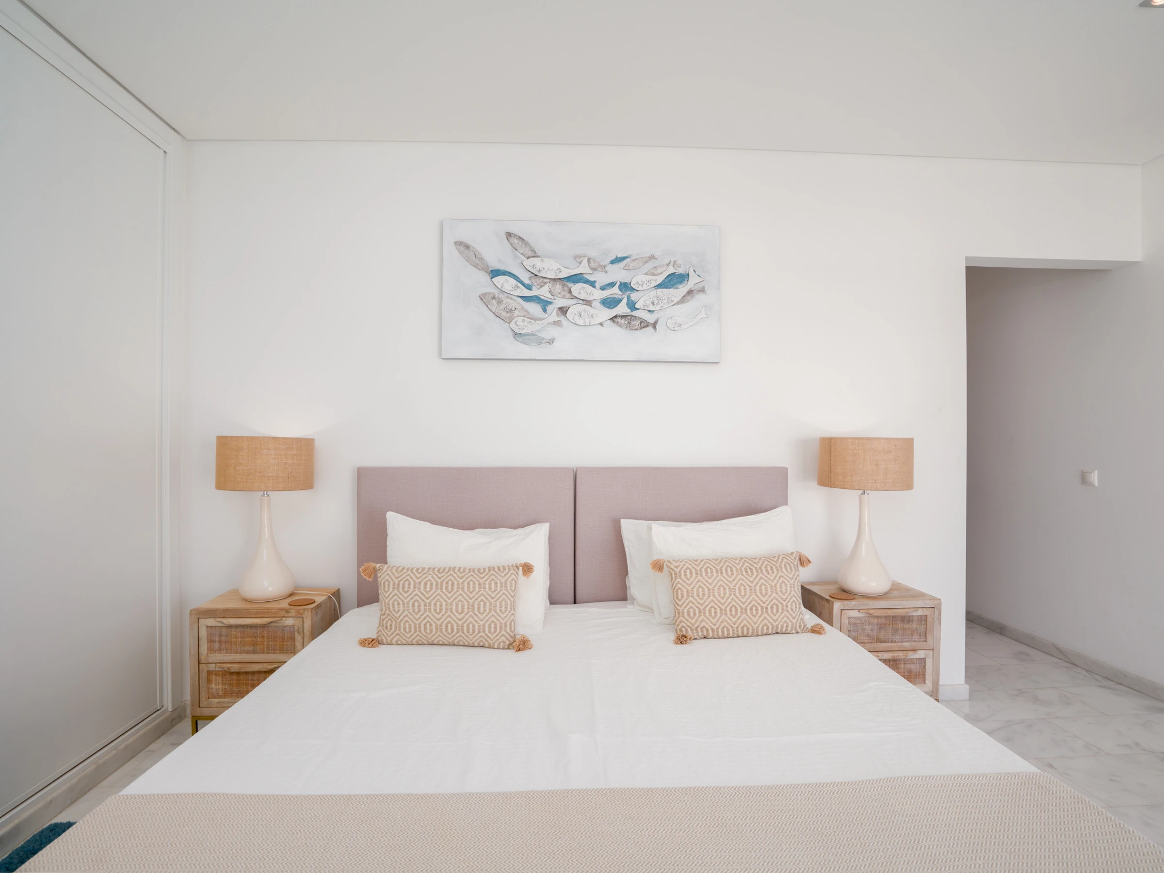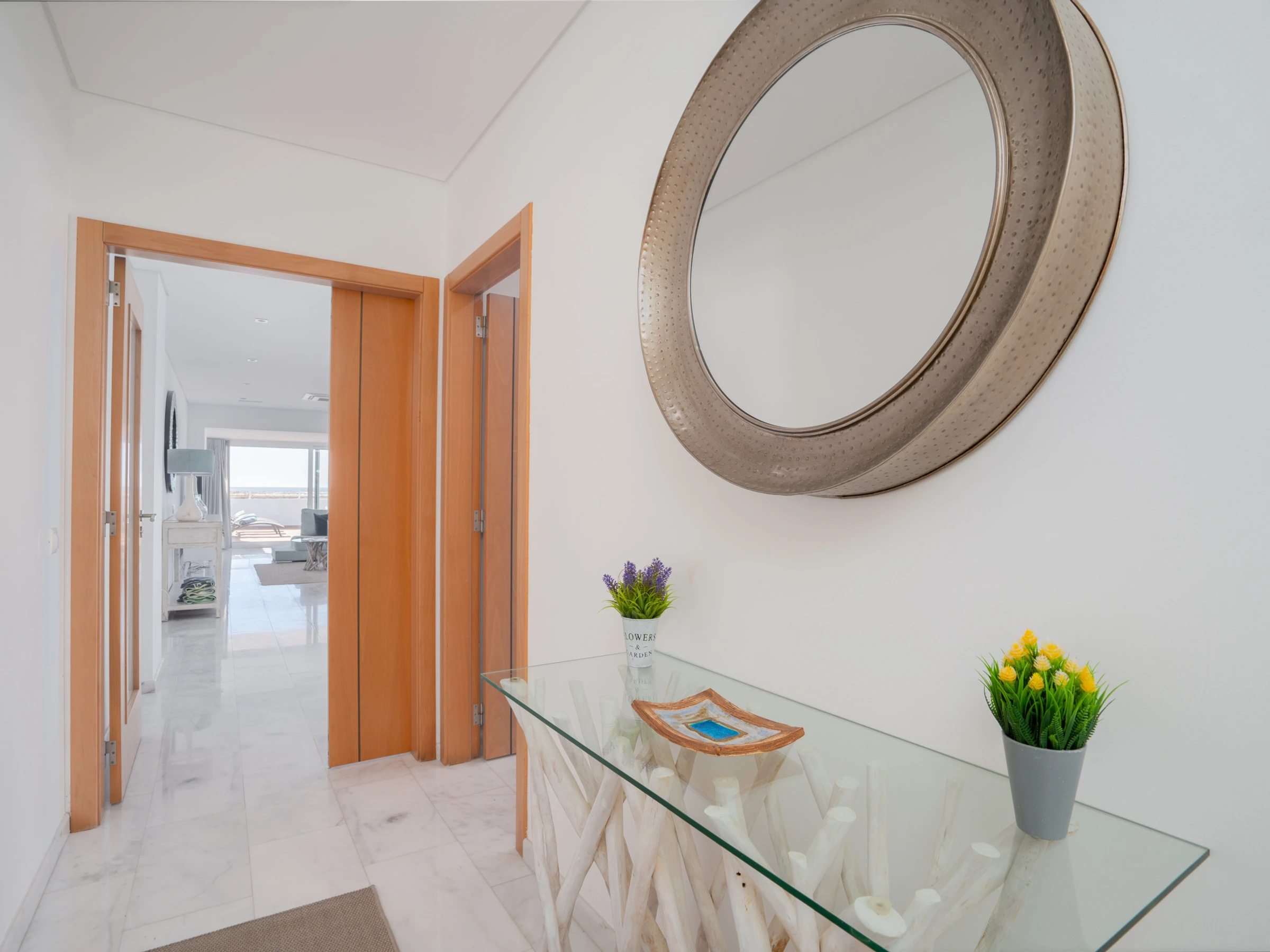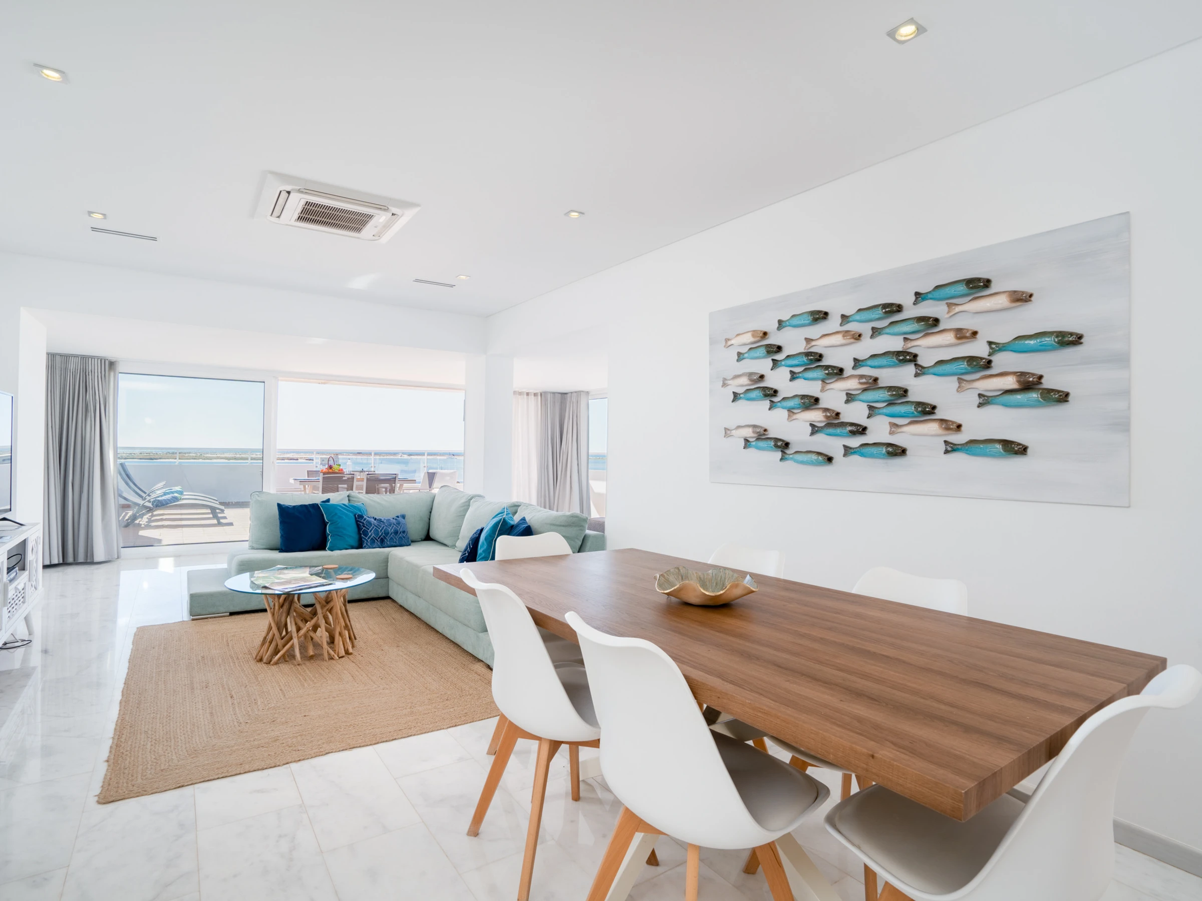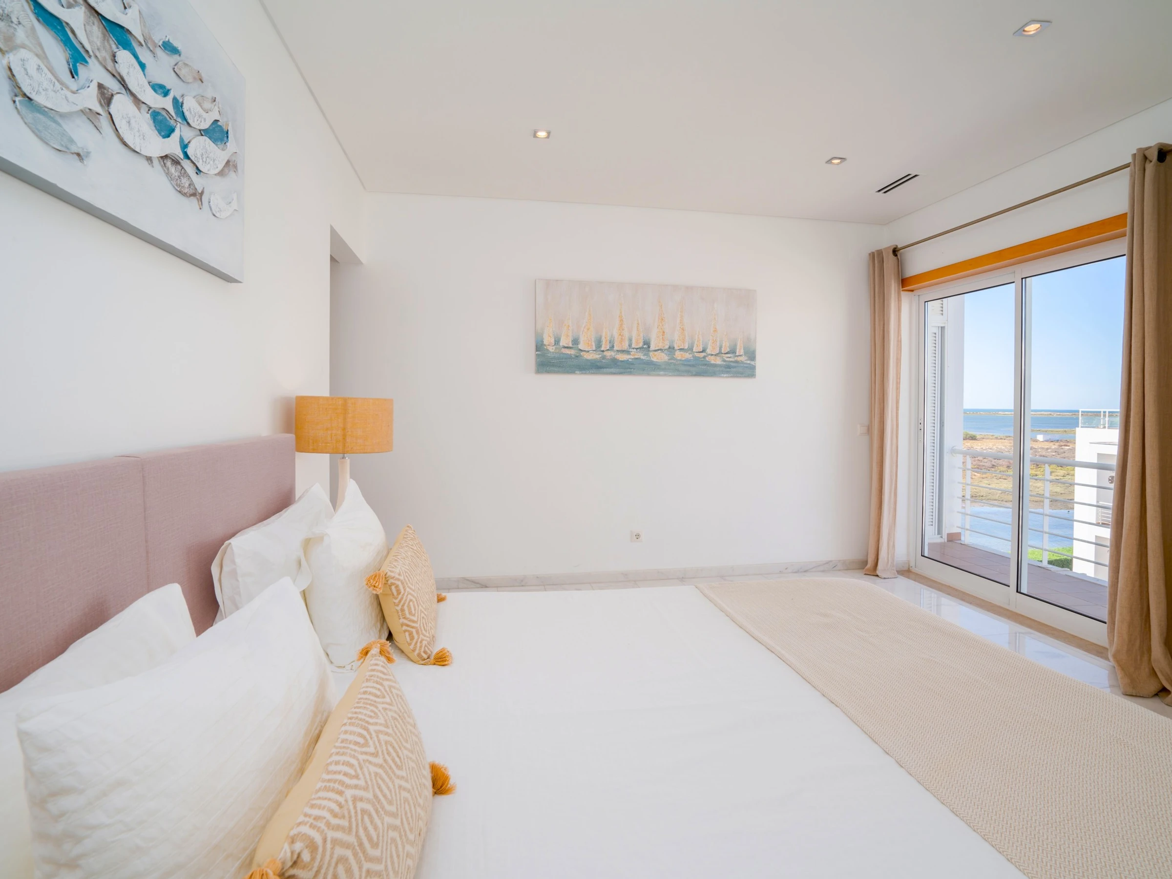 Precioso apartamento en el último piso en Fuseta con impresionante vista sobre la Ria Formosa y el Océano Atlántico que cuenta con 2 dormitorios luminosos, 2 baños y una elegante zona de estar diáfana con sofás y espacio para comedor. Relájese en la terraza envolvente con tumbonas o disfrute de una comida al aire libre con vistas al mar. La terraza privada superior es el lugar perfecto para los amantes del sol y ¡ofrece una vista increíble! A solo 2 minutos a pie de restaurantes y cafés y a 10 minutos de paseo de la playa dorada de la laguna.
