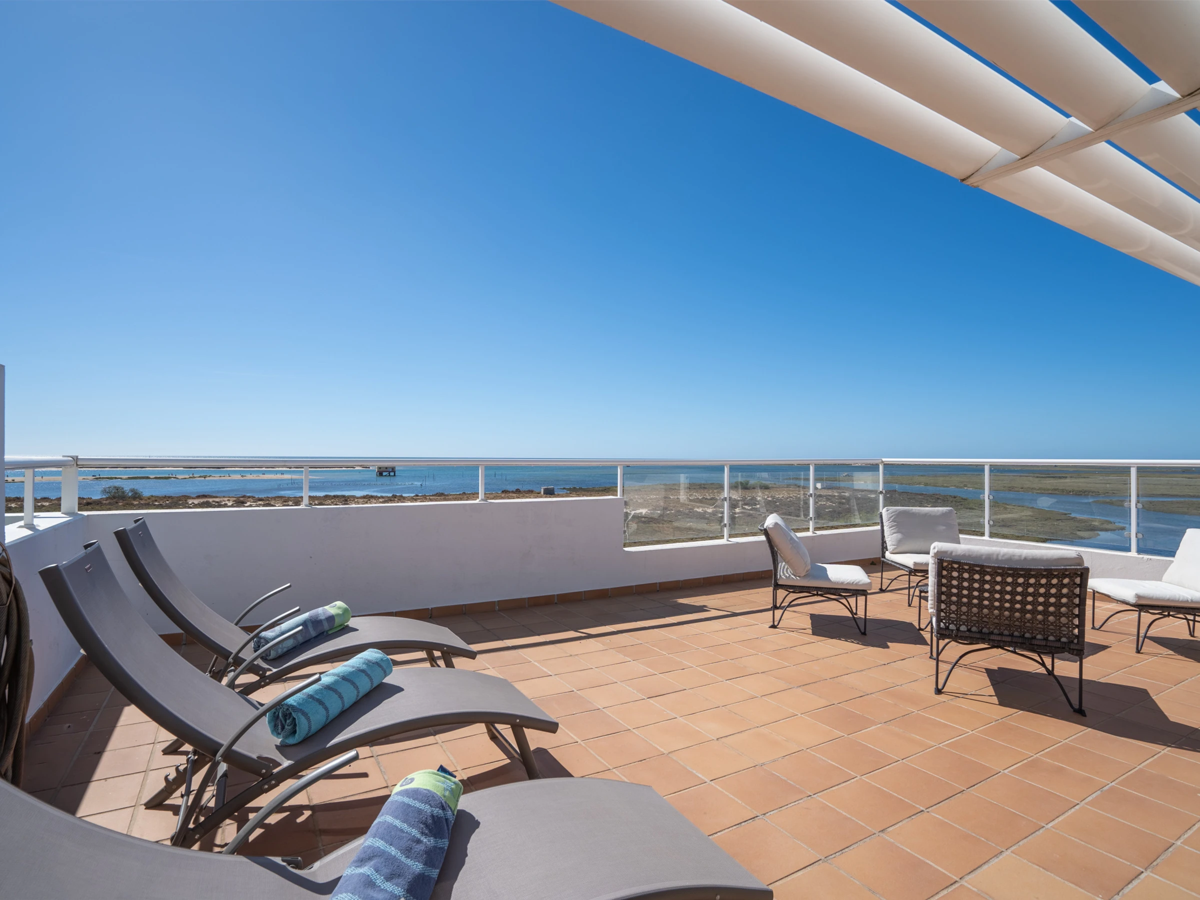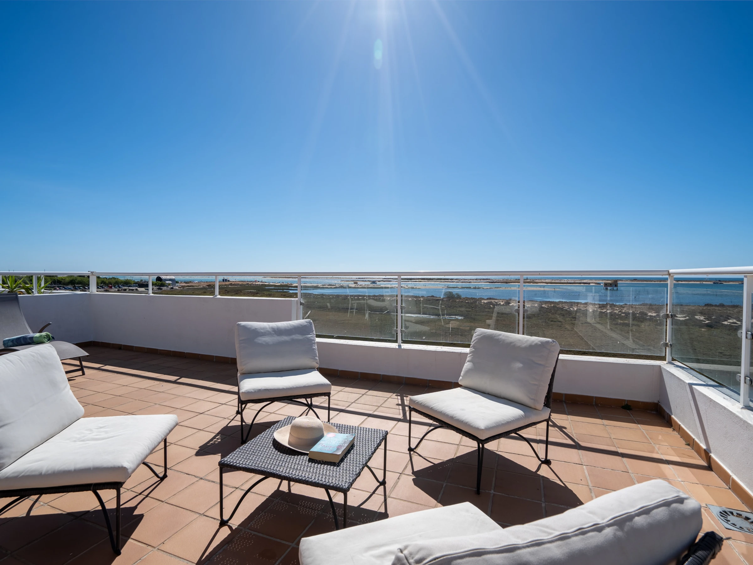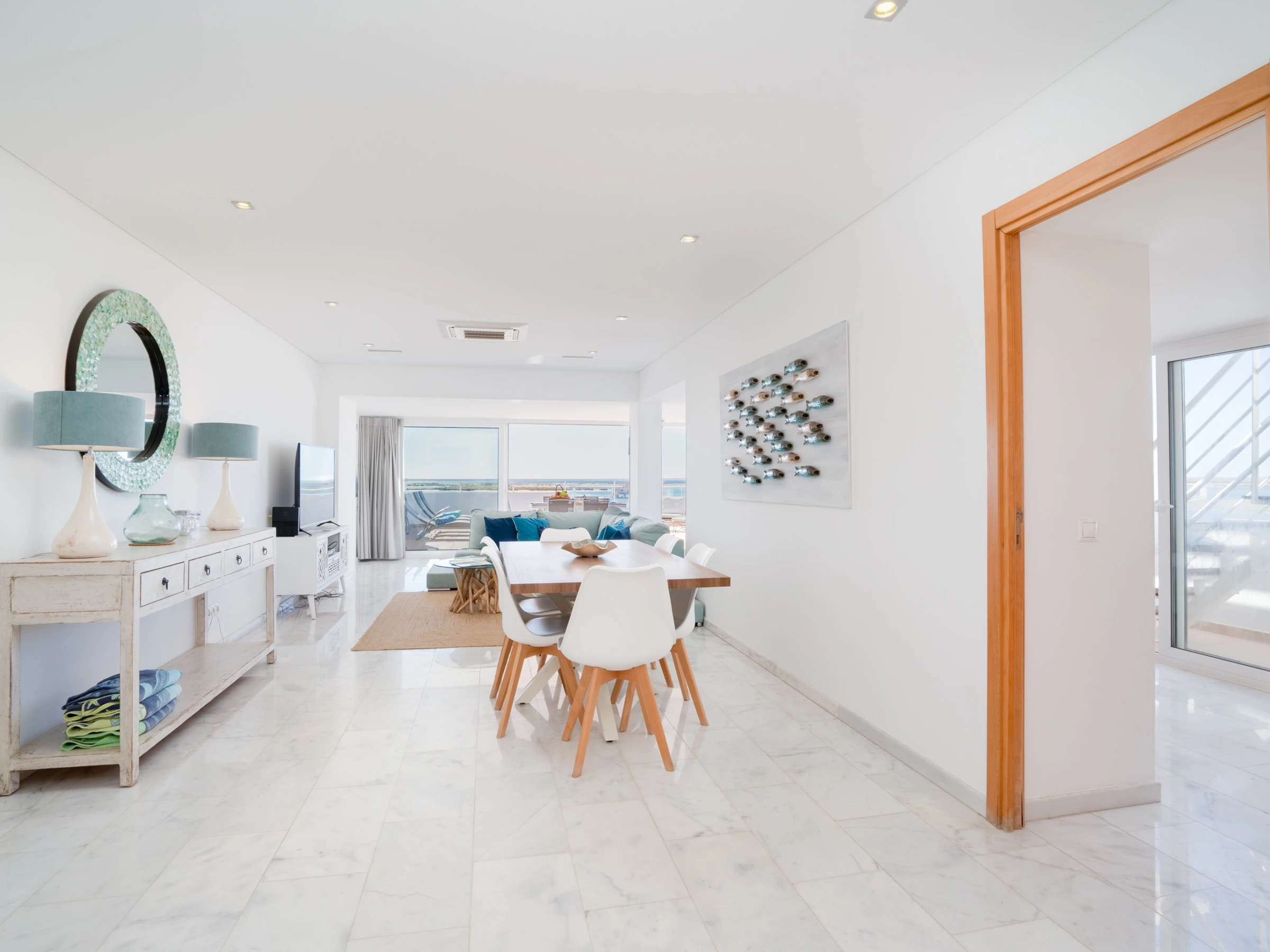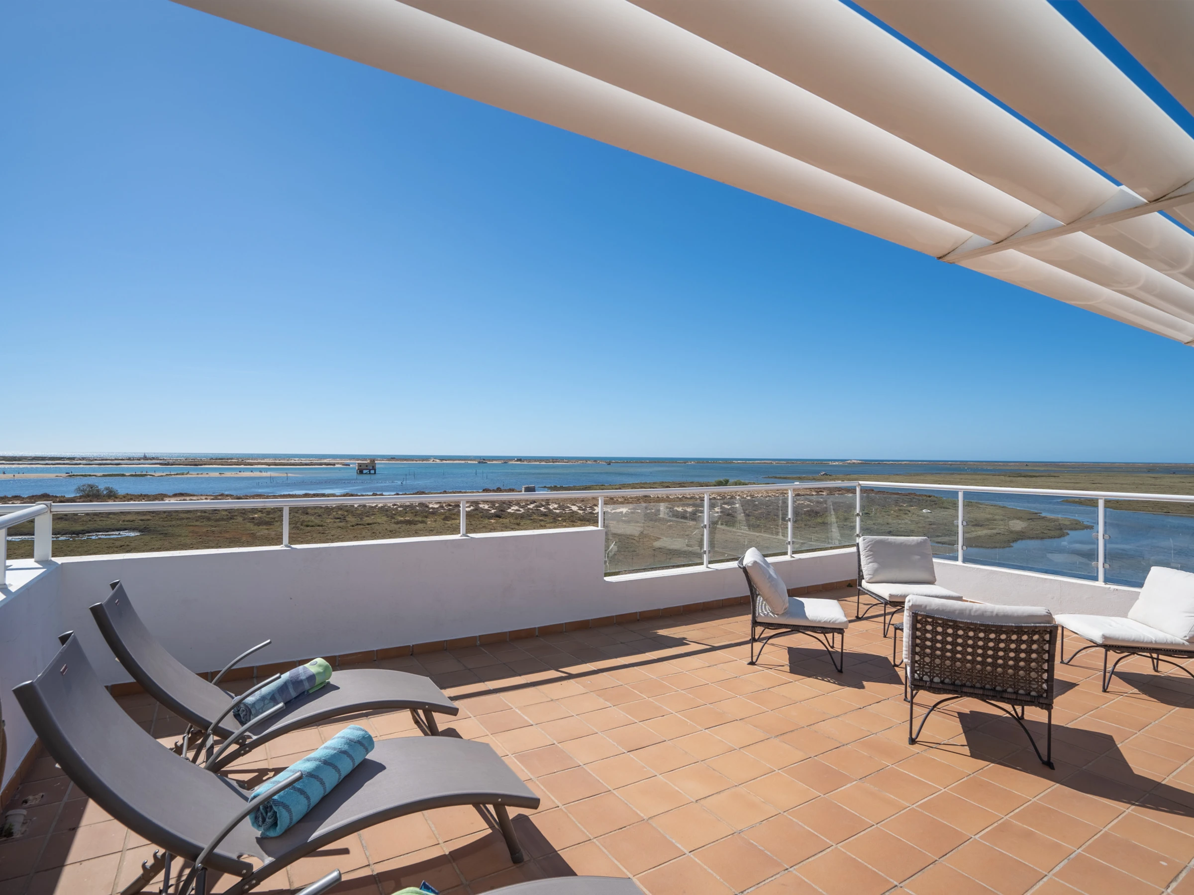 Disfrute de una hermosa terraza envolvente con vistas a la piscina, la Ria Formosa y el Océano Atlántico. Dos terrazas ofrecen opciones: relájese directamente fuera del salón con tumbonas, mesa de comedor y sillas, perfectas para comer al aire libre en cualquier momento del día, o suba por la escalera de caracol hasta la terraza superior para tomar el sol y disfrutar de las vistas más impresionantes. Los huéspedes tienen acceso a una piscina exclusiva para residentes, con tumbonas incluidas. Ya sea que esté disfrutando de un refrescante baño matutino o descansando después de un día en la playa, es un lugar encantador para relajarse y refrescarse.