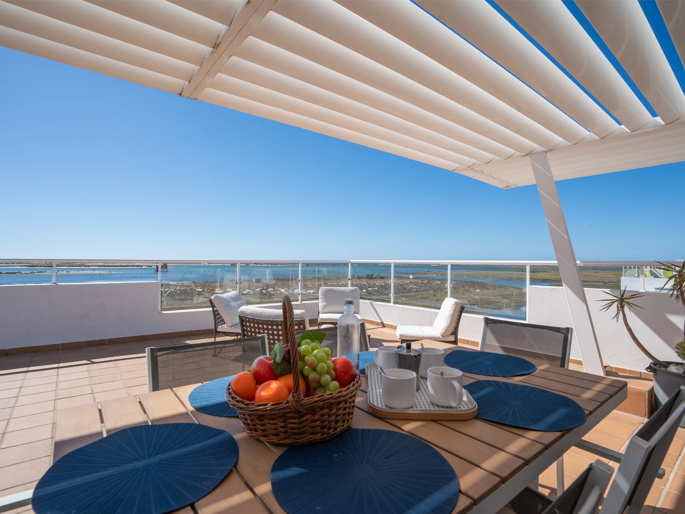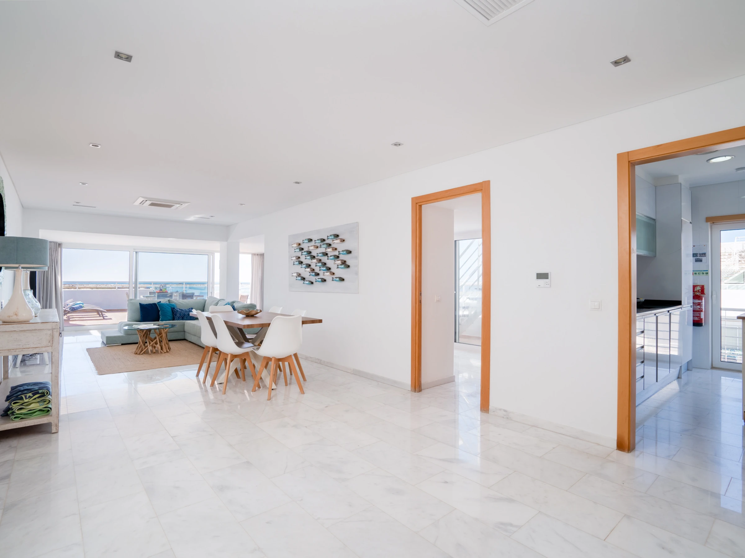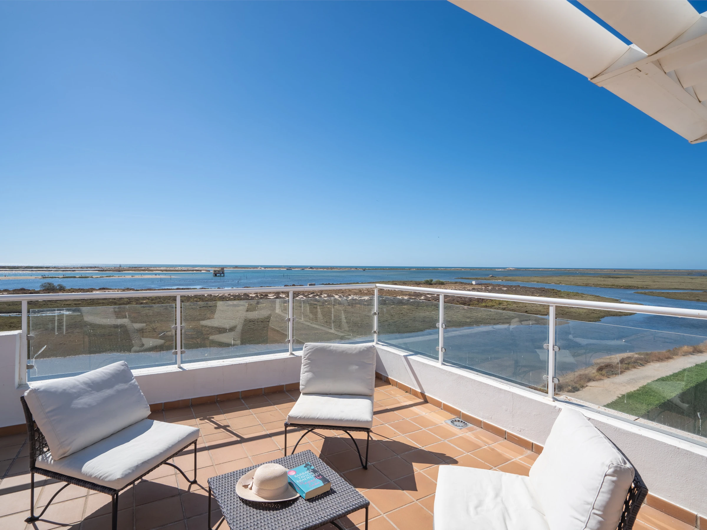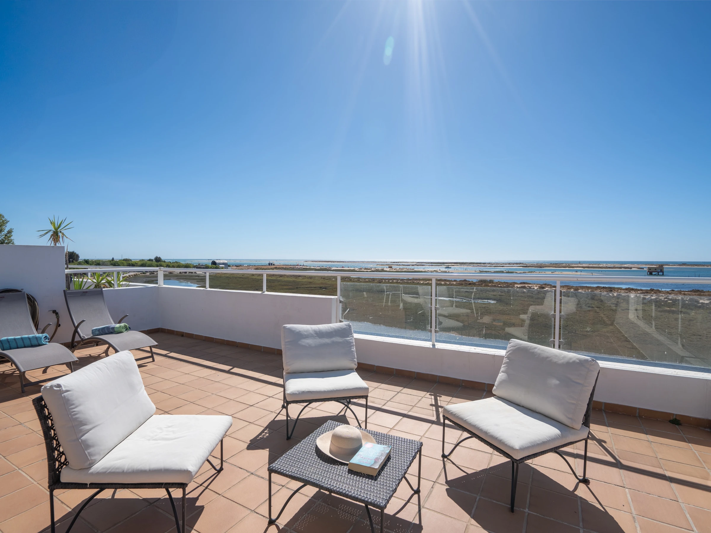 Disfrute de una hermosa terraza envolvente con vistas a la piscina, la Ria Formosa y el Océano Atlántico. Dos terrazas ofrecen opciones: relájese directamente fuera del salón con tumbonas, mesa de comedor y sillas, perfectas para comer al aire libre en cualquier momento del día, o suba por la escalera de caracol hasta la terraza superior para tomar el sol y disfrutar de las vistas más impresionantes. Los huéspedes tienen acceso a una piscina exclusiva para residentes, con tumbonas incluidas. Ya sea que esté disfrutando de un refrescante baño matutino o descansando después de un día en la playa, es un lugar encantador para relajarse y refrescarse.