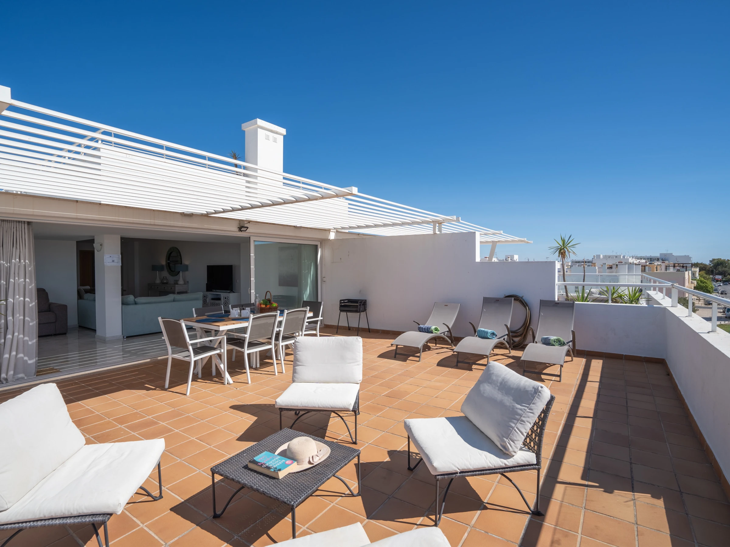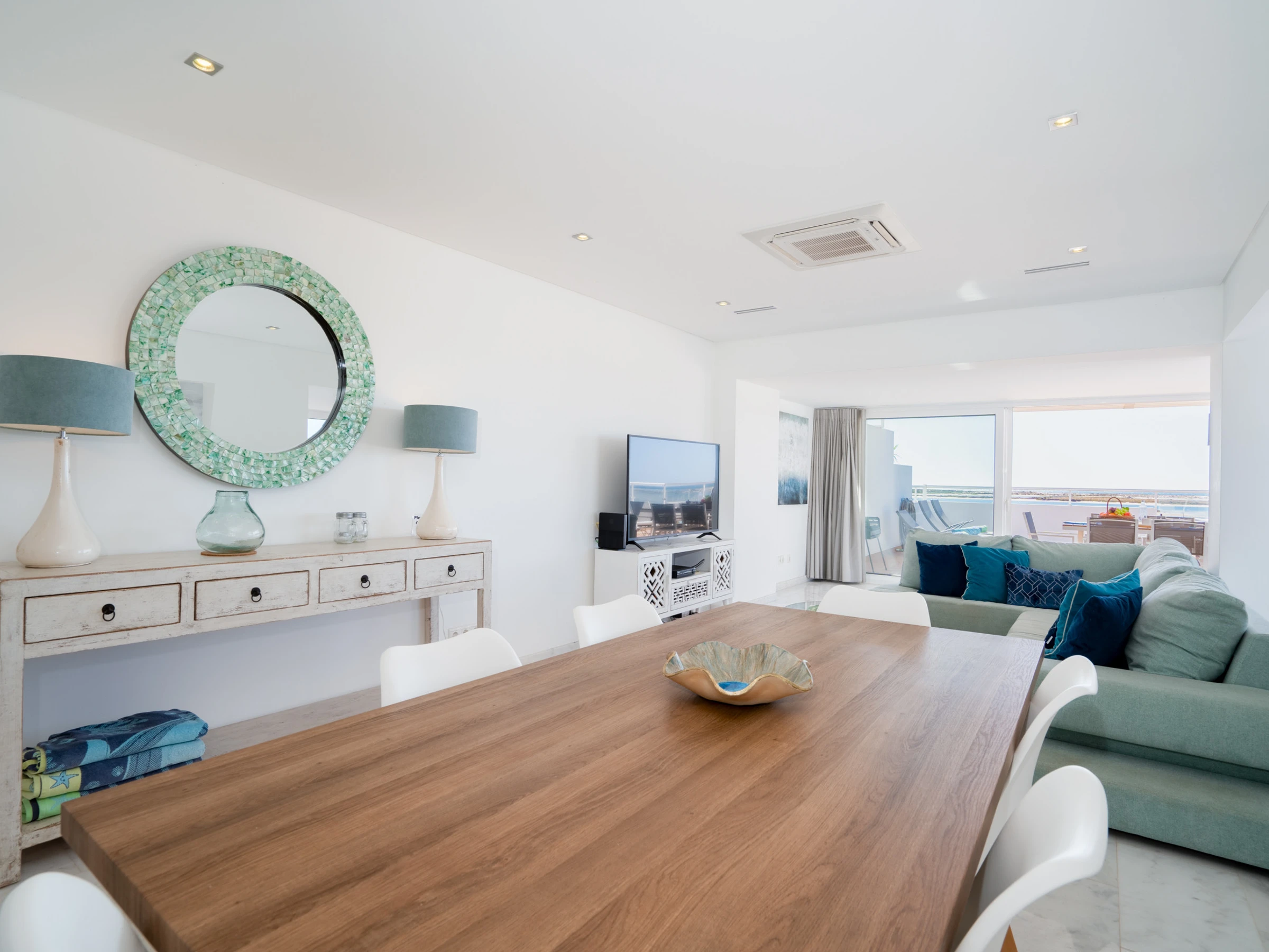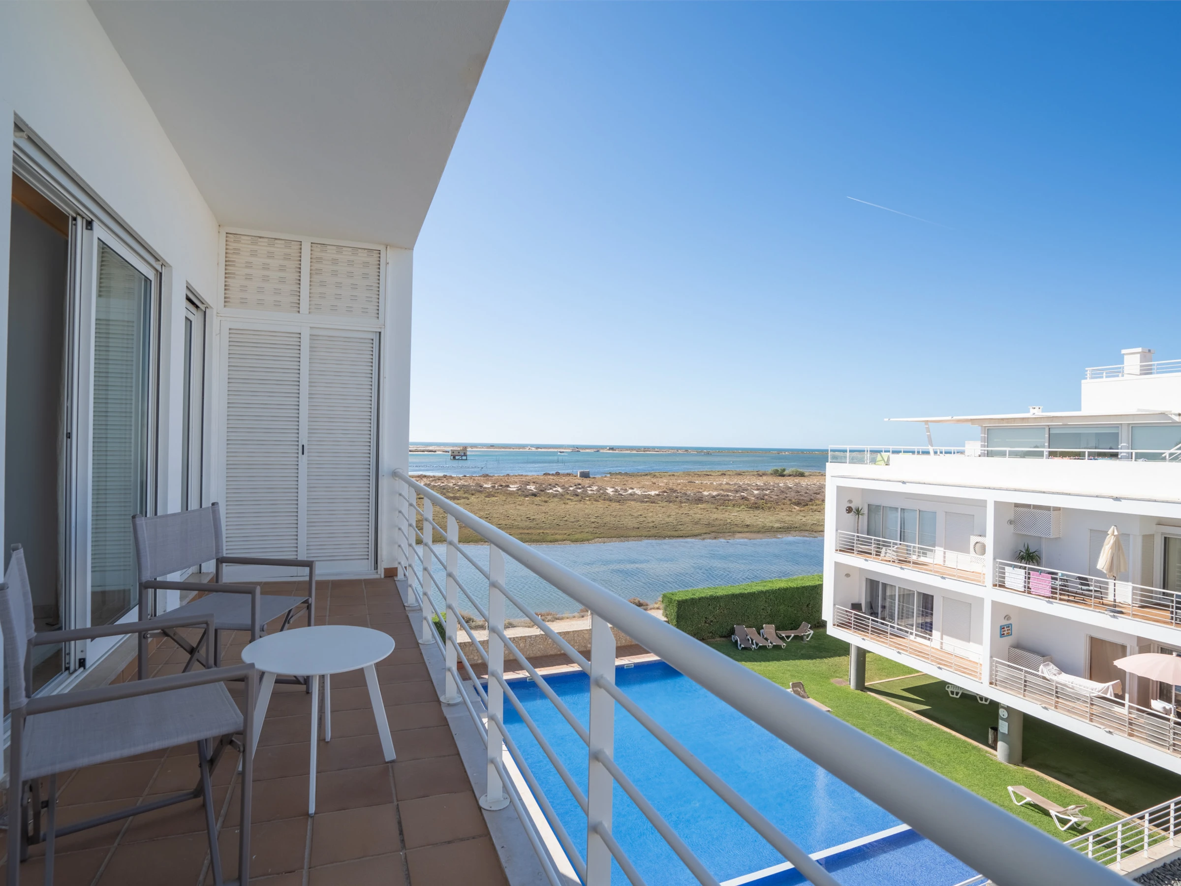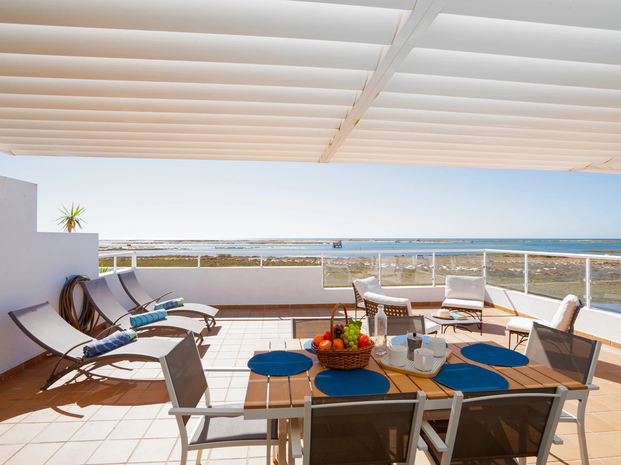 Disfrute de una hermosa terraza envolvente con vistas a la piscina, la Ria Formosa y el Océano Atlántico. Dos terrazas ofrecen opciones: relájese directamente fuera del salón con tumbonas, mesa de comedor y sillas, perfectas para comer al aire libre en cualquier momento del día, o suba por la escalera de caracol hasta la terraza superior para tomar el sol y disfrutar de las vistas más impresionantes. Los huéspedes tienen acceso a una piscina exclusiva para residentes, con tumbonas incluidas. Ya sea que esté disfrutando de un refrescante baño matutino o descansando después de un día en la playa, es un lugar encantador para relajarse y refrescarse.