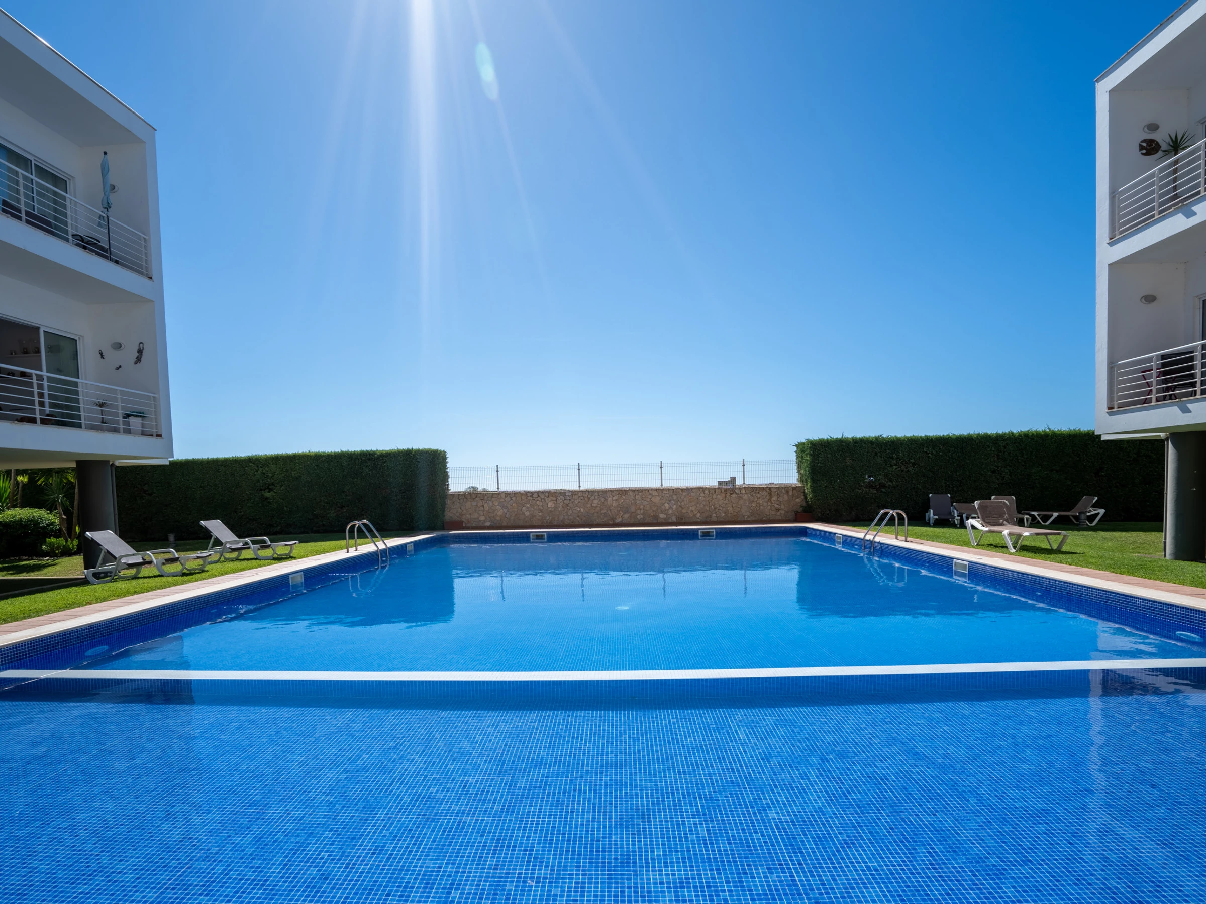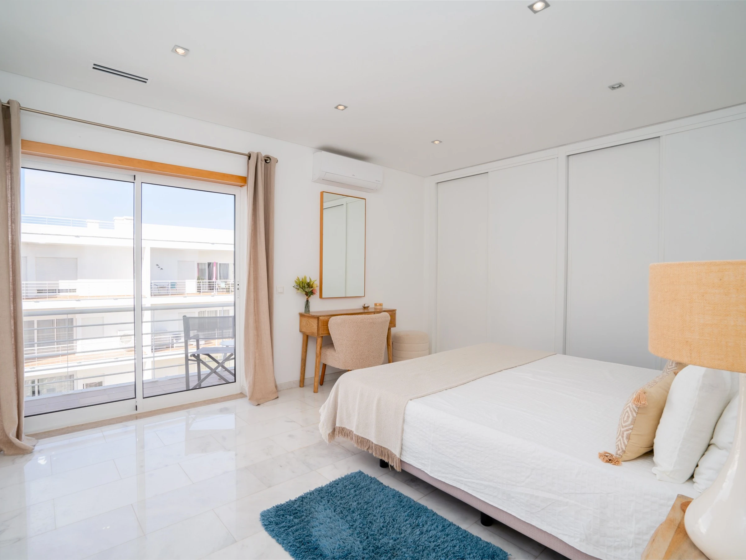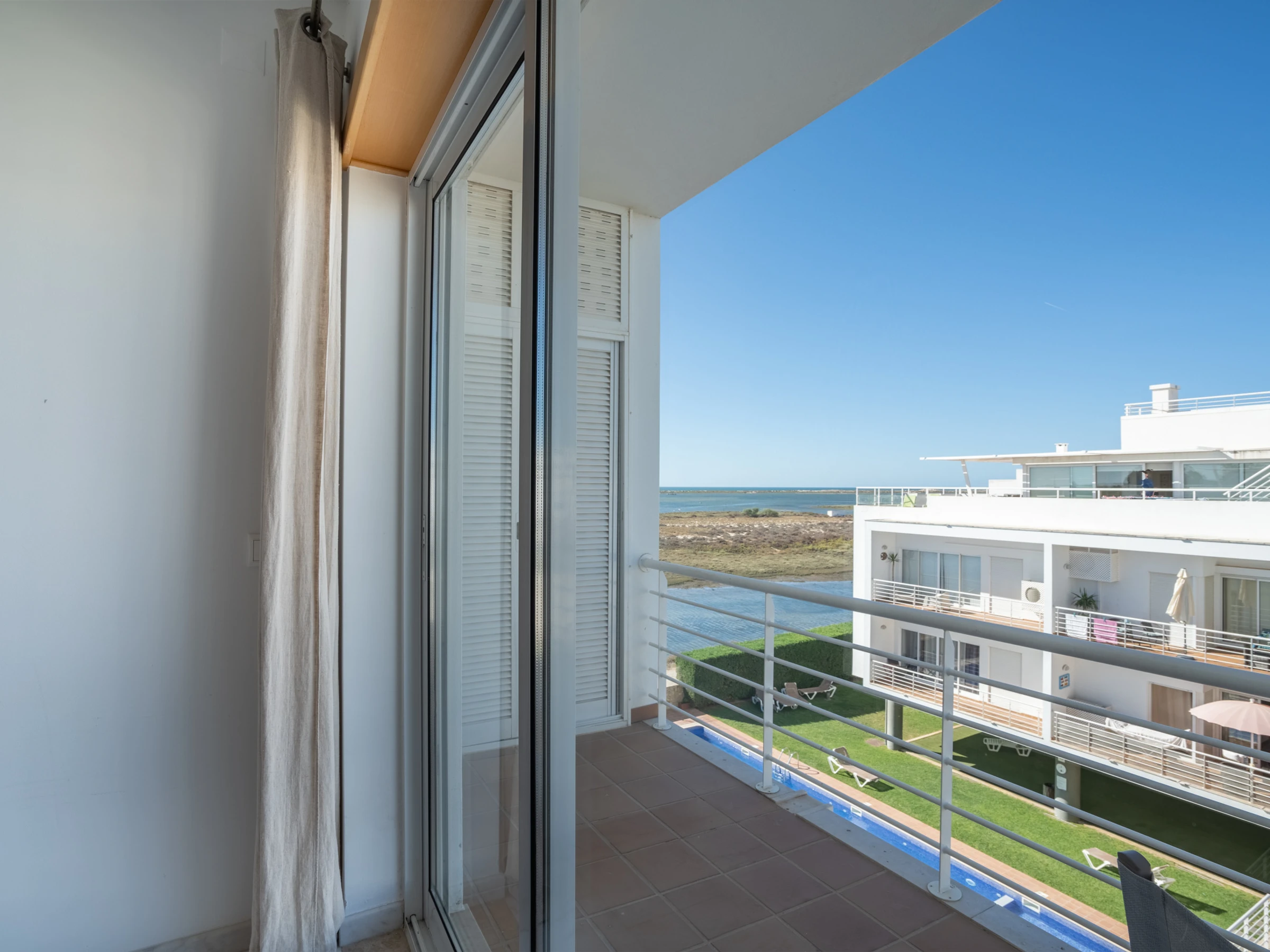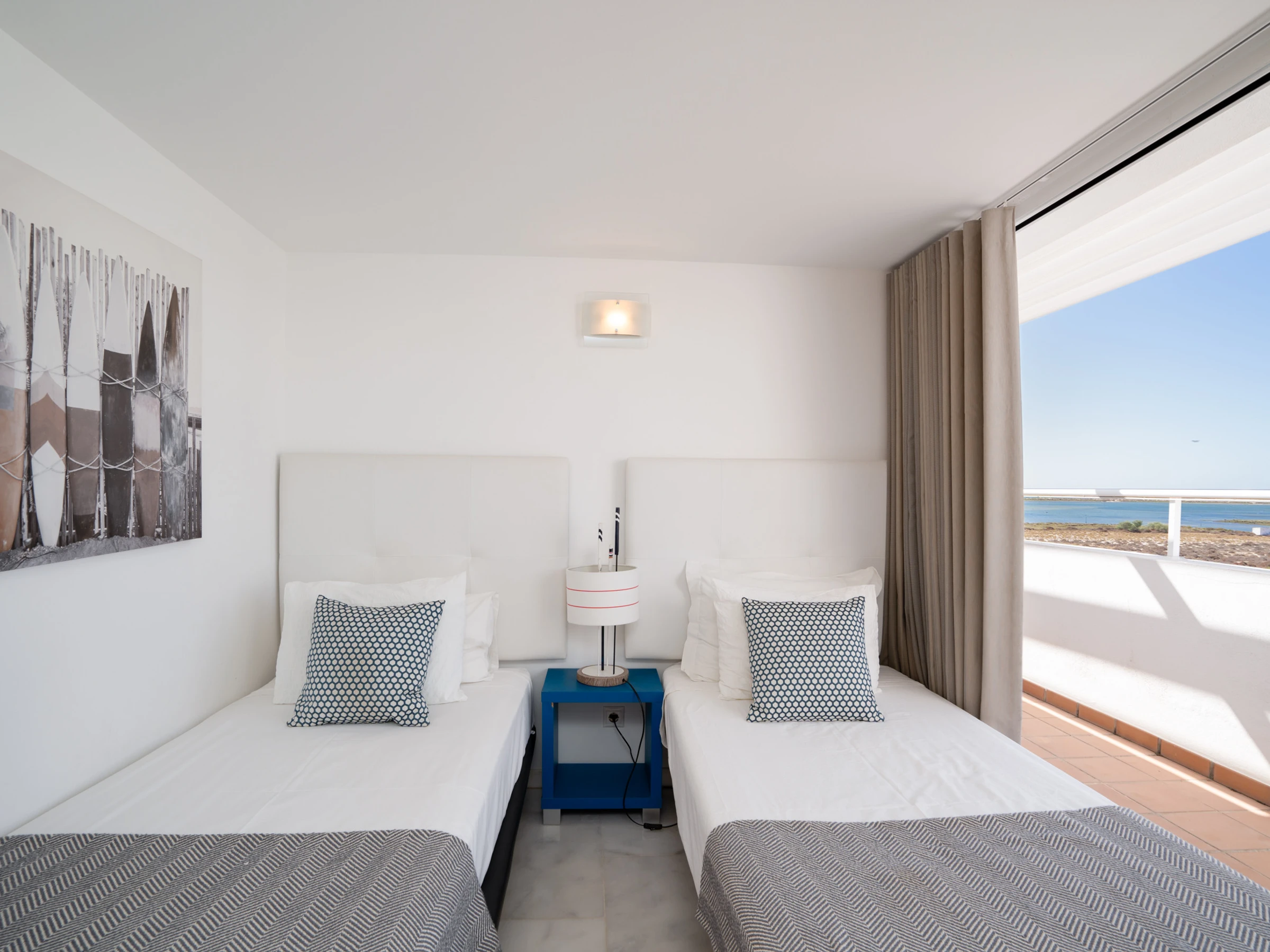 Disfrute de una hermosa terraza envolvente con vistas a la piscina, la Ria Formosa y el Océano Atlántico. Dos terrazas ofrecen opciones: relájese directamente fuera del salón con tumbonas, mesa de comedor y sillas, perfectas para comer al aire libre en cualquier momento del día, o suba por la escalera de caracol hasta la terraza superior para tomar el sol y disfrutar de las vistas más impresionantes. Los huéspedes tienen acceso a una piscina exclusiva para residentes, con tumbonas incluidas. Ya sea que esté disfrutando de un refrescante baño matutino o descansando después de un día en la playa, es un lugar encantador para relajarse y refrescarse.