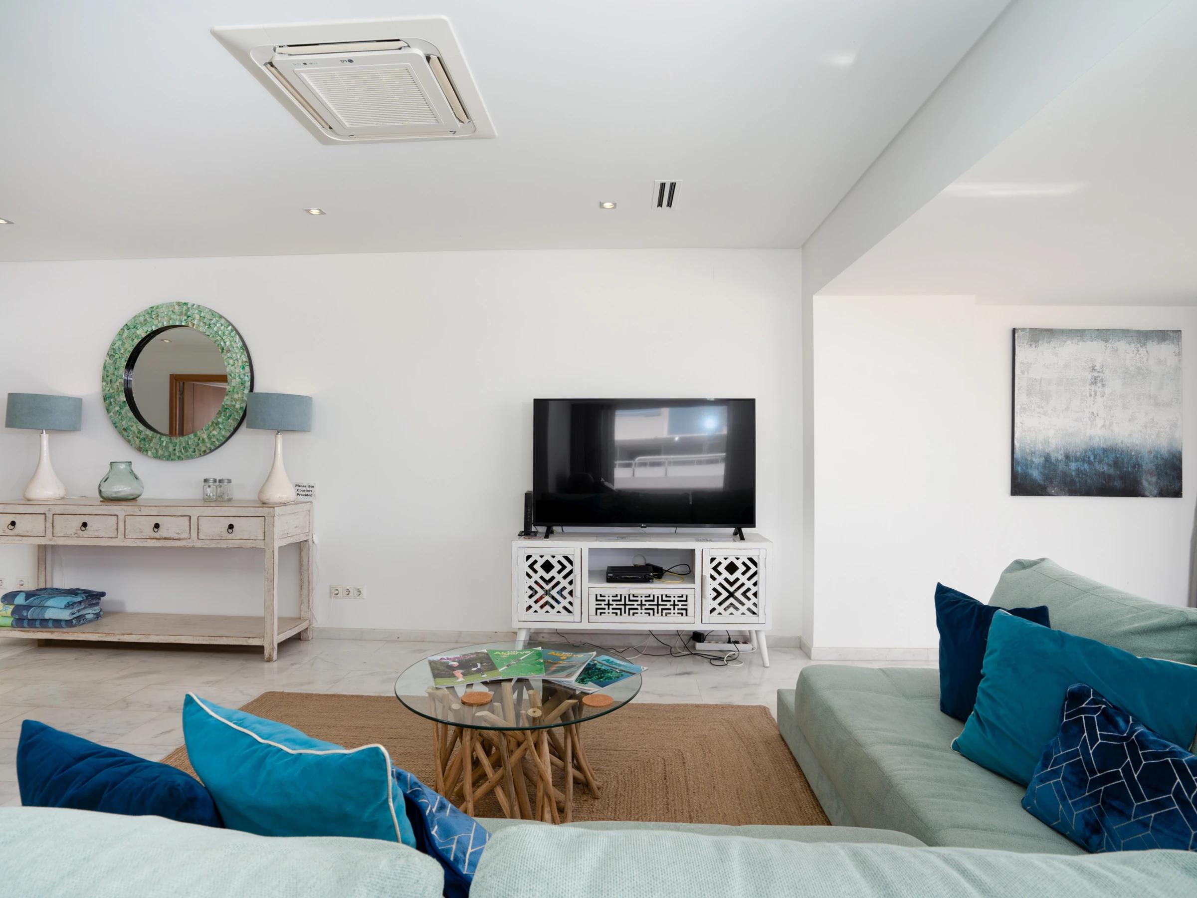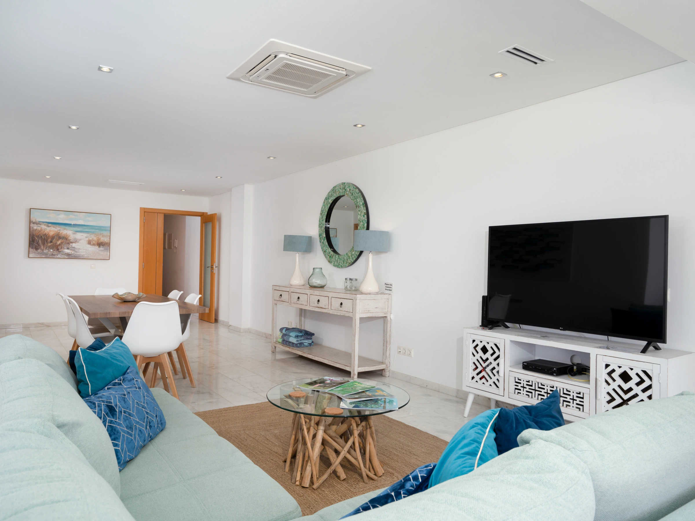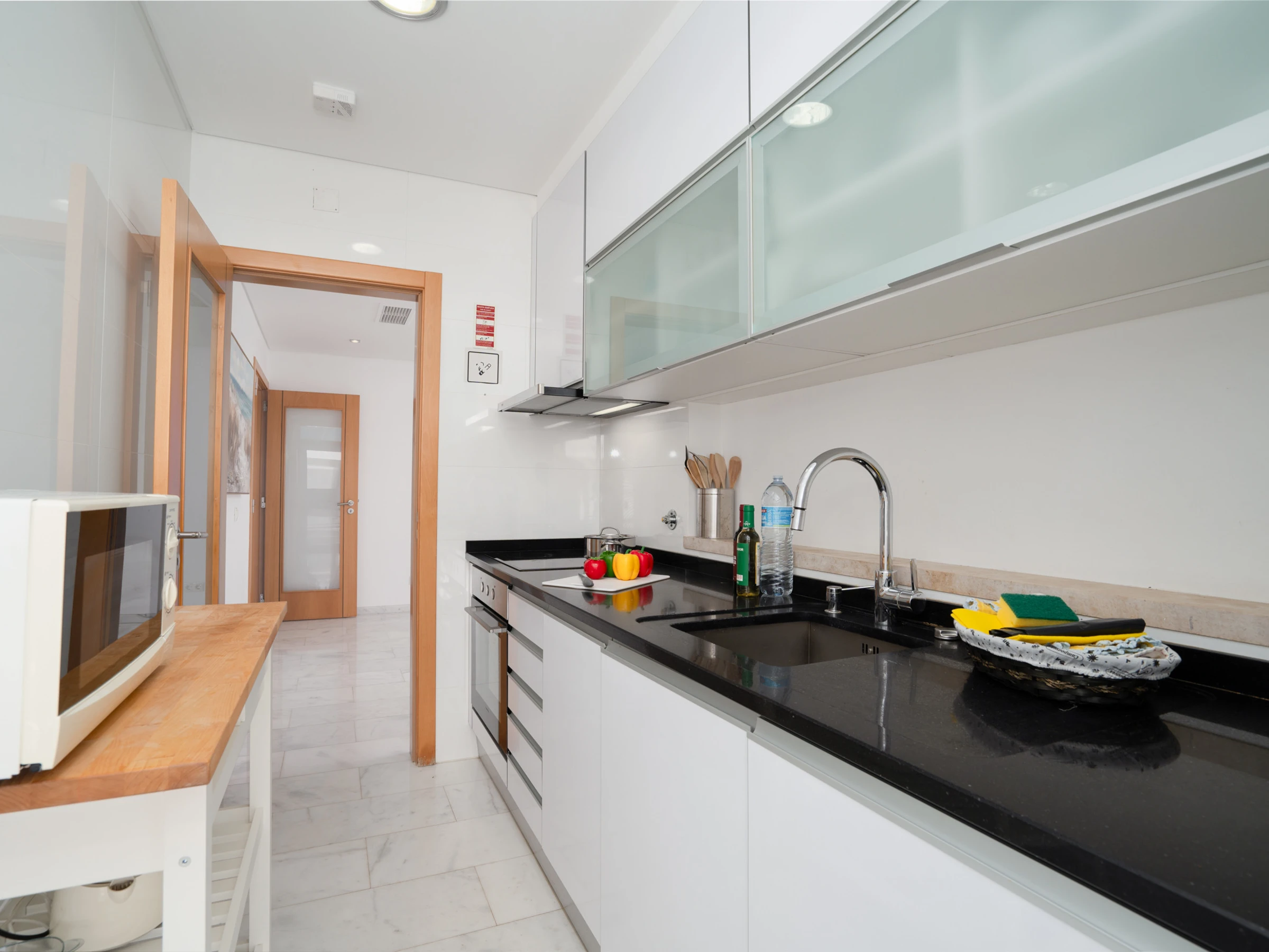 Acceda a un espacio diáfano y luminoso desde la entrada, con una amplia zona de comedor que cuenta con una mesa de madera, sofás cómodos, televisión de pared y Wi-Fi. La cocina totalmente equipada tipo galera facilita la preparación de comidas. El apartamento tiene 2 dormitorios: un dormitorio con cama king-size y baño en suite, y una habitación con dos camas con un baño separado. Armarios empotrados y aire acondicionado en toda la vivienda garantizan el confort.