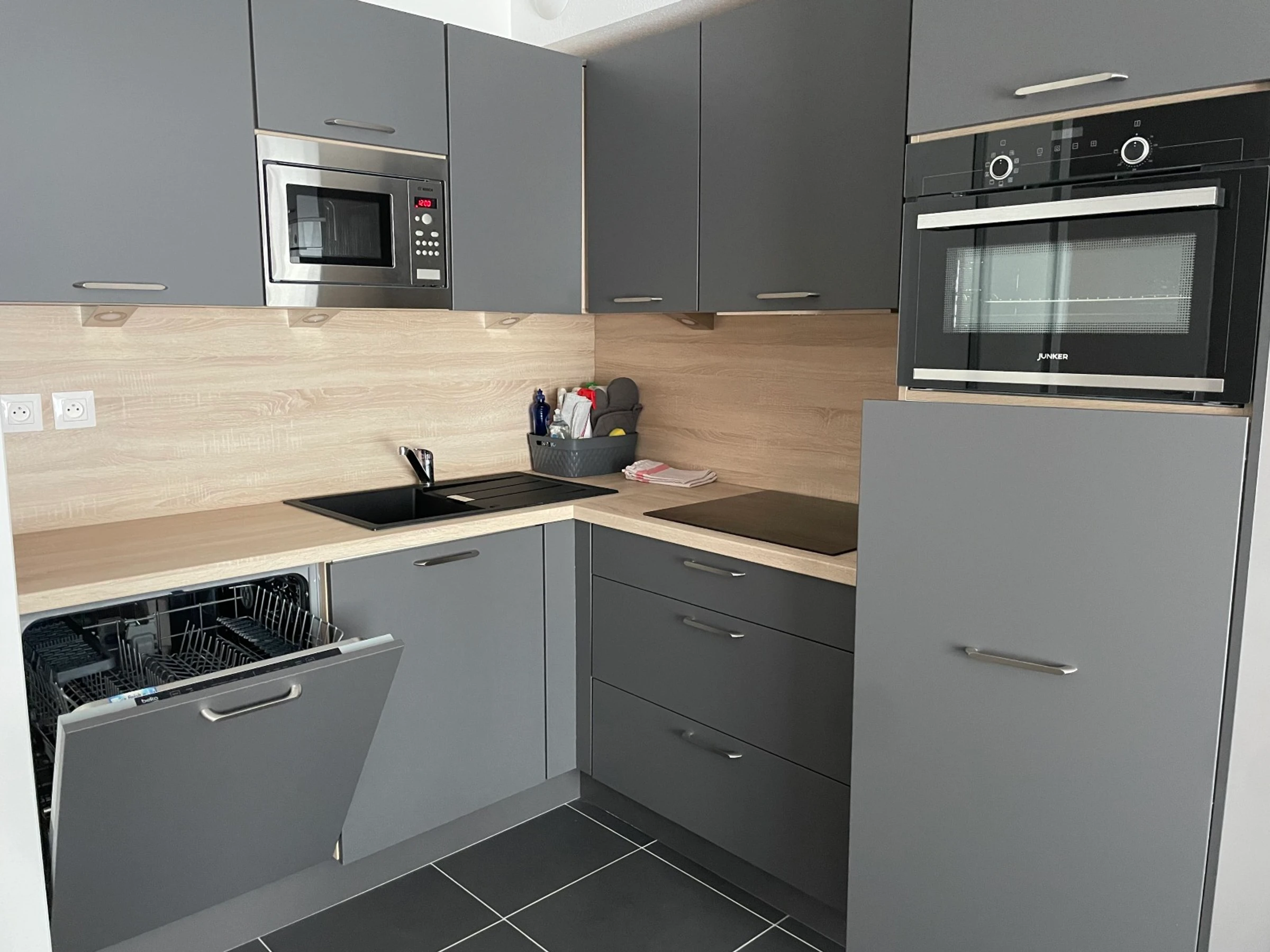 Cocina americana: frigorífico con congelador, placa vitrocerámica de 4 fuegos, horno, microondas, lavavajillas, cafetera de filtro, tostadora, hervidor, robot de cocina.