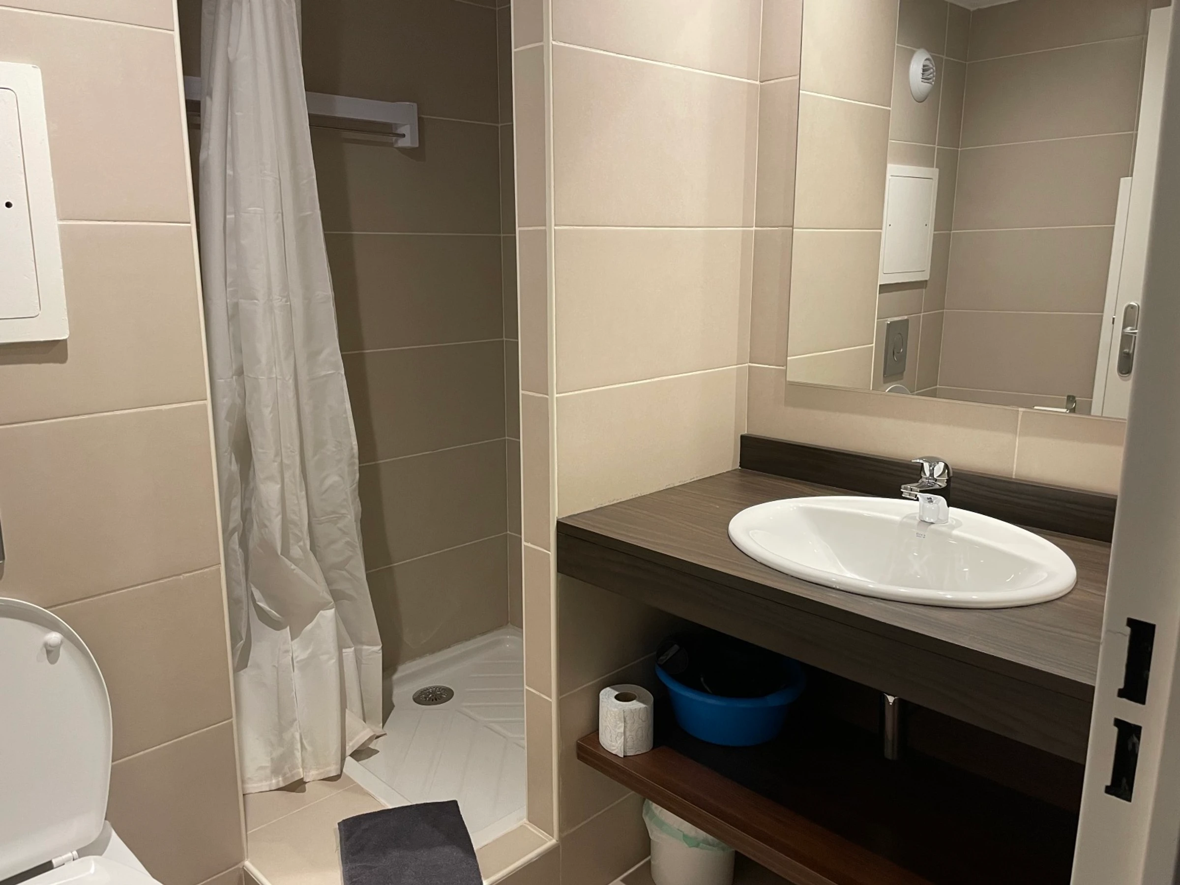 Cuarto de baño: lavabo, ducha, WC y secador de pelo.
