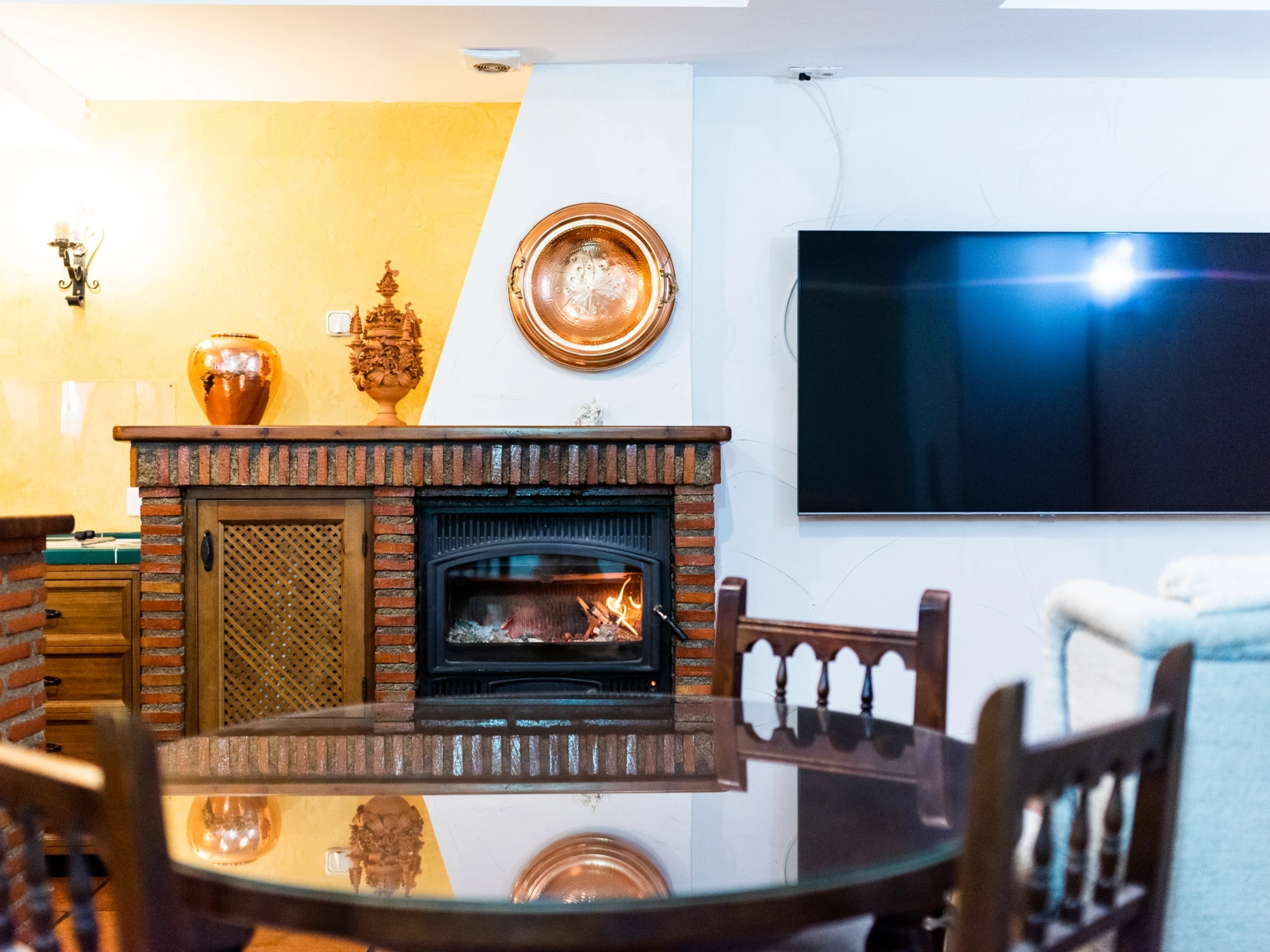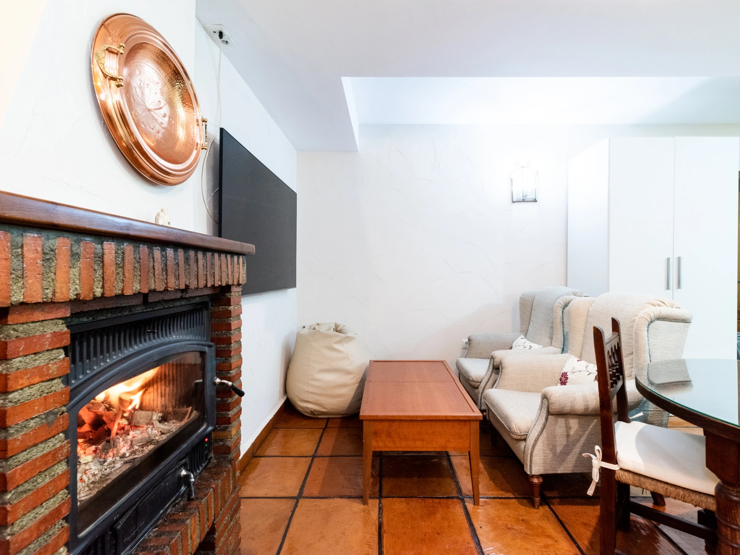En temporada de otoño-invierno, la chimenea está disponible para una experiencia singular, aunque no es necesaria para climatización. Se entrega con leña lista para encender. Costo: 8€ por saco de leña. Comunicar al menos 24 horas antes del check-in.
