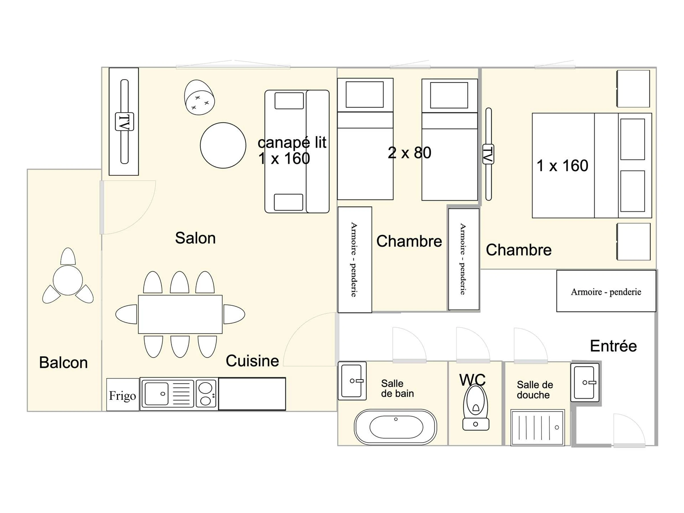 El apartamento cuenta con cocina totalmente equipada, salón con sofá cama de 160 cm, un dormitorio con dos camas de 80 cm, un segundo dormitorio con dos camas de 80 cm, baño, aseo con ducha y aseo independiente.