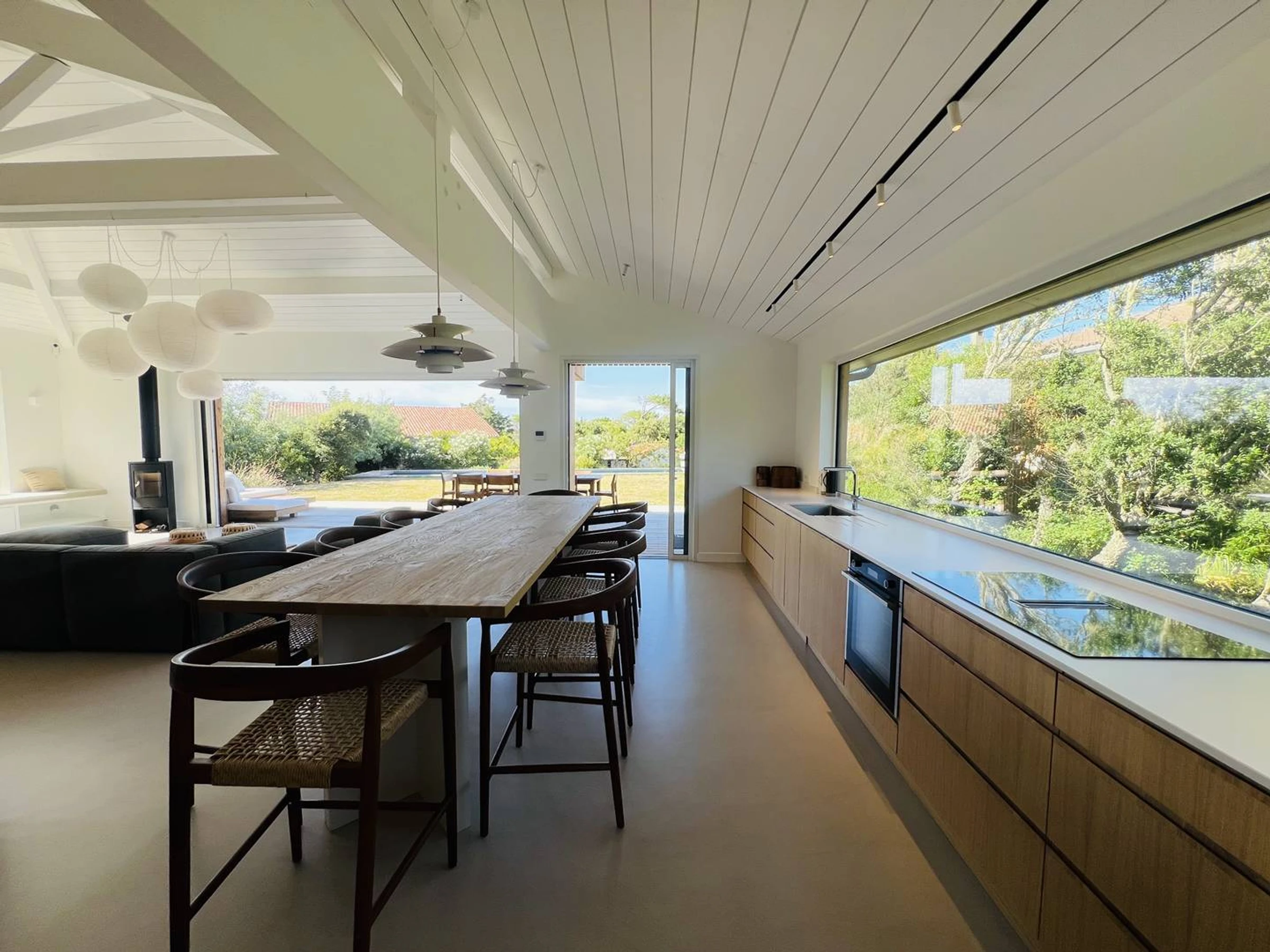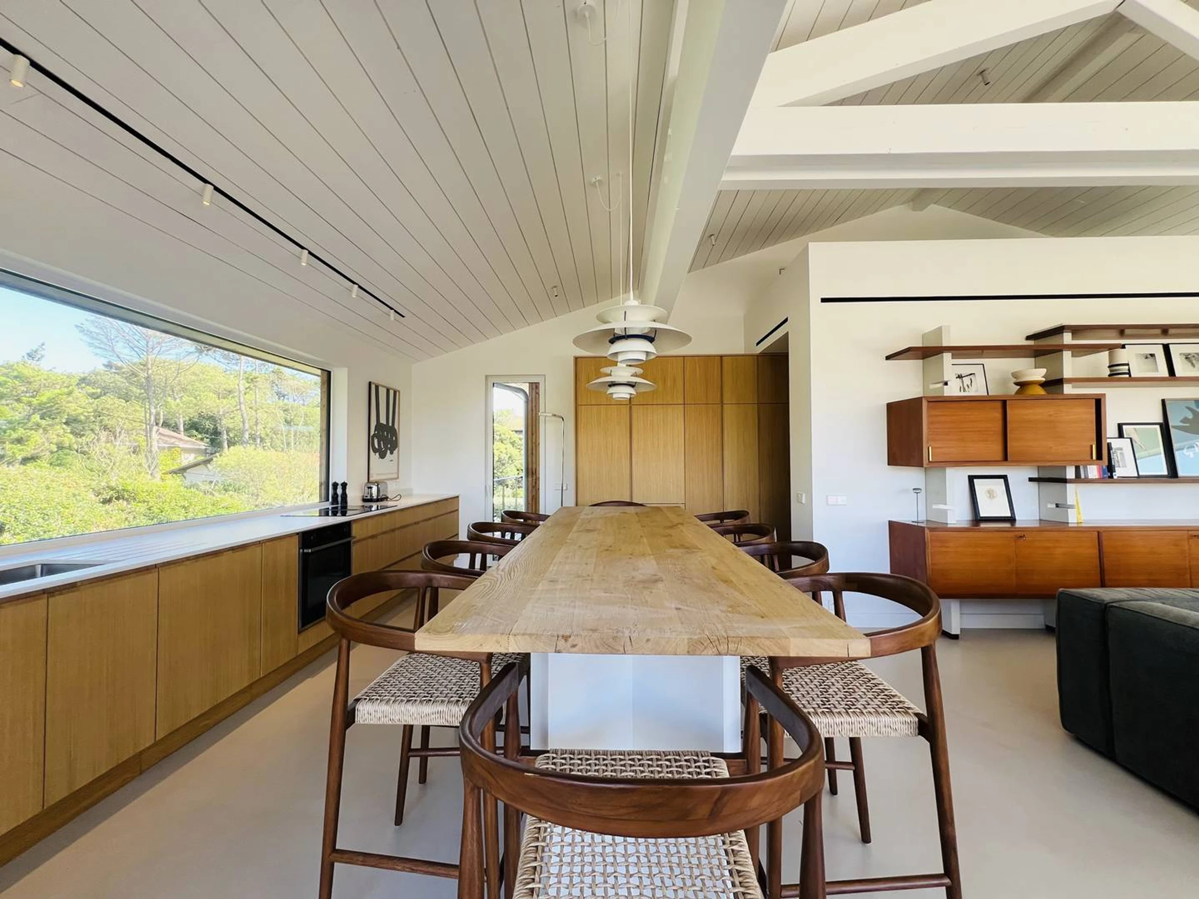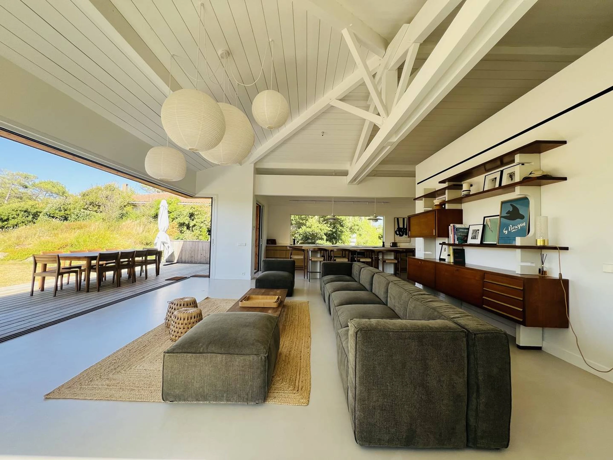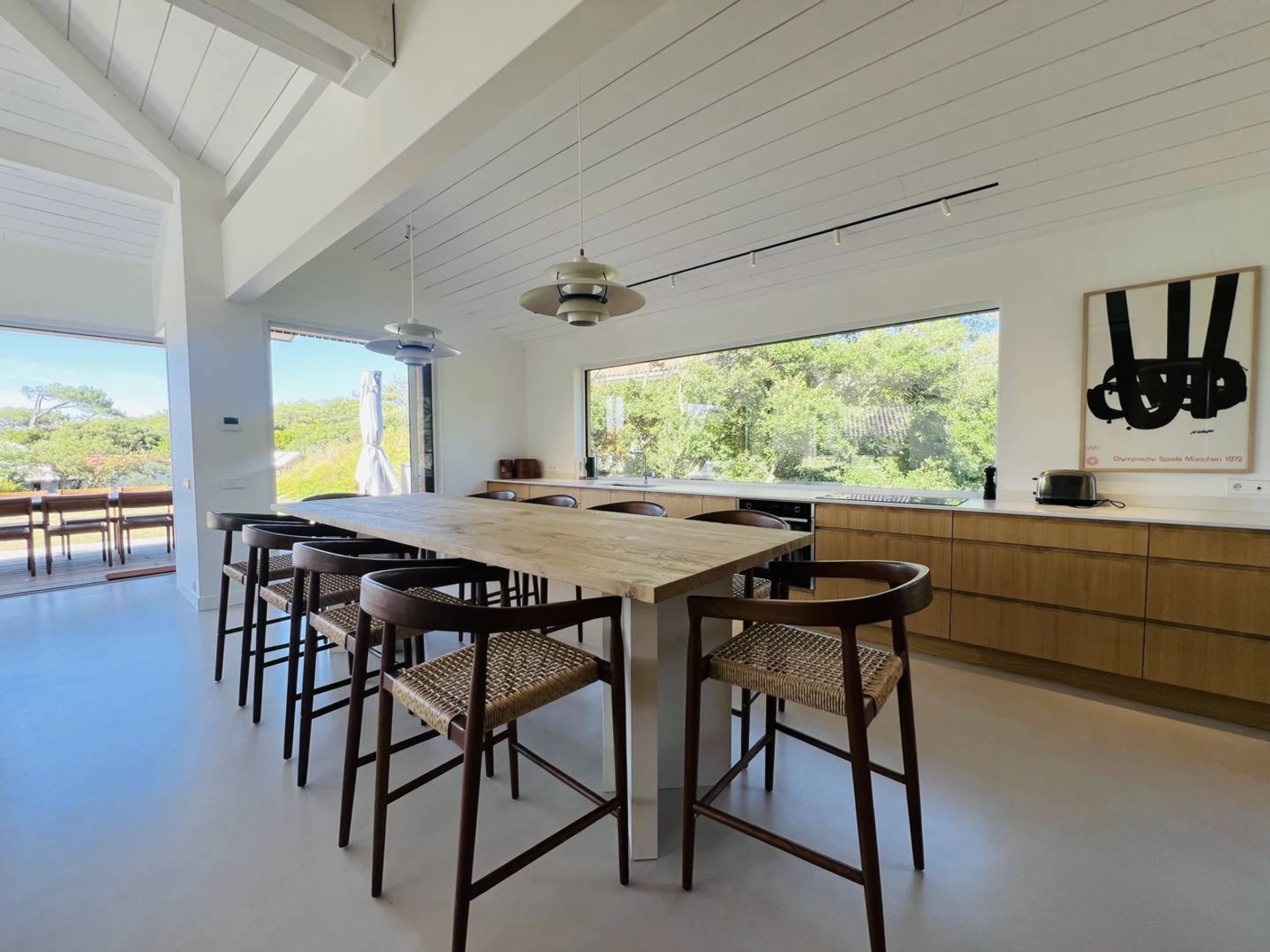 La Villa ofrece 195 m2 de generoso espacio interior, amueblado en tonos claros y oscuros para crear una atmósfera elegante y muy relajada, reflejando la costa sur de las Landas.