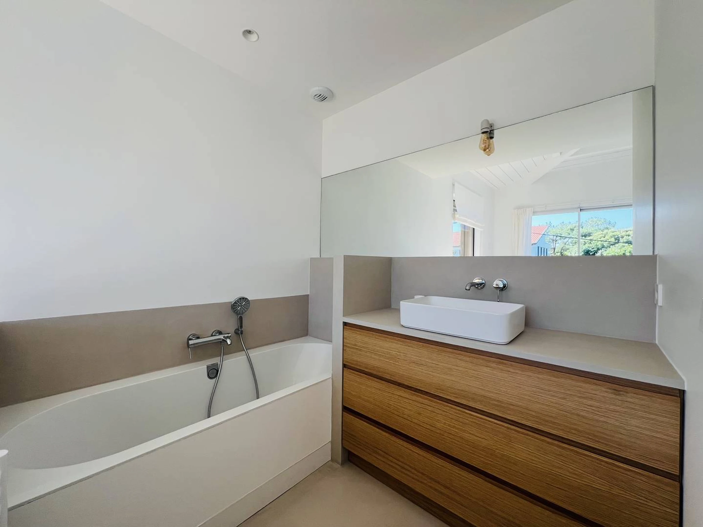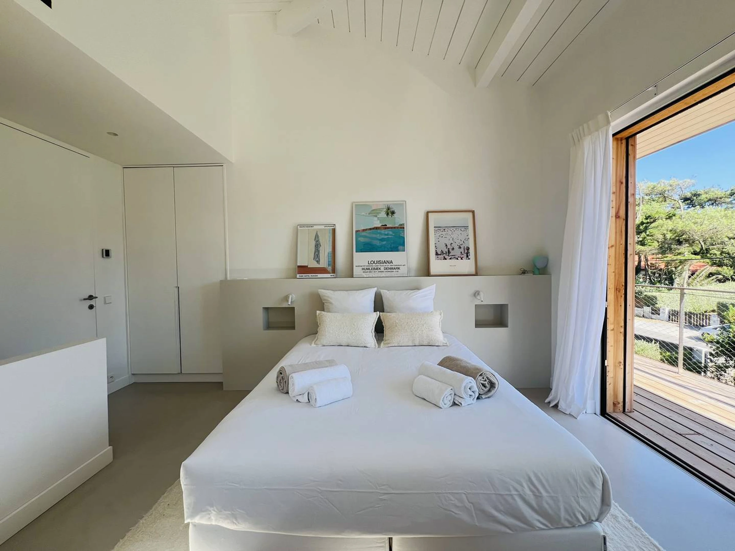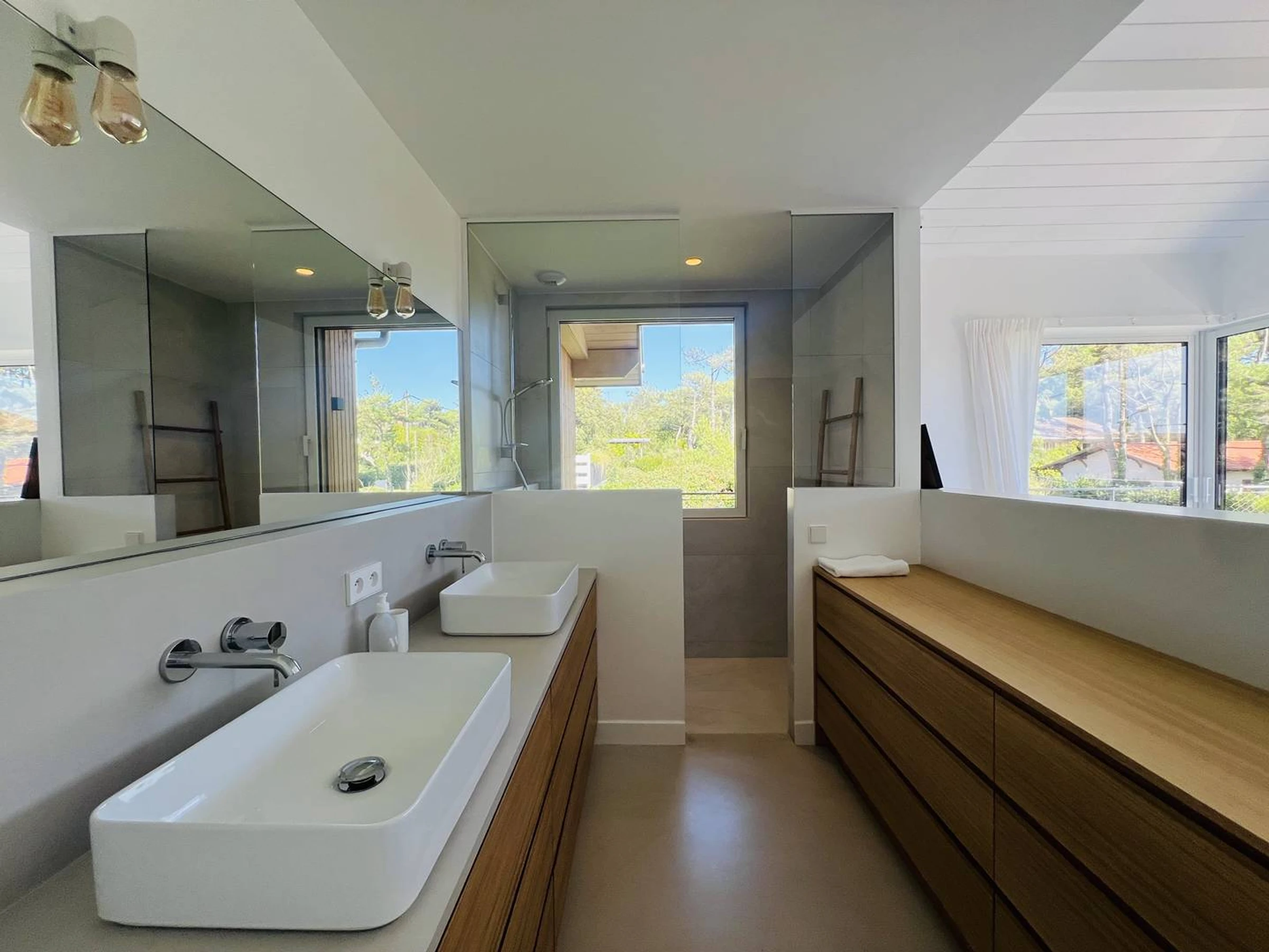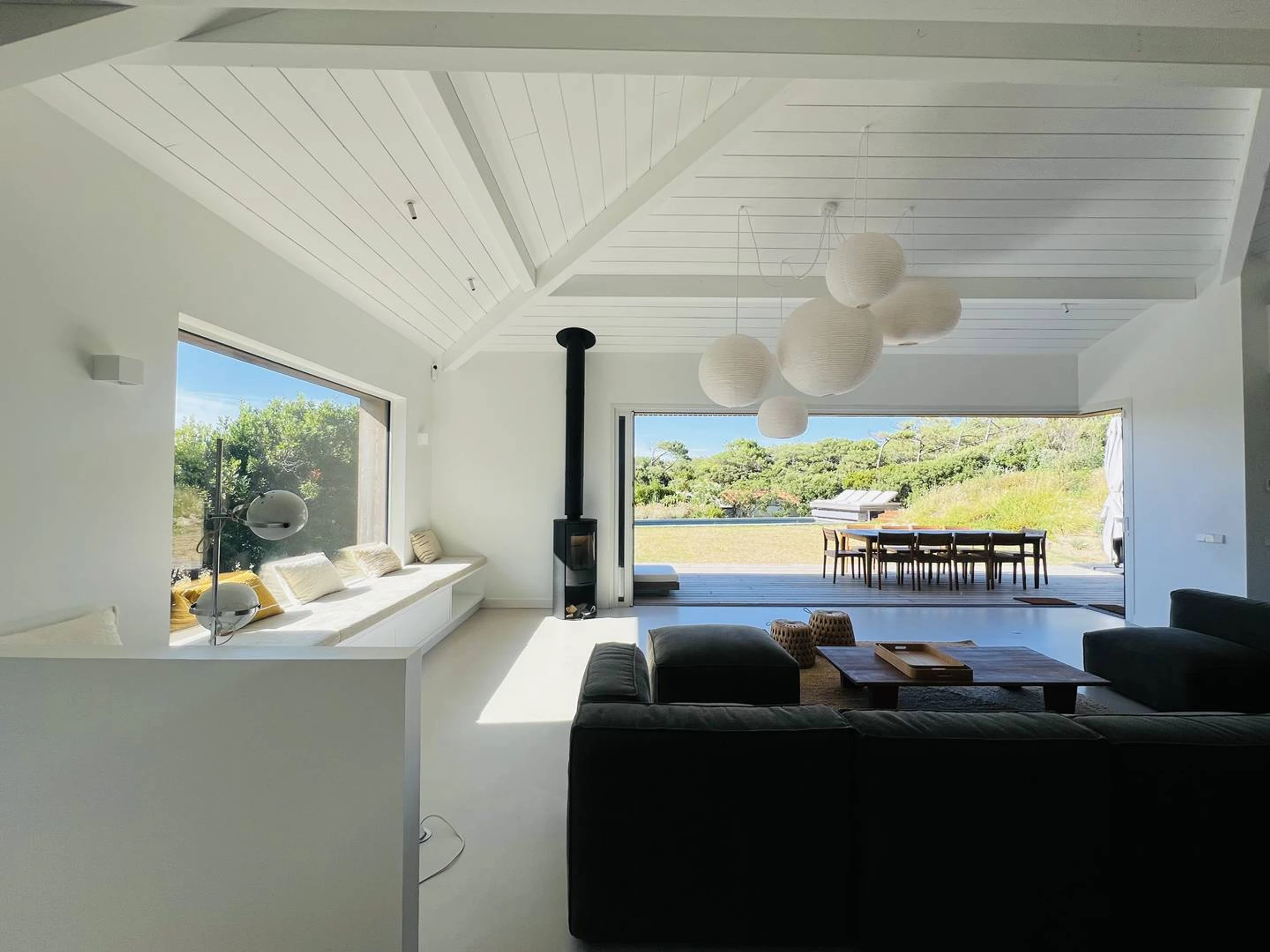 La Villa ofrece 195 m2 de generoso espacio interior, amueblado en tonos claros y oscuros para crear una atmósfera elegante y muy relajada, reflejando la costa sur de las Landas.