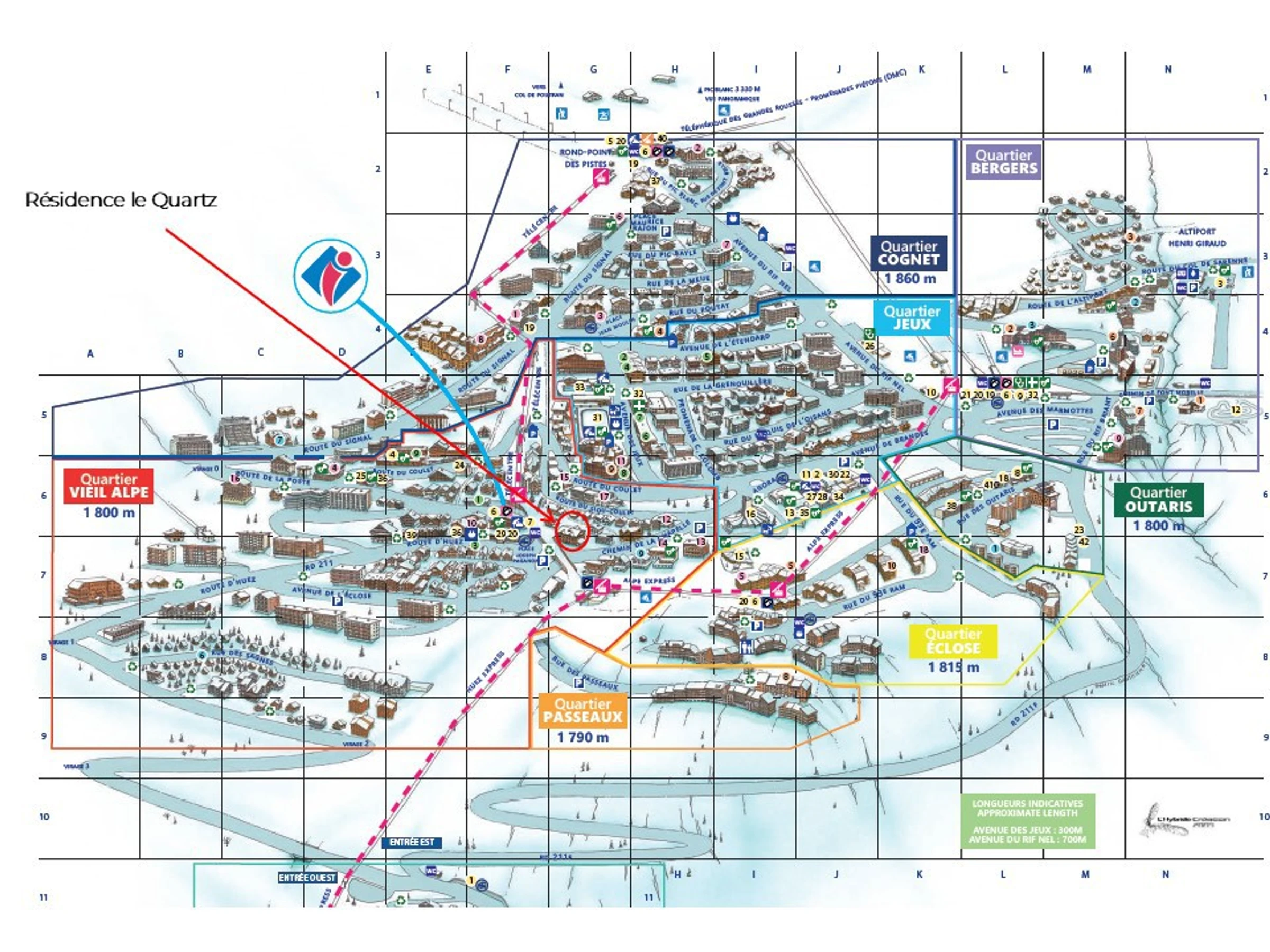 Le Quartz es una nueva residencia situada en el corazón de Alpe d'Huez, en el distrito de Vieil Alpe, que ofrece todos los servicios (telecabina, FSE, oficina de turismo, polideportivo con piscina, gimnasio, cine), así como tiendas y restaurantes.