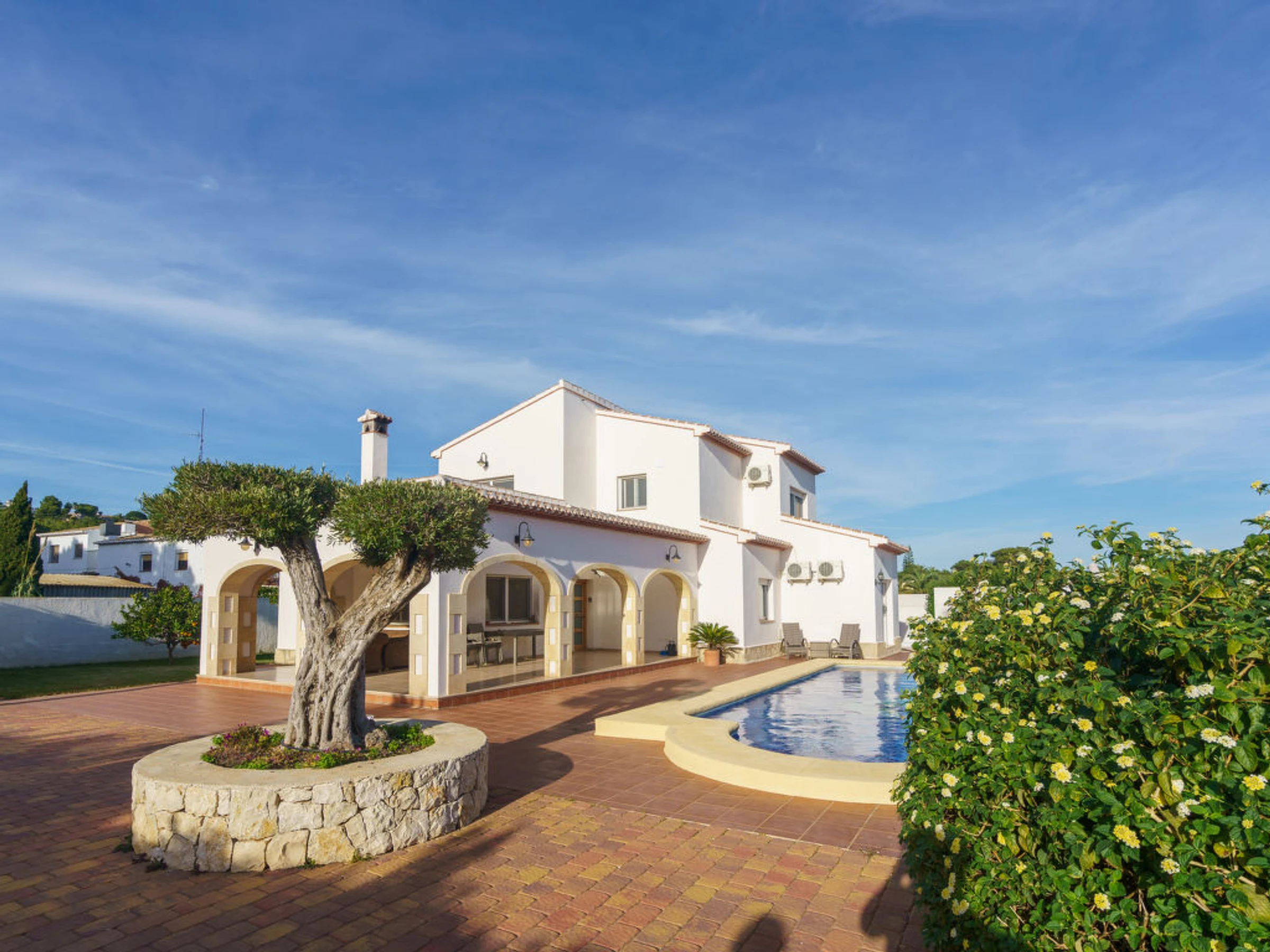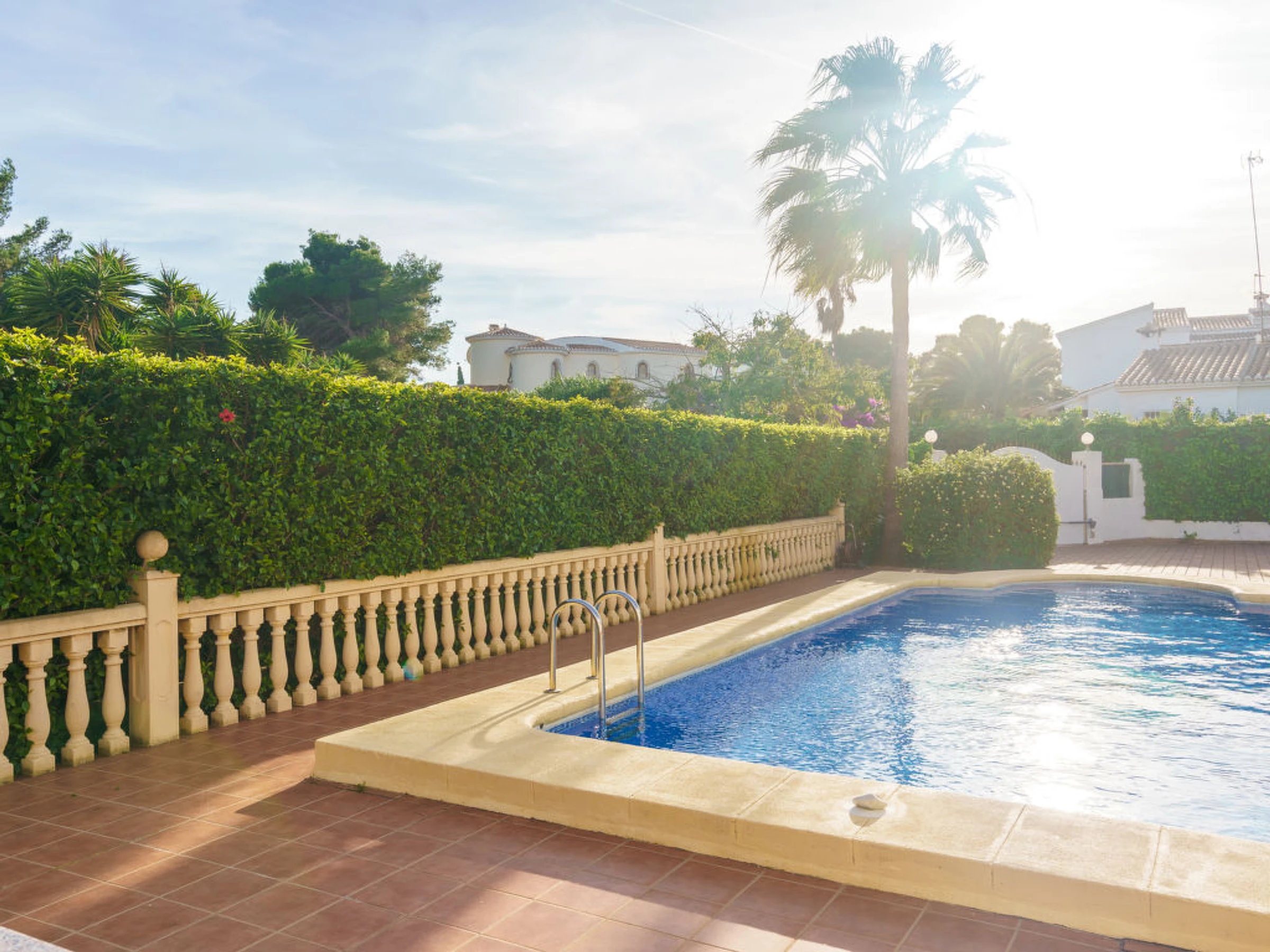 Casa unifamiliar "La Siesta", bonita de 2 plantas. En el barrio de La Siesta, lugar tranquilo, soleado en un barrio residencial, a 5 km del mar, en una calle sin salida. Privado: jardín 1'000 m2 (vallado), piscina (4 x 9 m, 01.01.-31.12.) con escalera interior. Ducha exterior. En el inmueble: calefacción central. Aparcamiento (cubierto). Supermercado, restaurante 150 m, playa de arena "Arenal" 7 km playa de gravilla "Granadella" 5 km. Tenis 150 m.