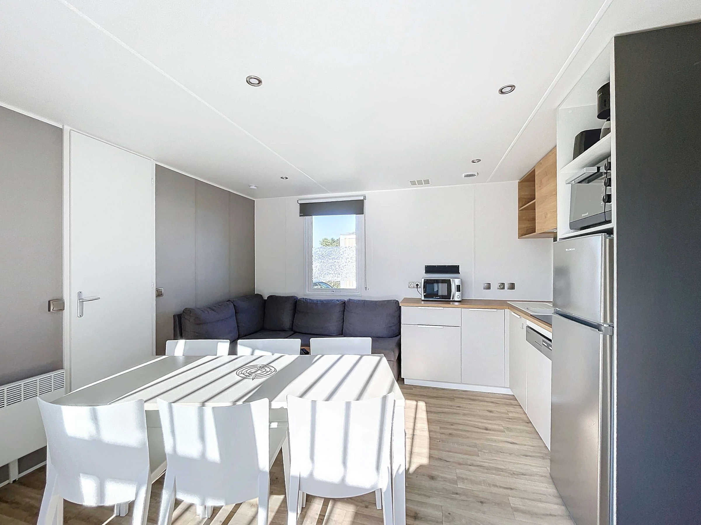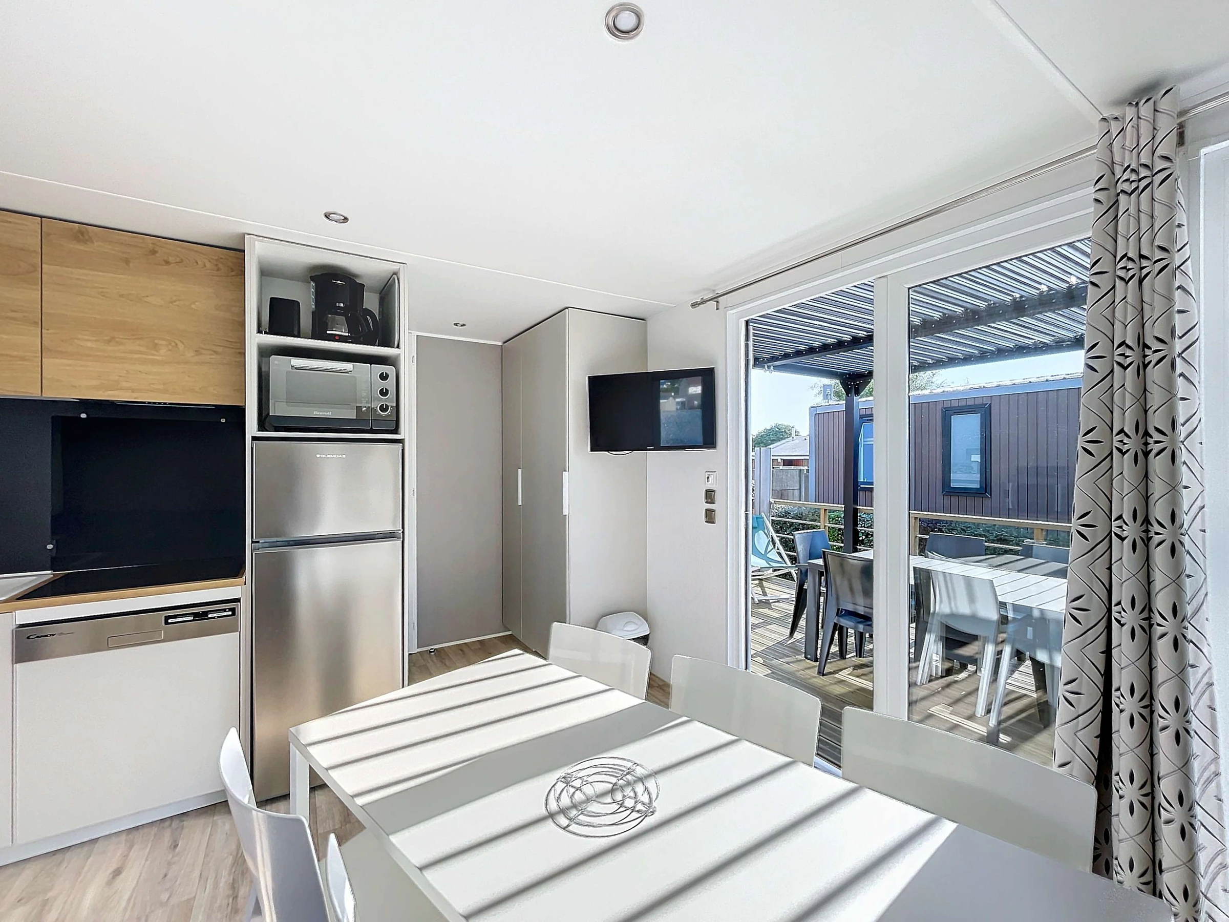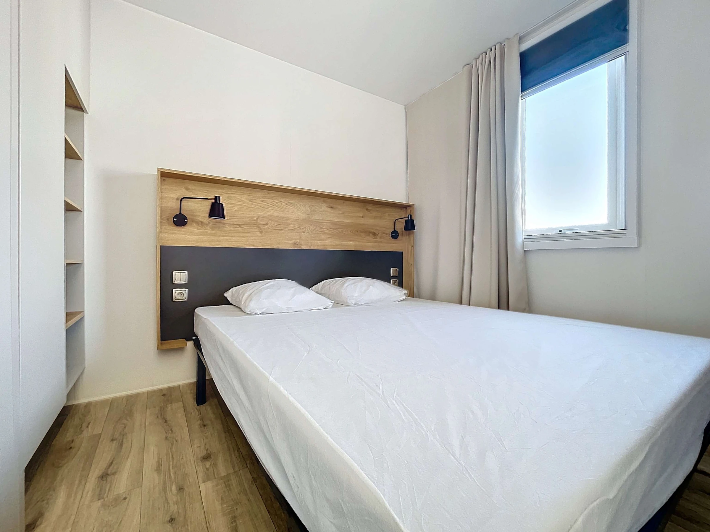 Déjate seducir por este mobile-home de 35 m² compuesto por un salón con zona de cocina amueblada y equipada, un salón con sofá y TV, un dormitorio principal con cama de matrimonio (160x200), un segundo dormitorio con dos camas individuales (90). , y un tercer dormitorio con dos literas (90), un baño y un aseo independiente. Está equipado con una gran terraza de madera equipada donde se puede comer al aire libre o tomar el sol en las tumbonas. Hay una plaza de aparcamiento disponible en la parcela, sólo para un único vehículo.