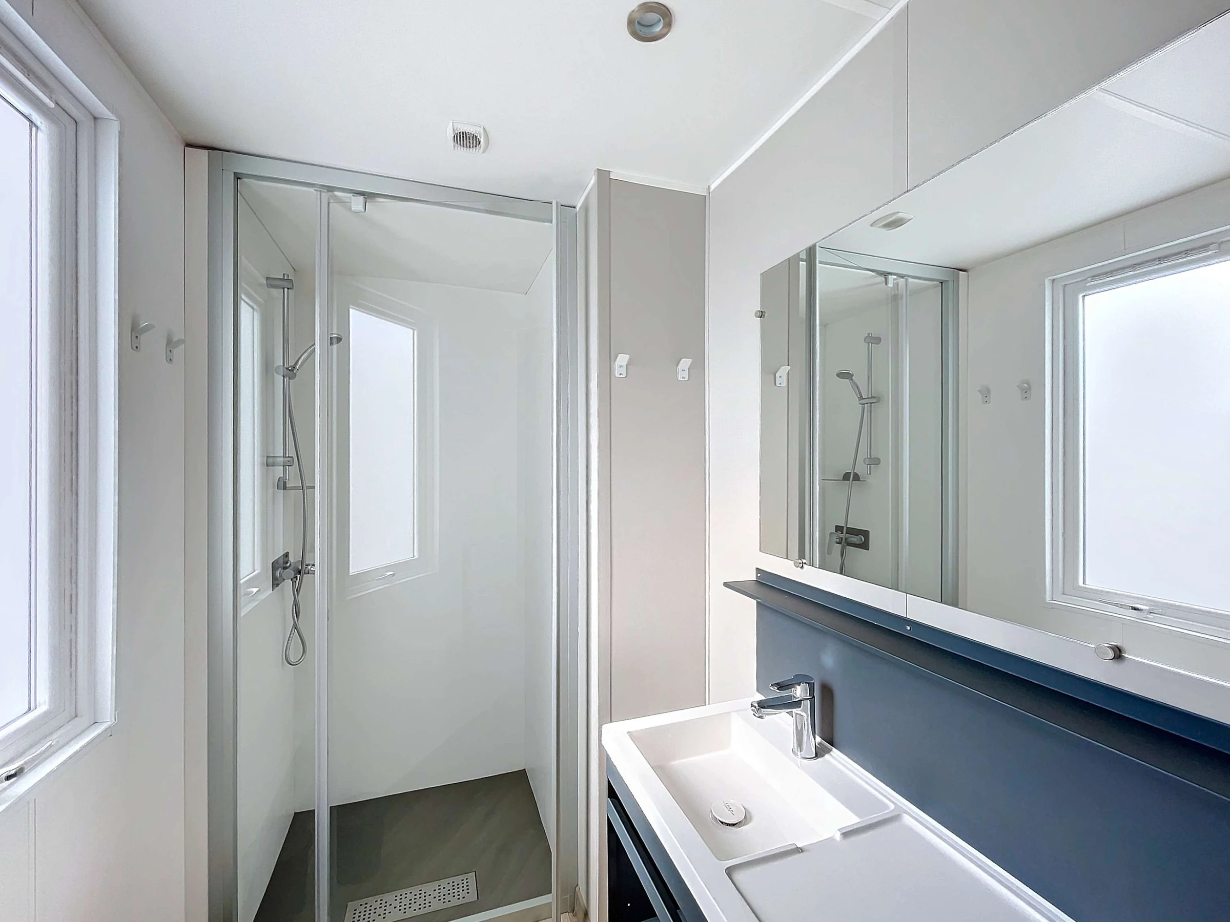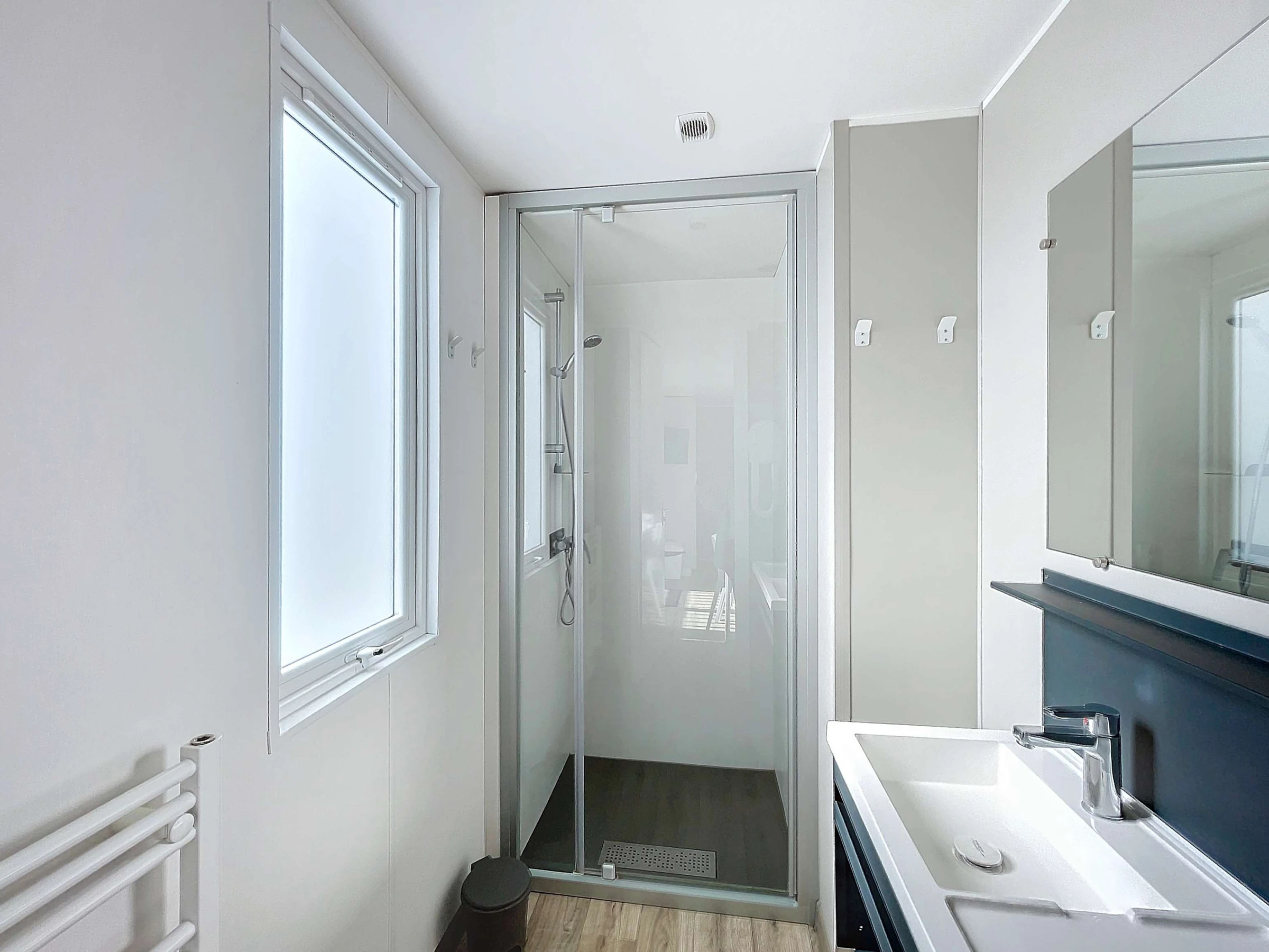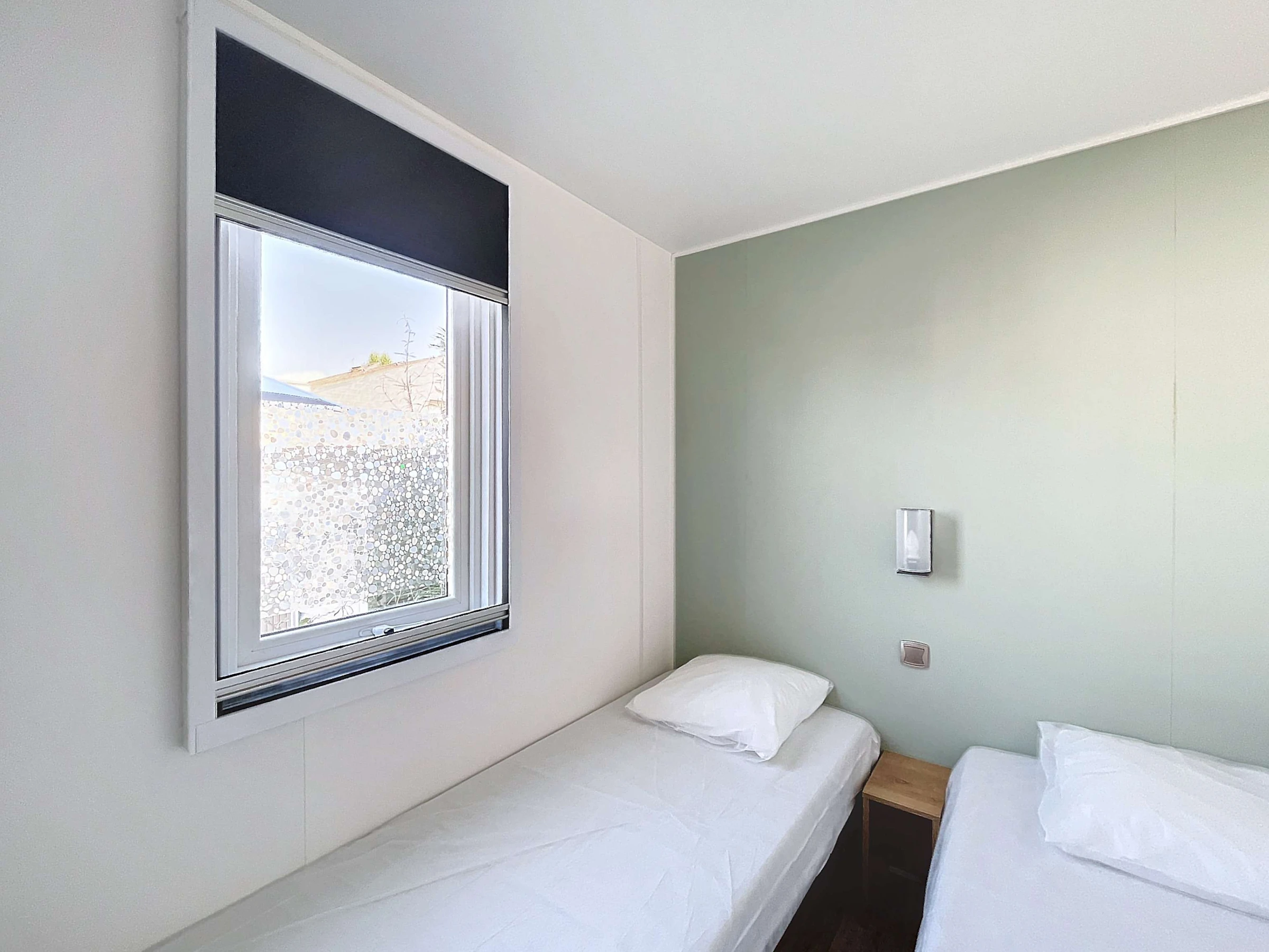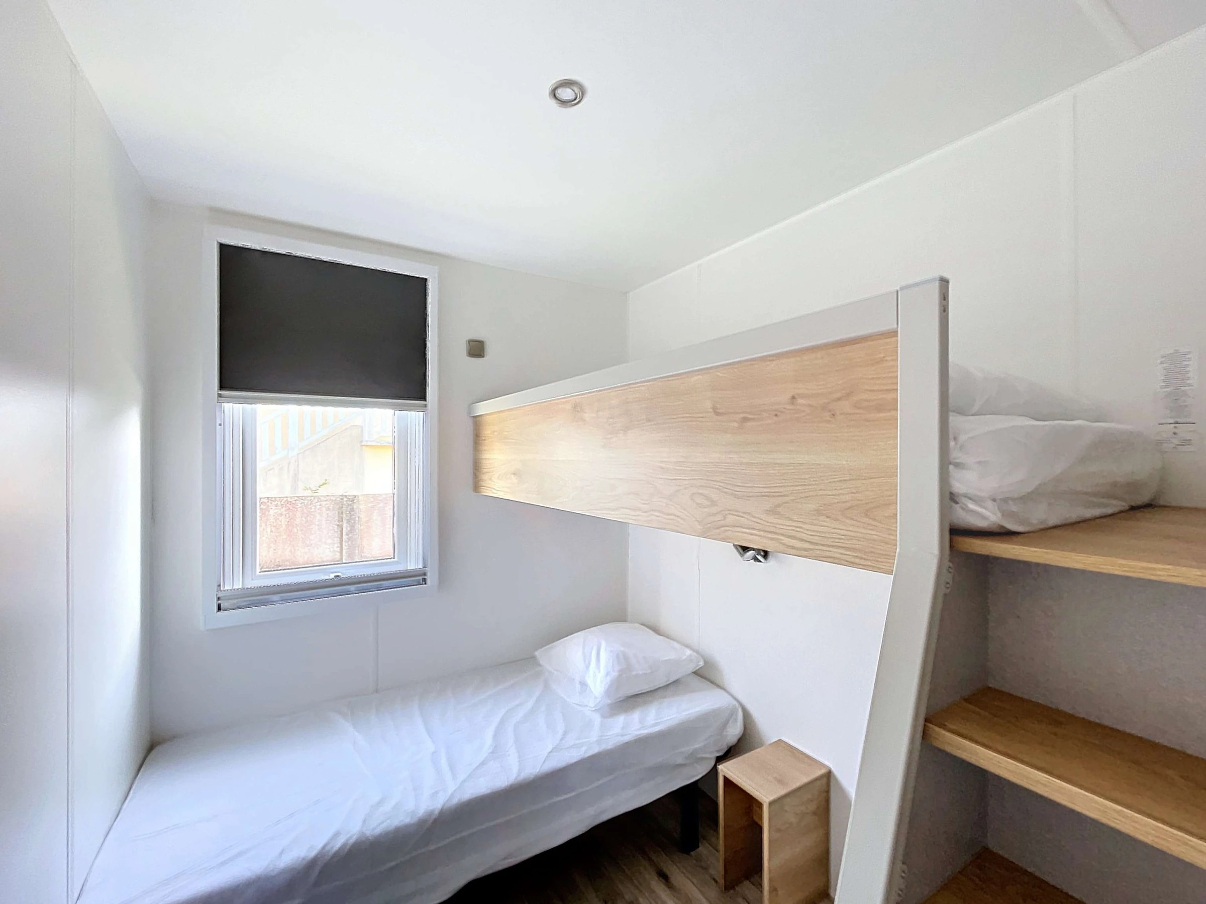 Déjate seducir por este mobile-home de 35 m² compuesto por un salón con zona de cocina amueblada y equipada, un salón con sofá y TV, un dormitorio principal con cama de matrimonio (160x200), un segundo dormitorio con dos camas individuales (90). , y un tercer dormitorio con dos literas (90), un baño y un aseo independiente. Está equipado con una gran terraza de madera equipada donde se puede comer al aire libre o tomar el sol en las tumbonas. Hay una plaza de aparcamiento disponible en la parcela, sólo para un único vehículo.