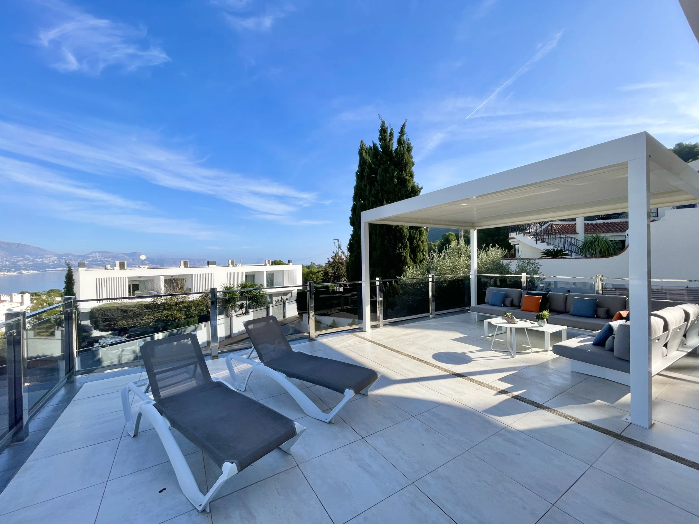 Fabulosa Villa en El Albir para disfrutar de unas vacaciones de ensueño! Esta Villa cuenta con 3 dormitorios con amplias camas de matrimonio y 3 cuartos de baño, 2 salones, vestidores en las habitaciones y 2 magníficas terrazas, una de ellas equipada con una zona lounge desde la que puedes ver el mar o tomar el sol mientras te relajas; todo ello distribuido en 2 plantas.