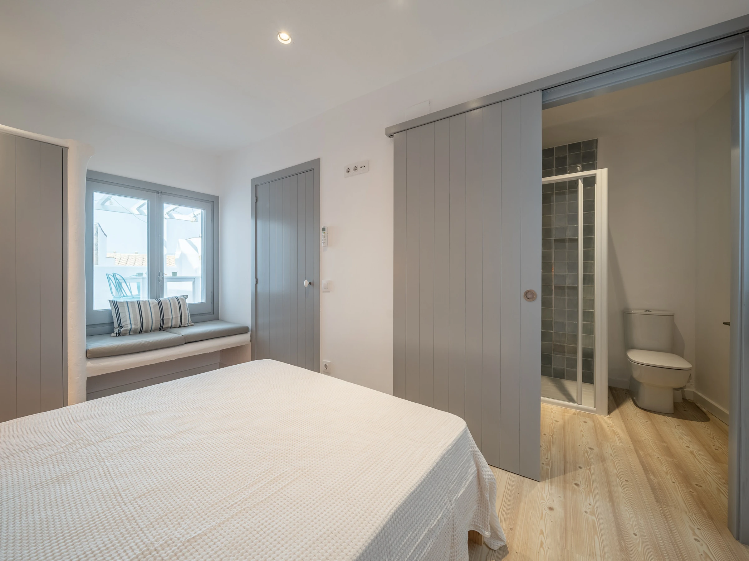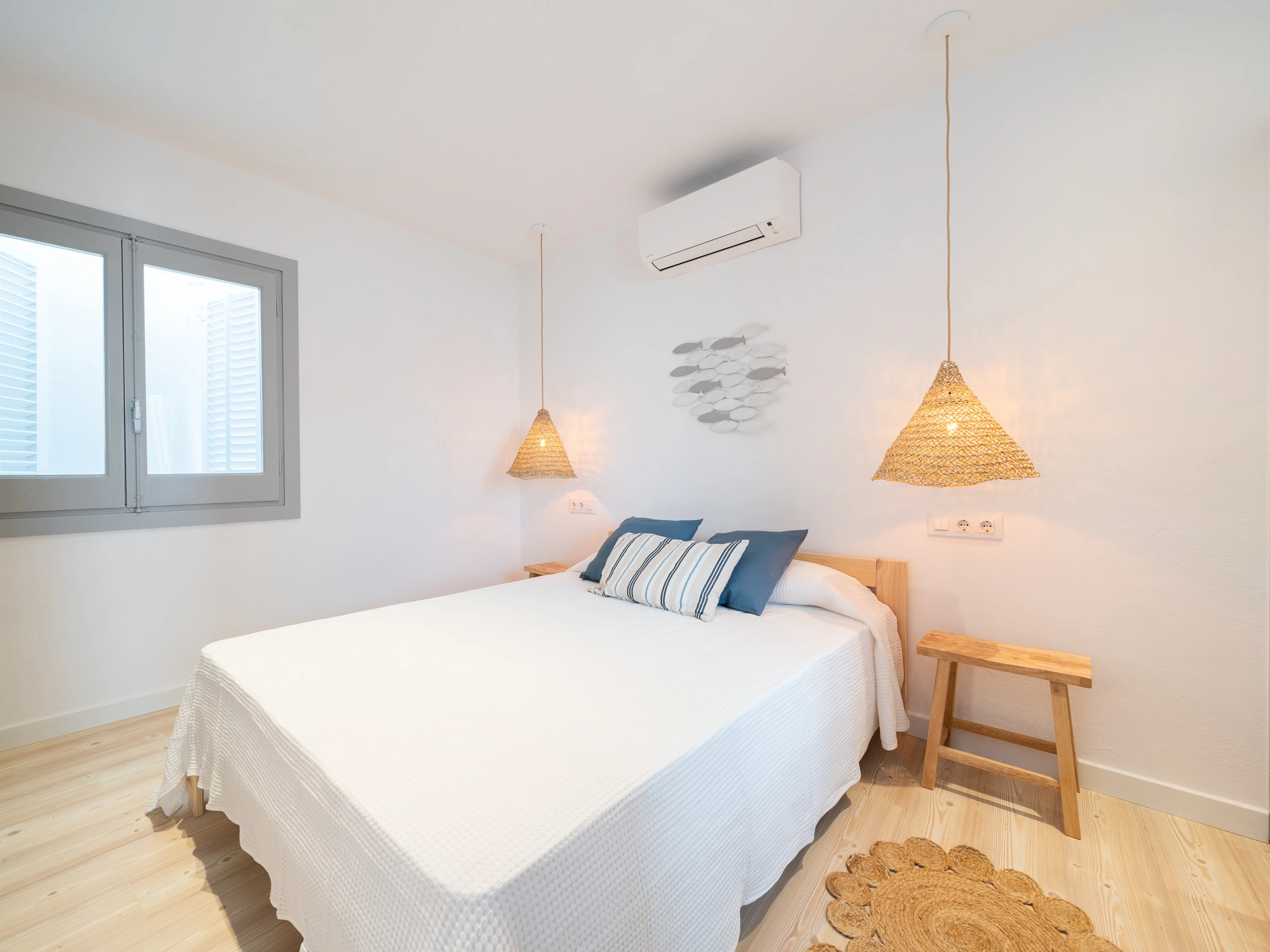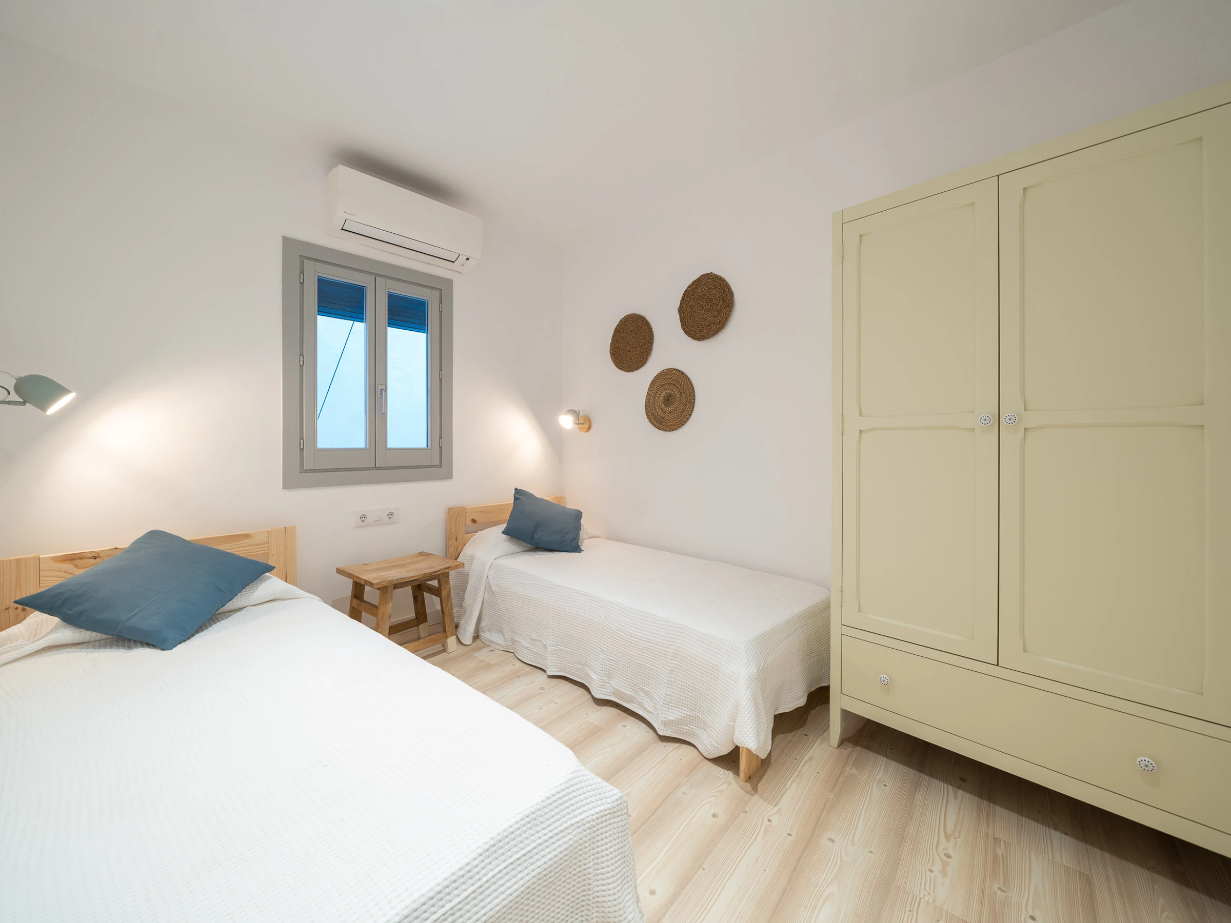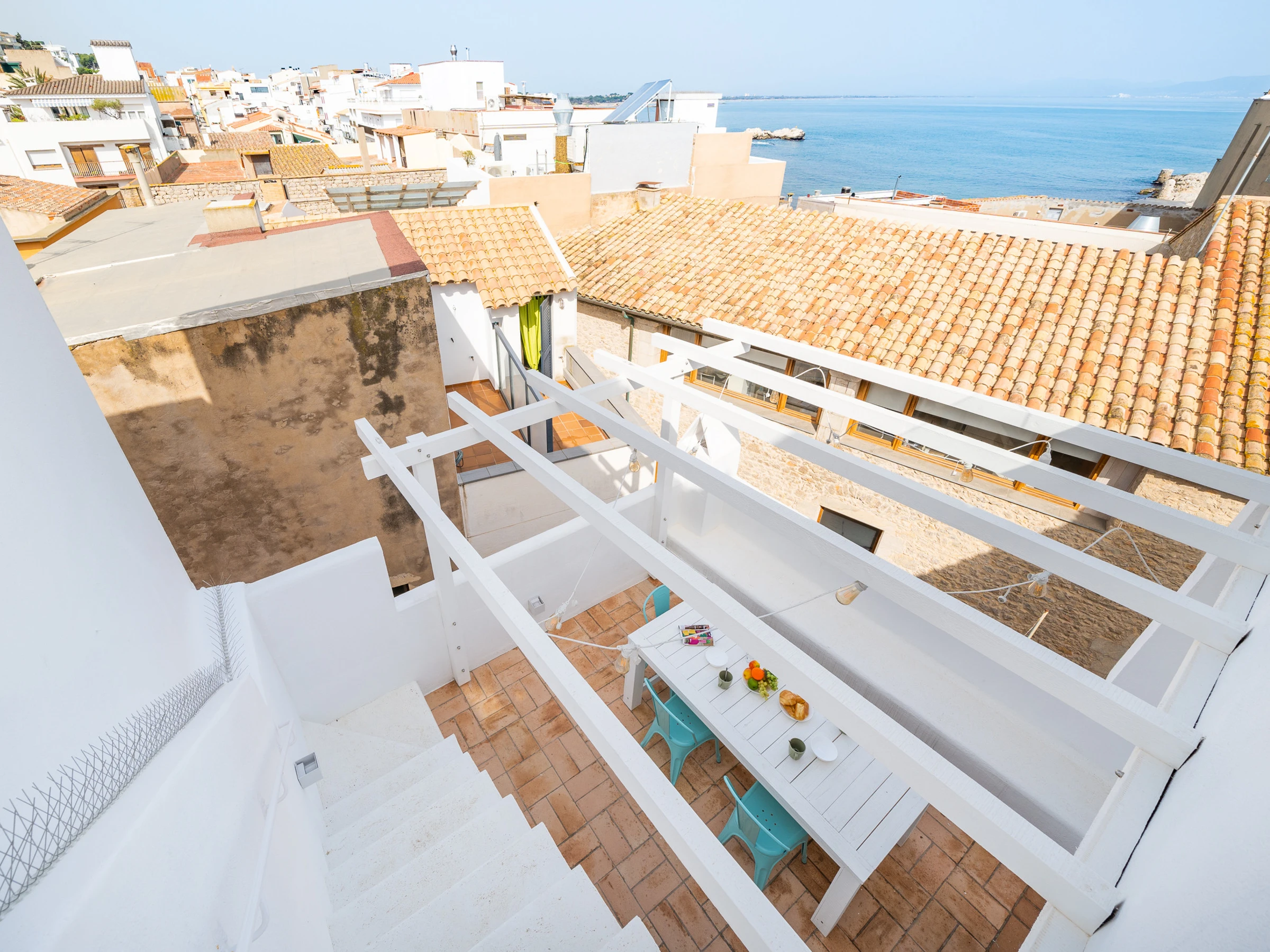 El apartamento dispone de tres plantas, la primera tenemos una habitación con dos camas individuales y un baño con ducha, junto al comedor donde hay la cocina totalmente equipada, con lavavajillas, horno, cafetera, lavadora, etc., con una mesa redonda para seis personas. En la planta superior hay una habitación de matrimonio y un baño con ducha, también hay un acceso a una terraza exterior con una mesa para comer y una plancha para poder cocinar. Desde la terraza exterior hay unas escaleras que dan acceso al tejado, un espacio 'chill out' privilegiado con unas vistas fantásticas al mar, para poder tomar una copa en los atardeceres. También hay una bañera para poder relajarse al aire libre. El apartamento dispone de Internet y aire acondicionado.