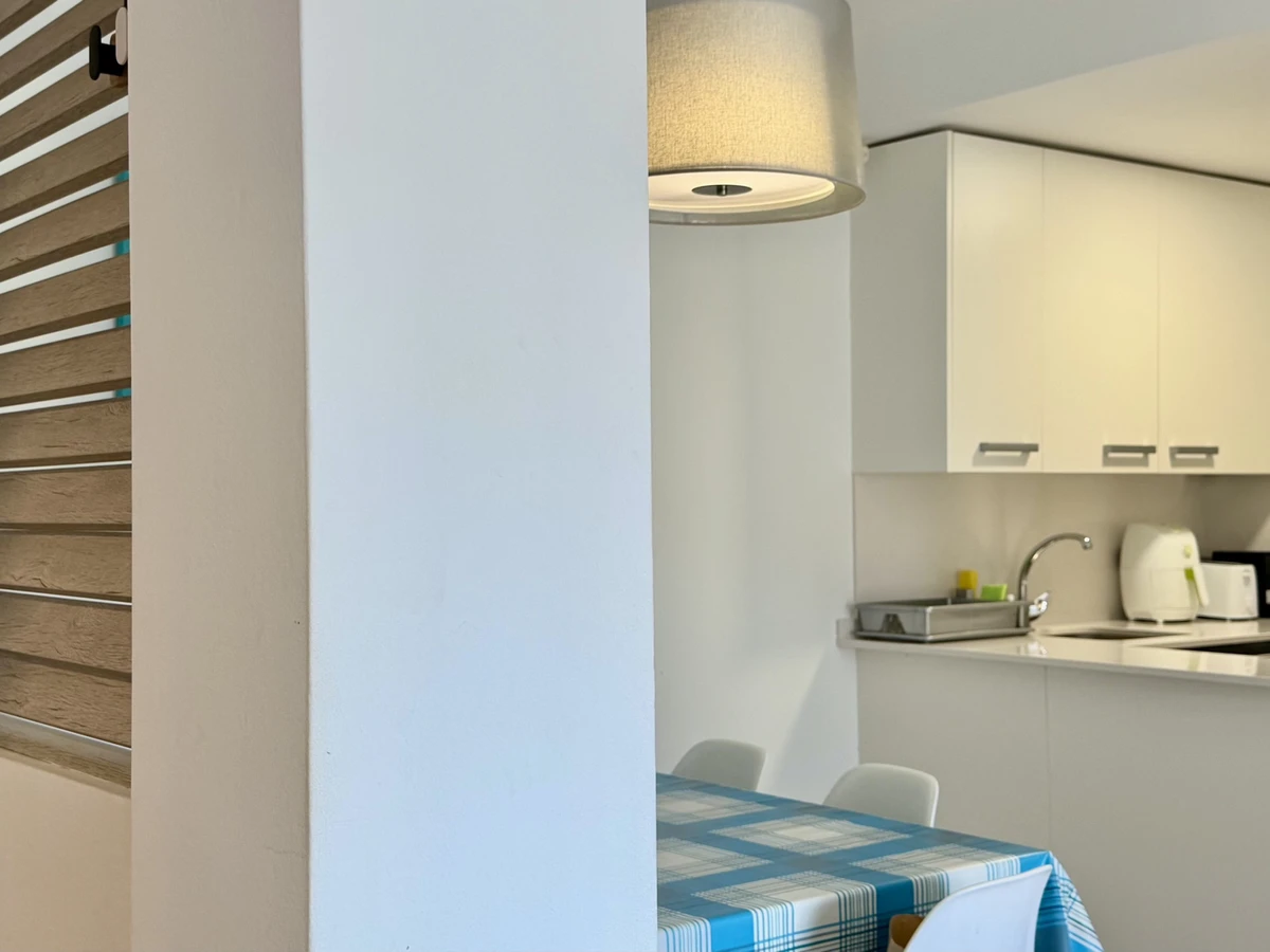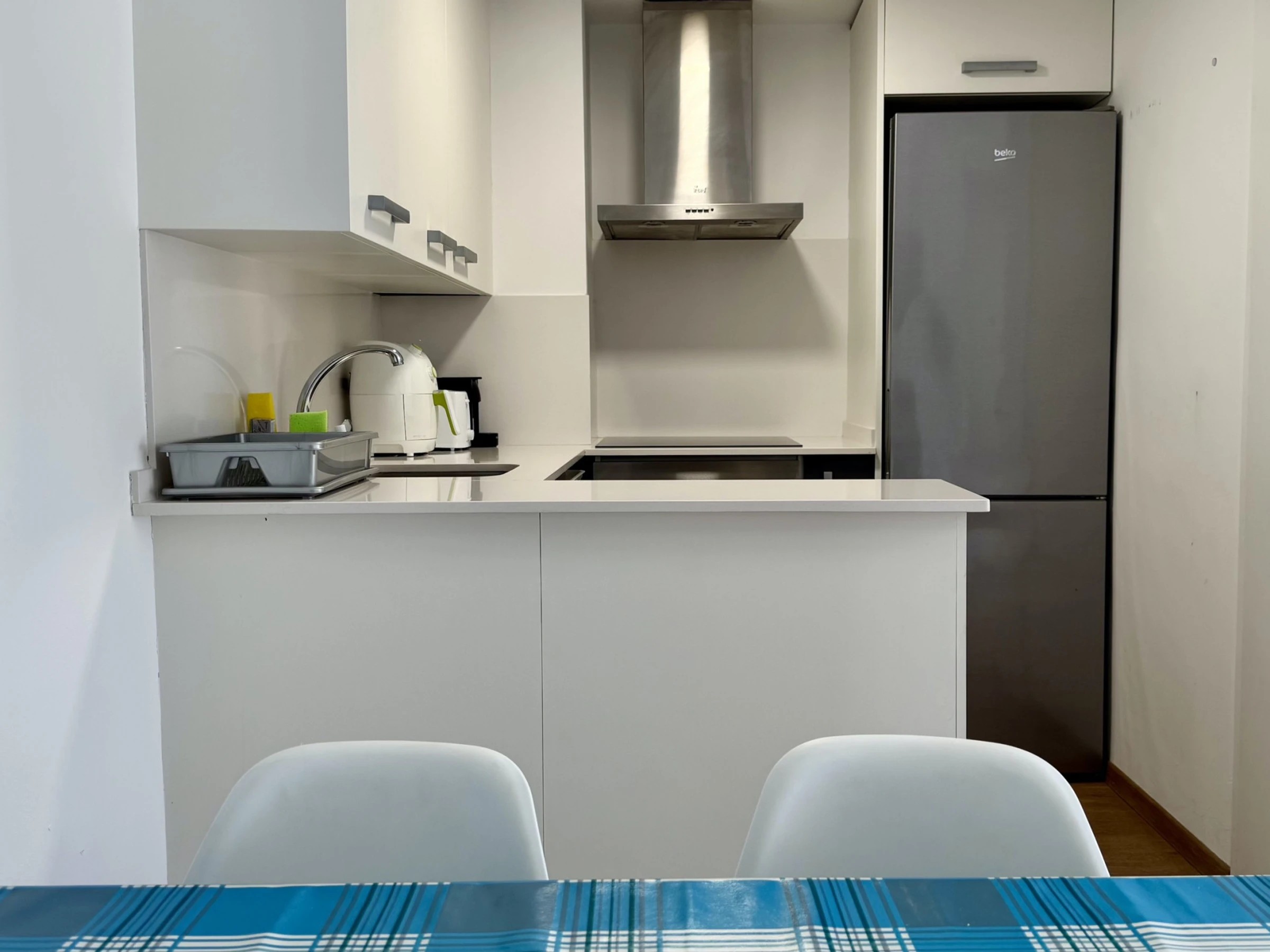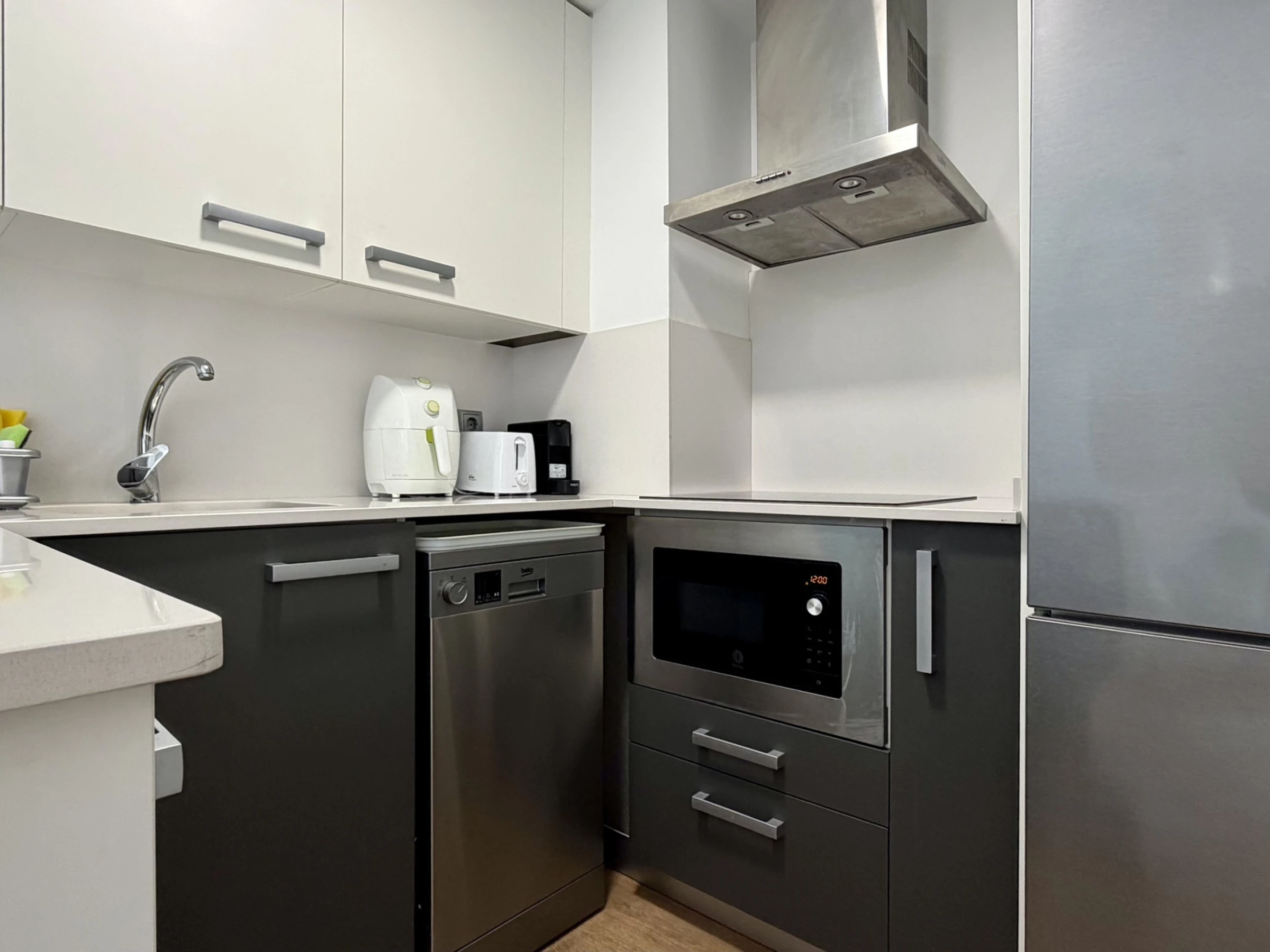 El apartamento cuenta con una cocina americana completamente equipada, ideal para preparar comidas en familia. Dispone de electrodomésticos modernos como nevera, congelador, lavadora, lavavajillas, horno, freidora, tostadora y máquina de café. La zona de cocina está diseñada para facilitar la preparación de comidas y compartir momentos juntos.