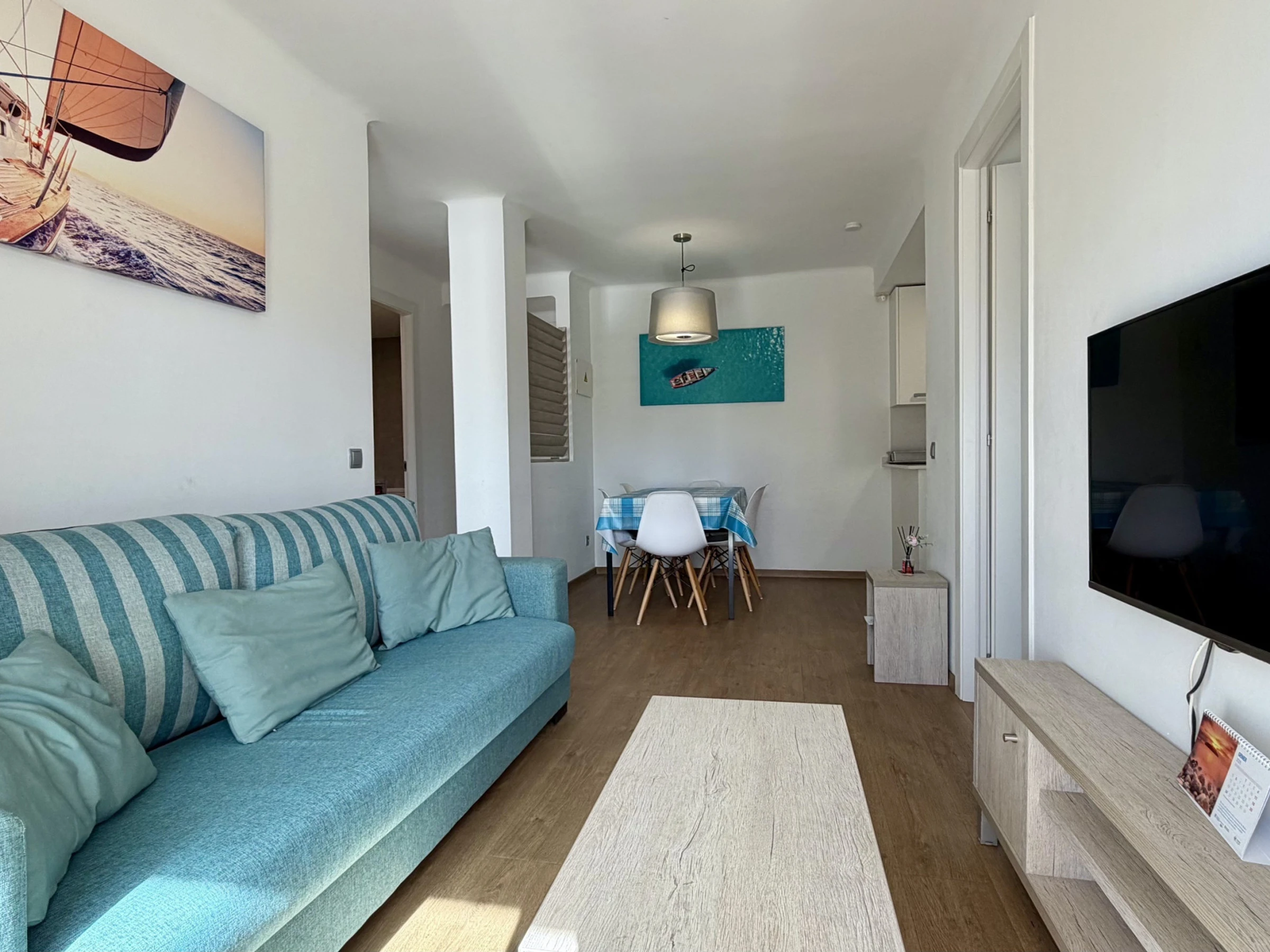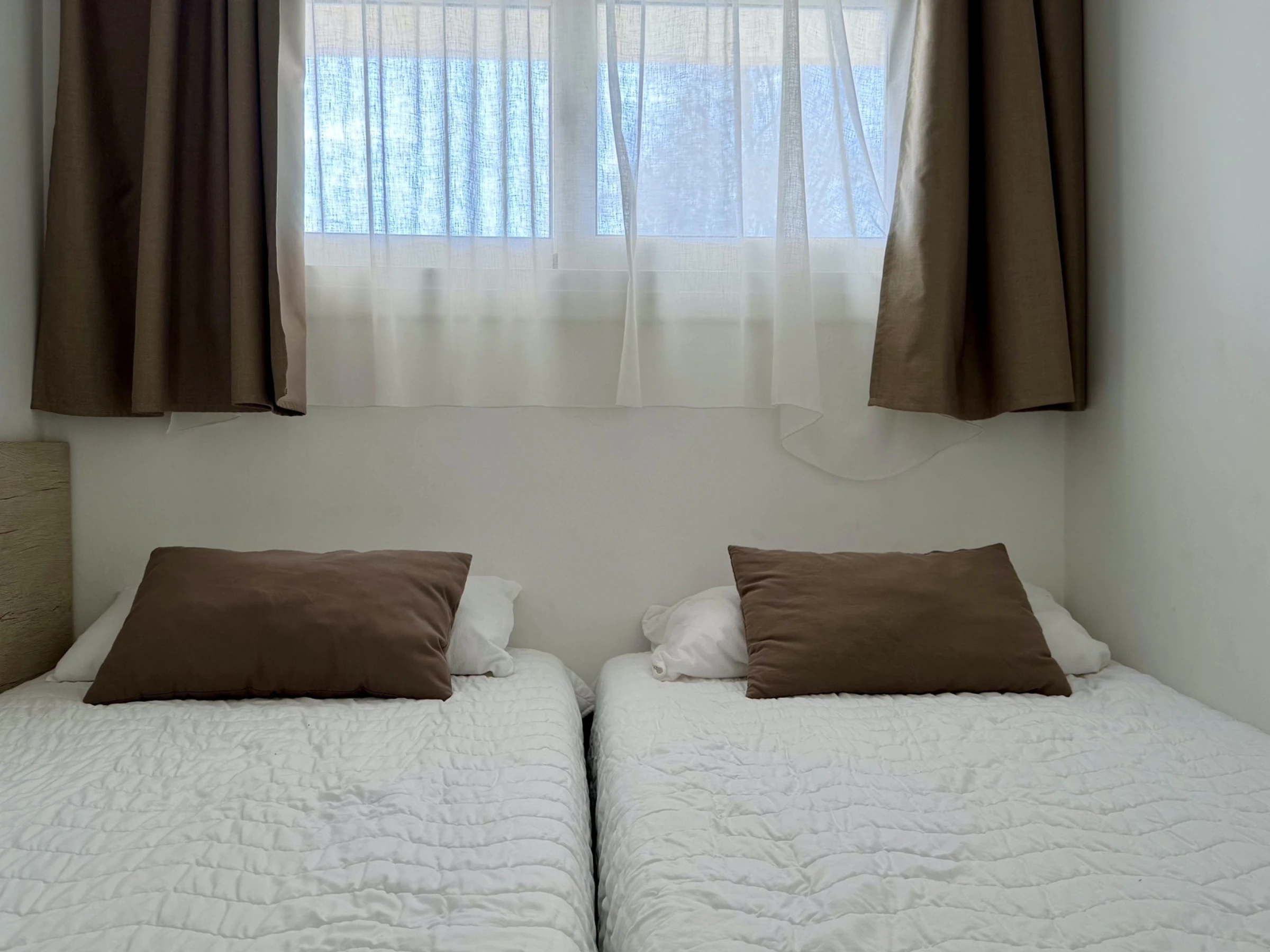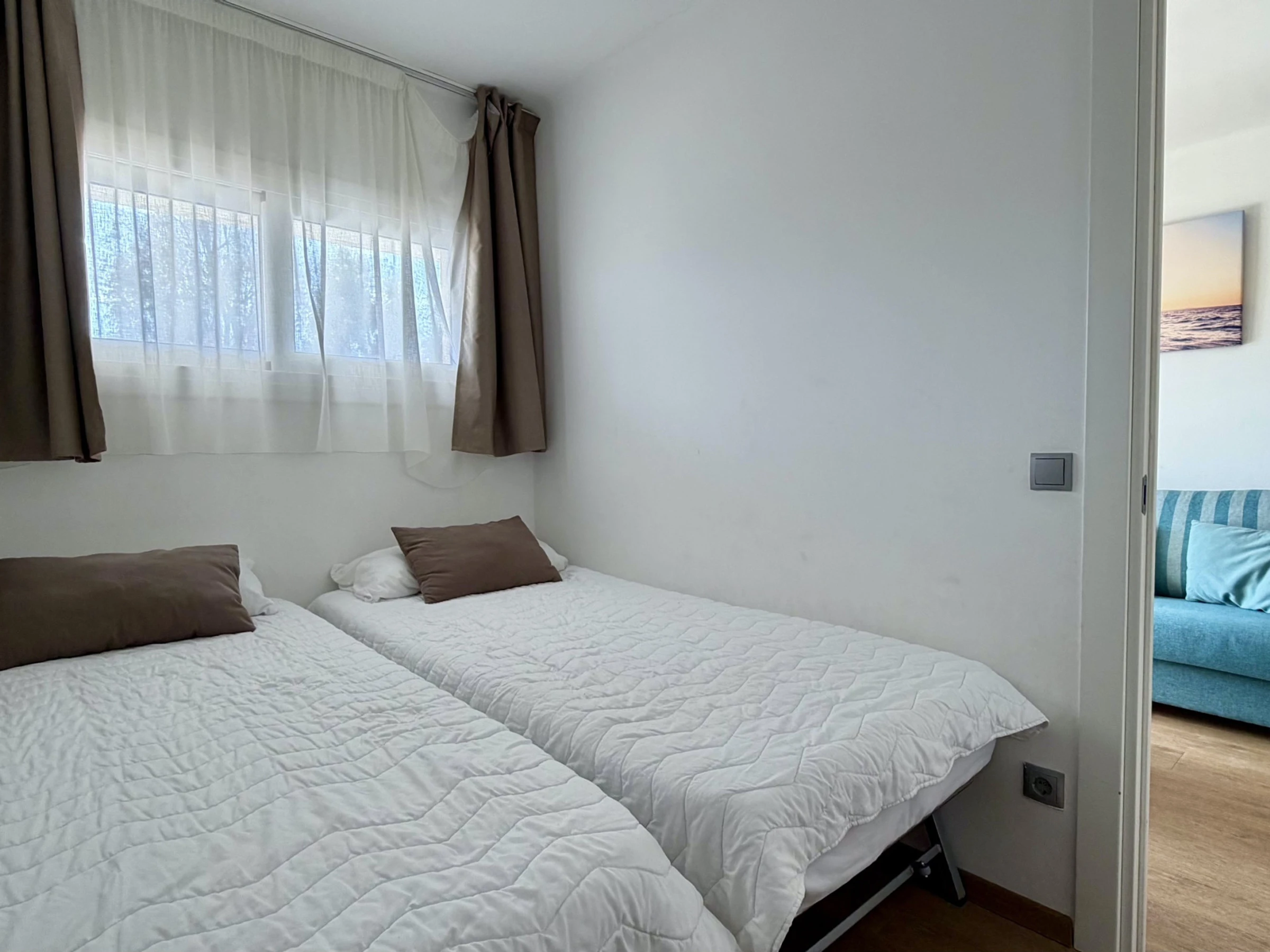 Los 5 espacios para dormir incluyen 1 sofá cama y 4 camas individuales, proporcionando flexibilidad para familias con niños. El apartamento está climatizado con aire acondicionado y bomba de calor para garantizar el confort en cualquier época del año.