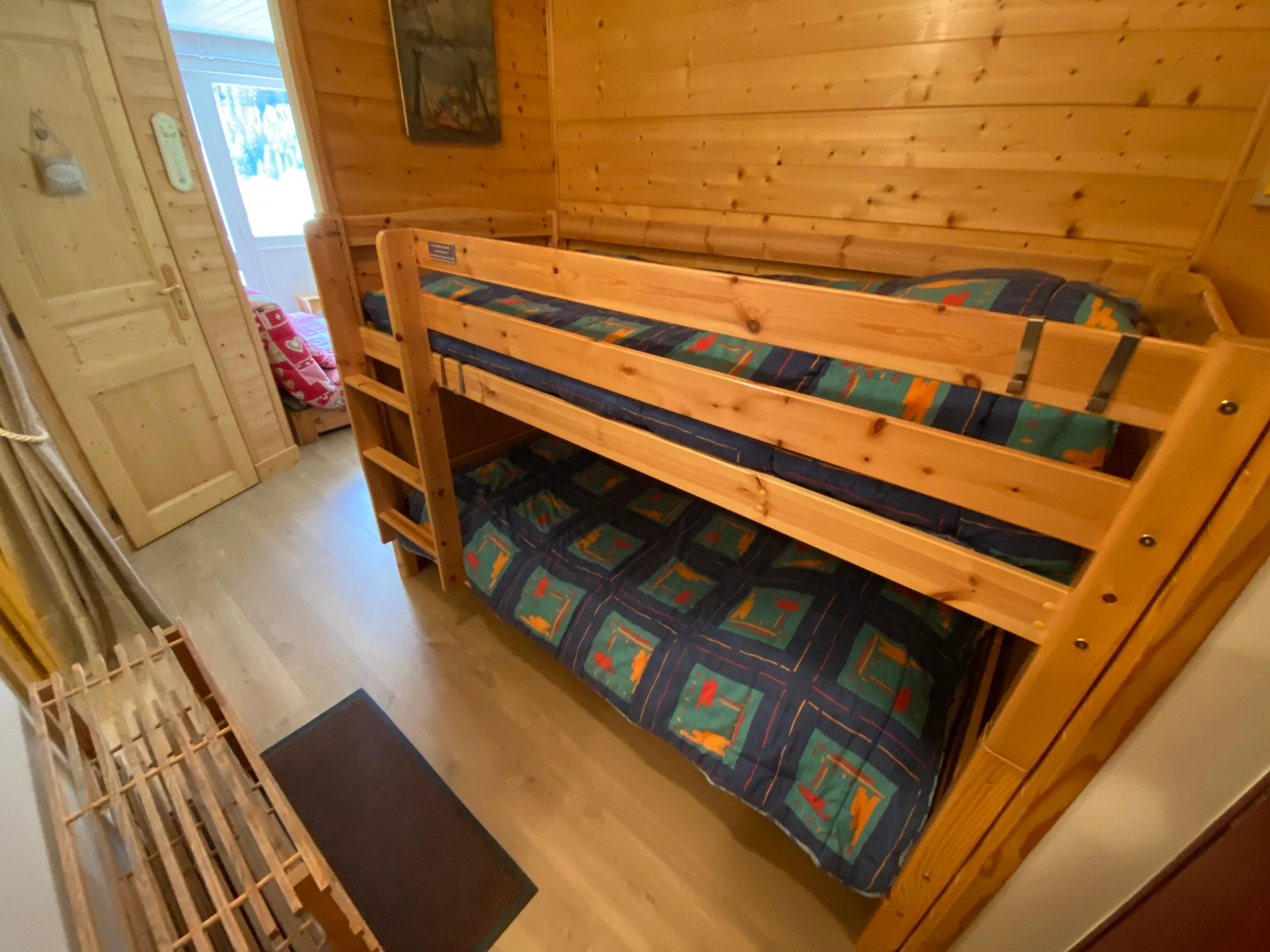 Apartamento de 34 m² en la 1.ª planta con ascensor. Incluye entrada con rincón de montaña, literas (90 x 190), dormitorio con cama doble (160 x 200), cocina equipada abierta al salón, baño con bañera y aseo independiente. Balcón orientado al sur.