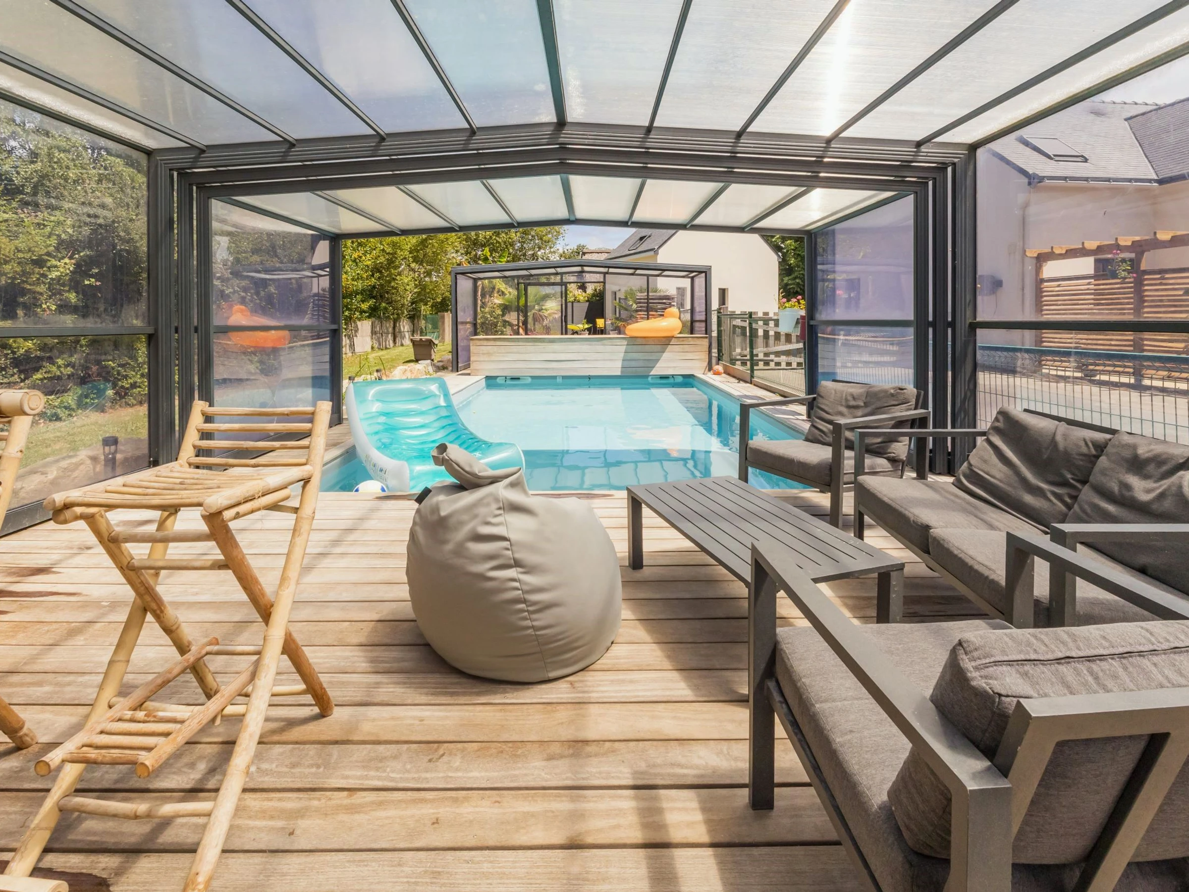 Terraza orientada al suroeste y jardín privado sin vallar de 1000 m², con piscina cubierta climatizada compartida (8x4 m, abierta desde principios de abril hasta finales de septiembre).
