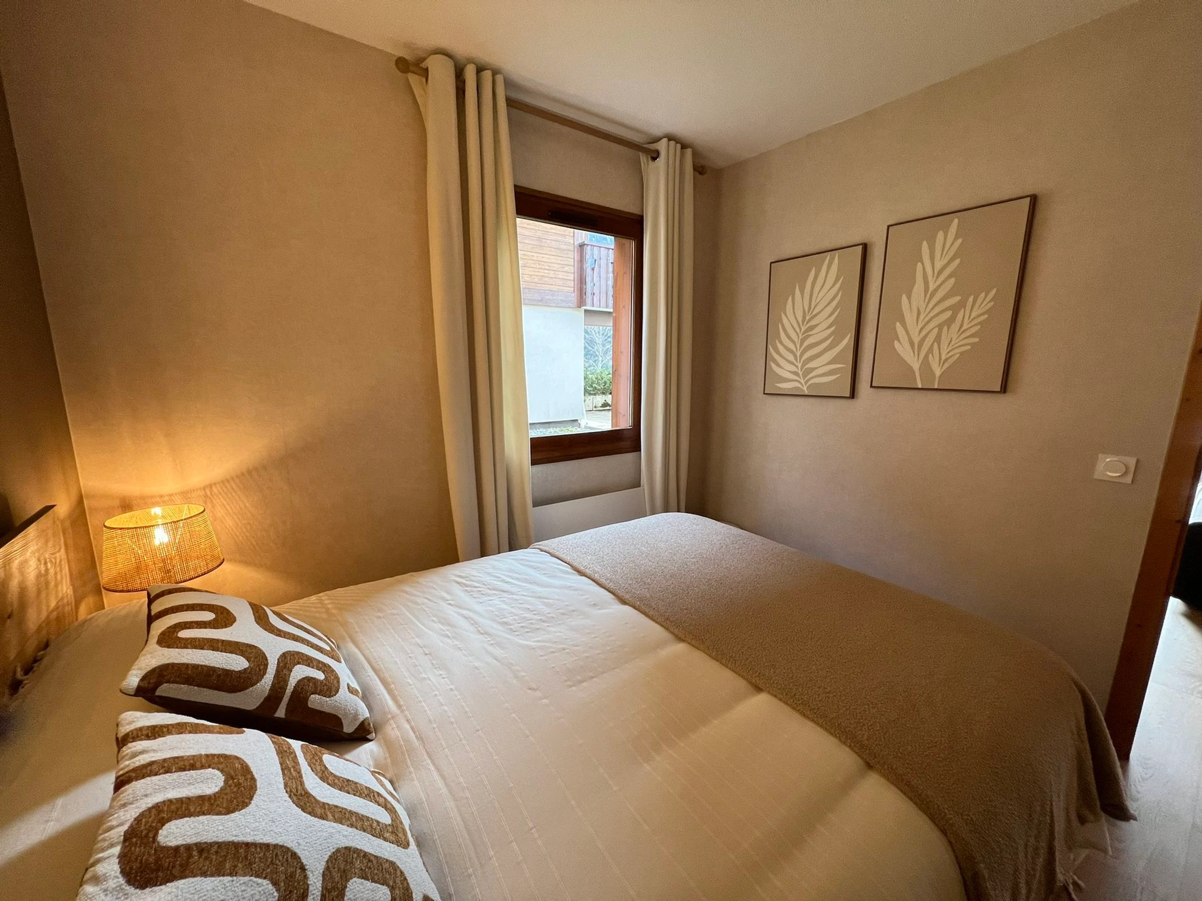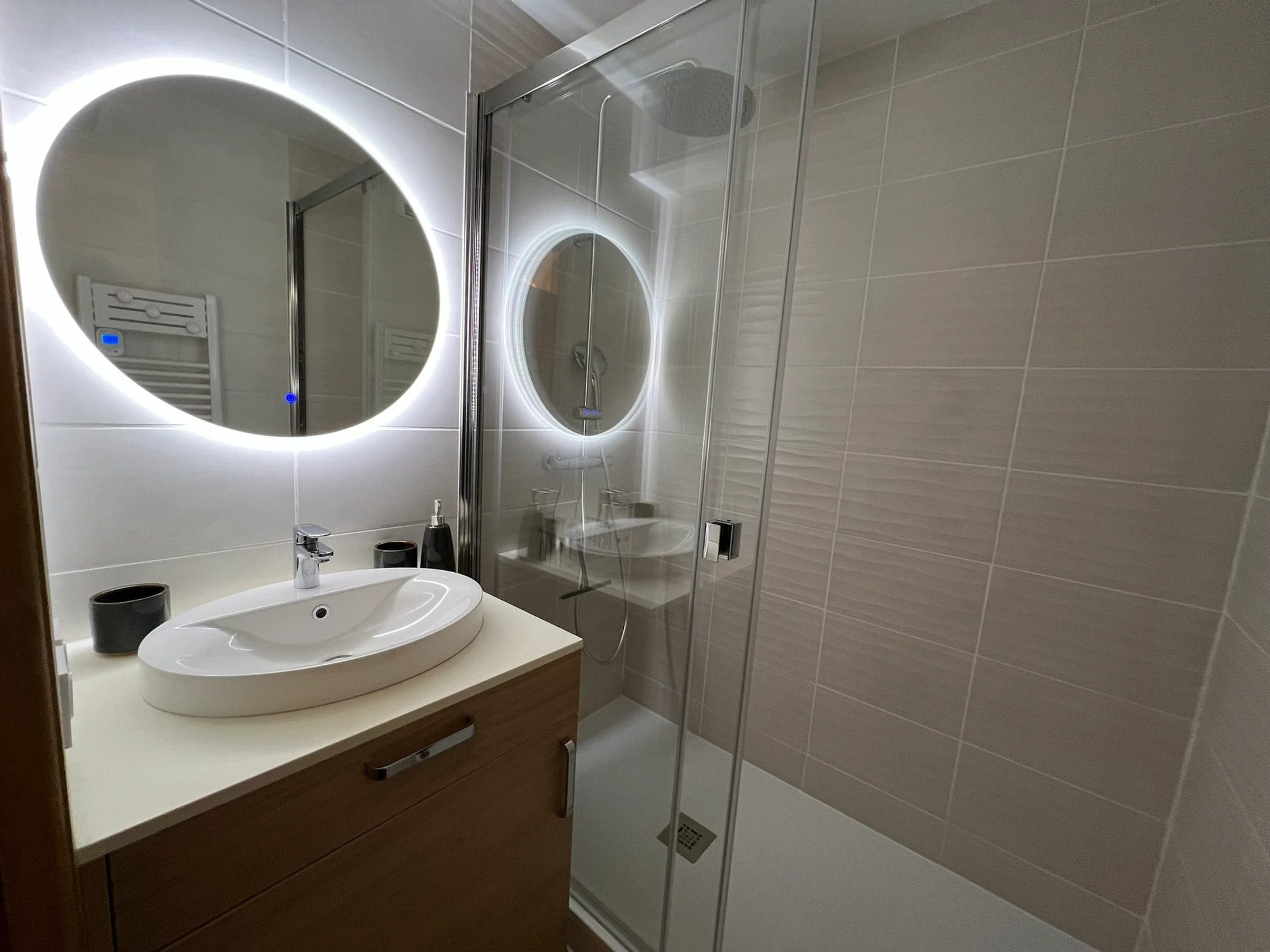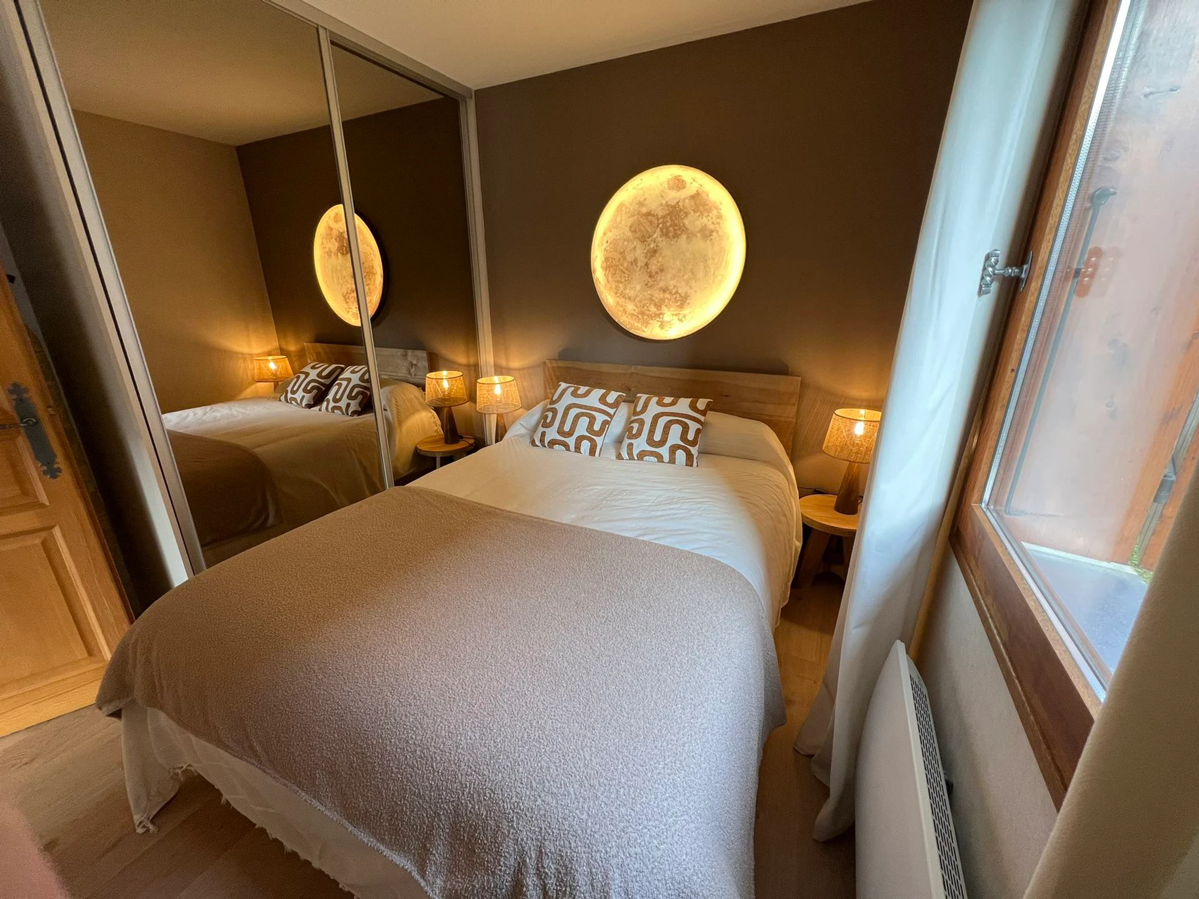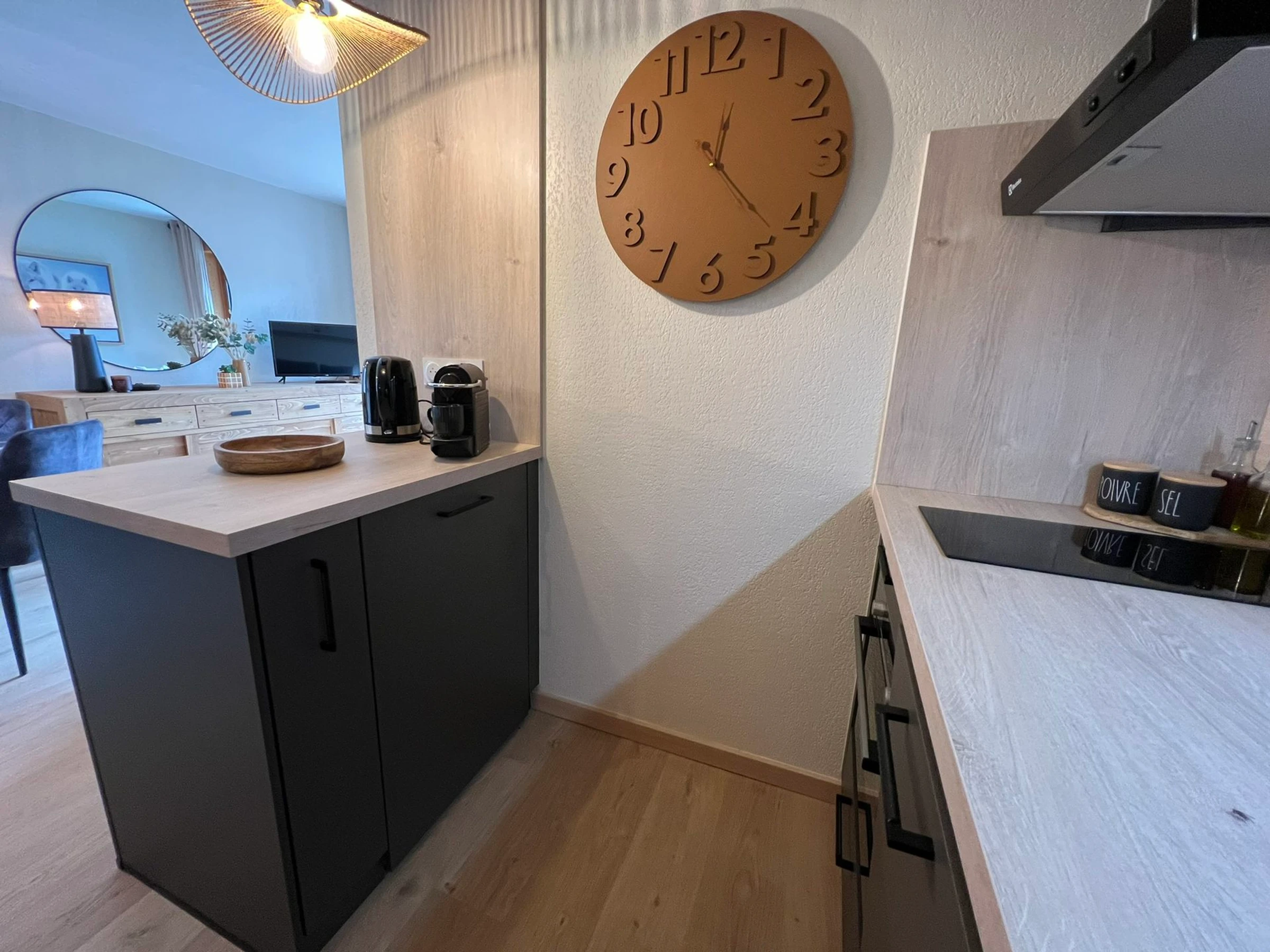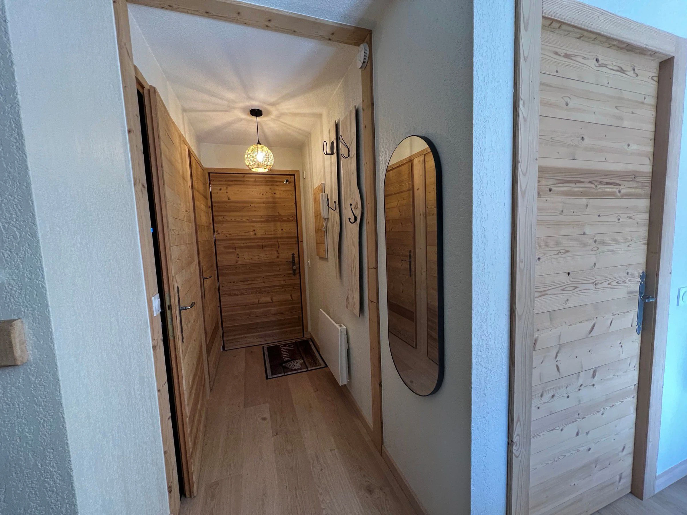 Entrada/Recibidor (2,23 m²) con perchero - Aseos independientes (1,06 m²) - Cuarto de ducha (2,58 m²): ducha a ras de suelo, lavabo, lavadora, toallero calefactado, secador de pelo - Dormitorio (7,56 m²): 1 cama doble, ventana al este con vistas a la residencia y a las montañas - Salón (16,95 m²) con zona de estar: sofá, mesa de centro, aparador, TV, ventanal con acceso a la terraza sur y vistas a la montaña - Comedor: mesa y sillas - Cocina equipada abierta al salón: placa de inducción de 2 fuegos, campana extractora, microondas, lavavajillas, frigorífico con congelador (112 L), cafetera Nespresso, hervidor de agua, tostadora, raclette y fondue.