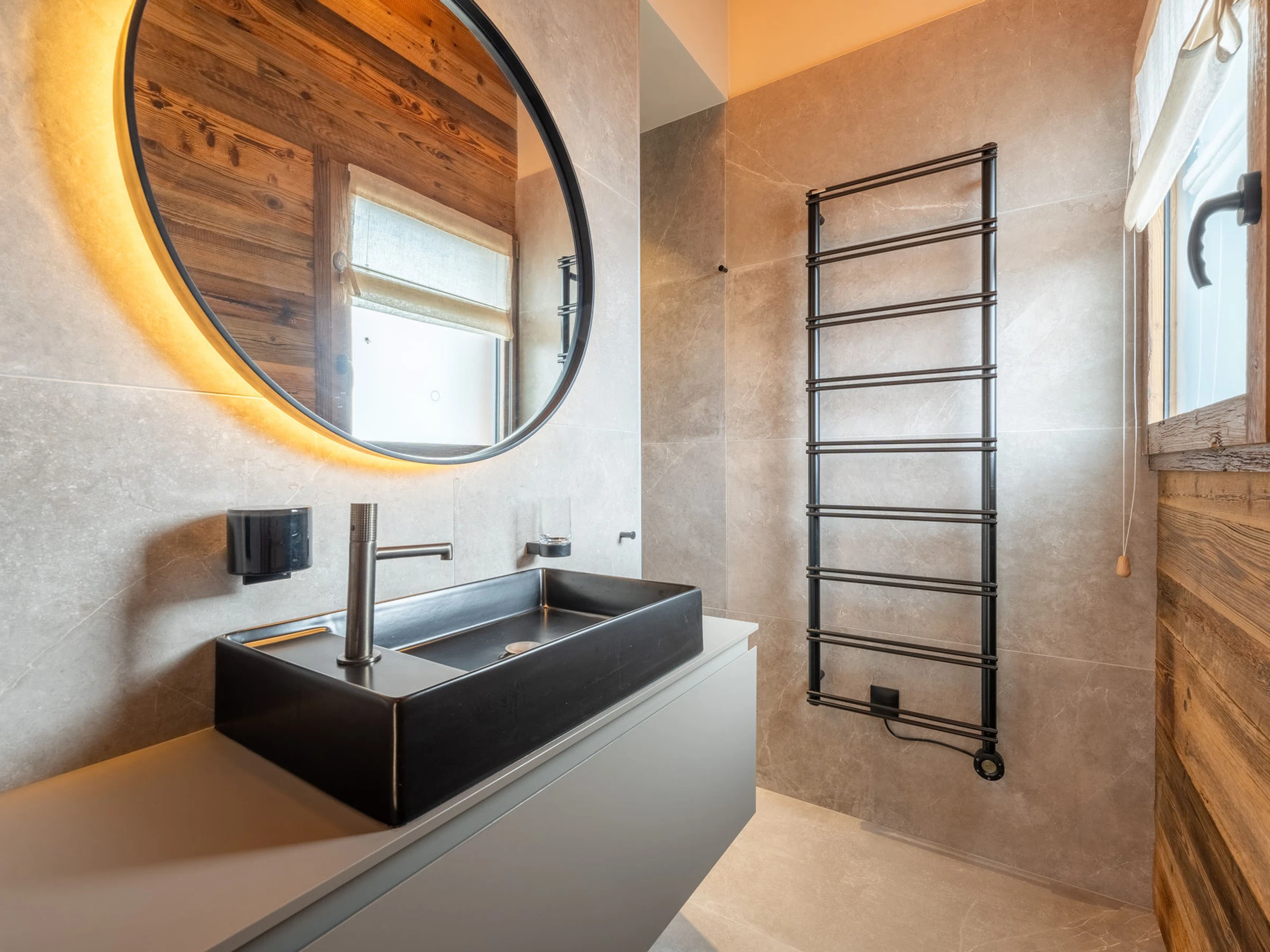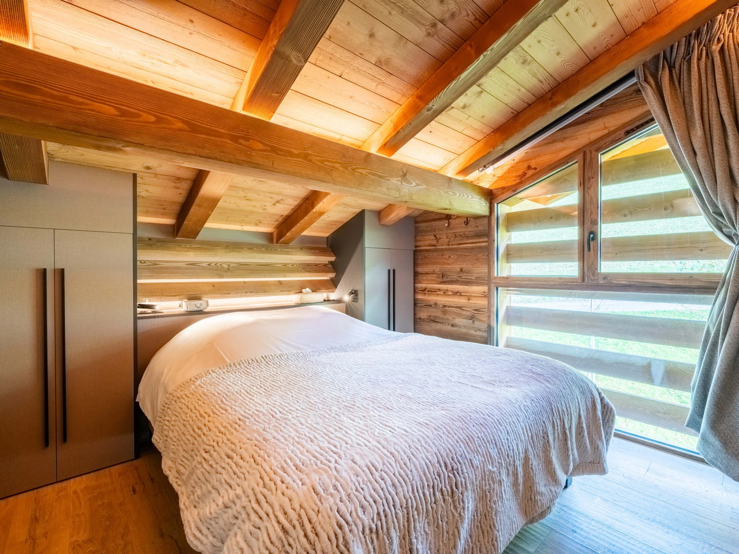 - DORMITORIO (9,41 m²): 1 CAMA DOBLE (160), ventana orientada al sur, vegetación / chalets contiguos / vistas a la montaña, BAÑO CON DUCHA (3,55 m²): lavabo, ducha, inodoro, radiador con secador de toallas, ventana orientada al este, vegetación / vistas a la montaña