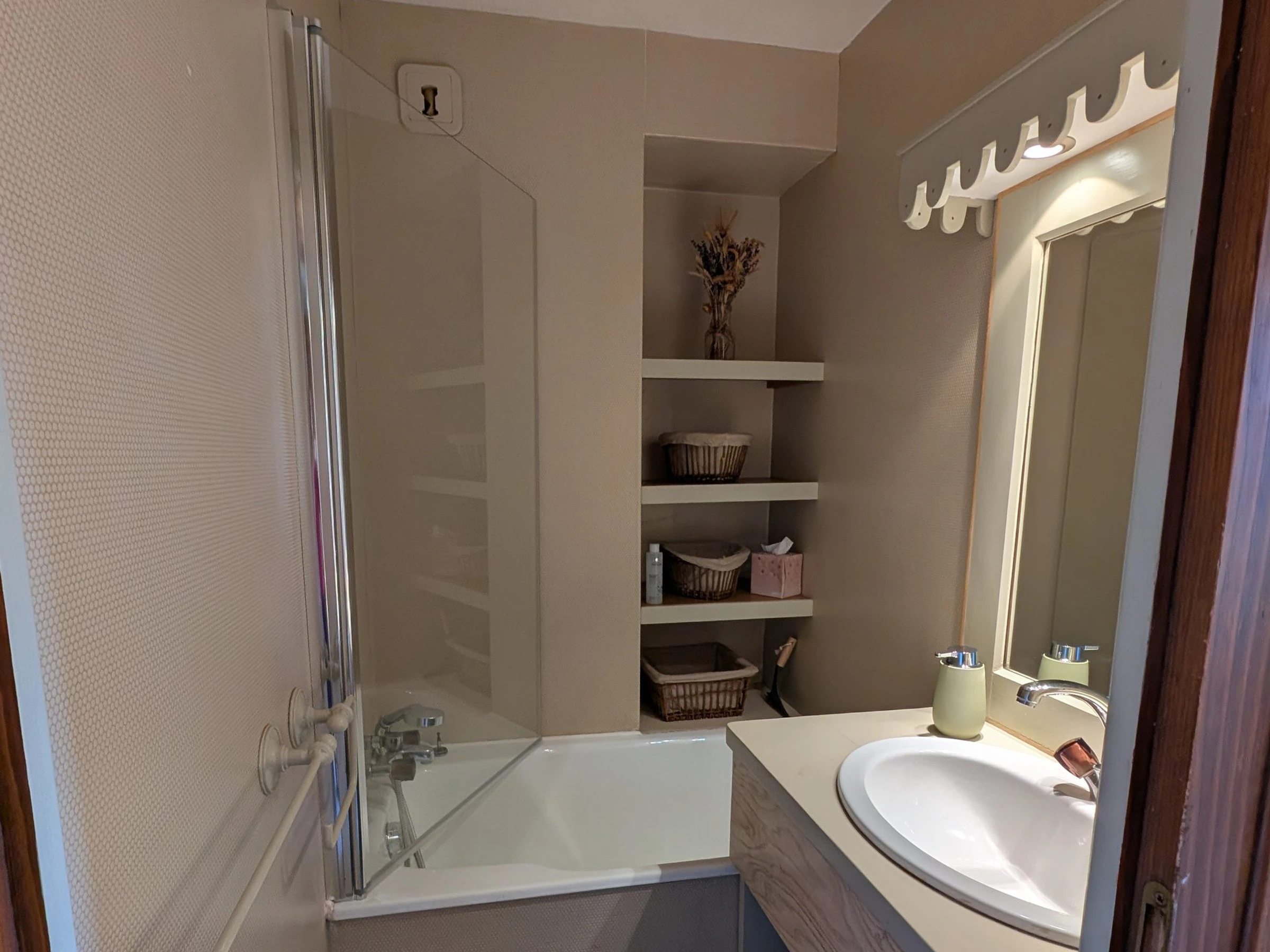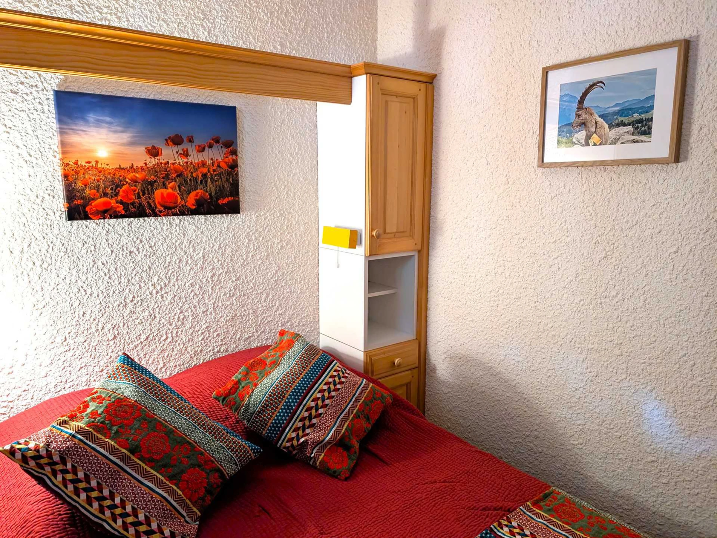 Recibidor: Armario - Dormitorio (5 m²): 1 cama doble, armario, ventana orientada al norte con vistas a la residencia - Dormitorio (8 m²): 2 literas - Aseo - Baño: Bañera, lavabo, espejo - Cocina: 3 placas eléctricas, horno, nevera (100 l), lavavajillas, armarios, secador de pelo - Salón (12 m²): Sofá, TV y ventanal con acceso al balcón orientado al sur con vistas a la montaña - Comedor: Mesa y sillas.