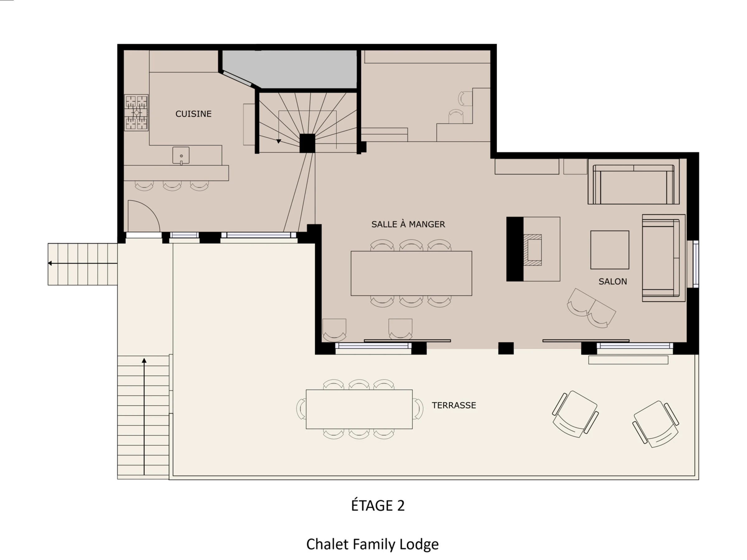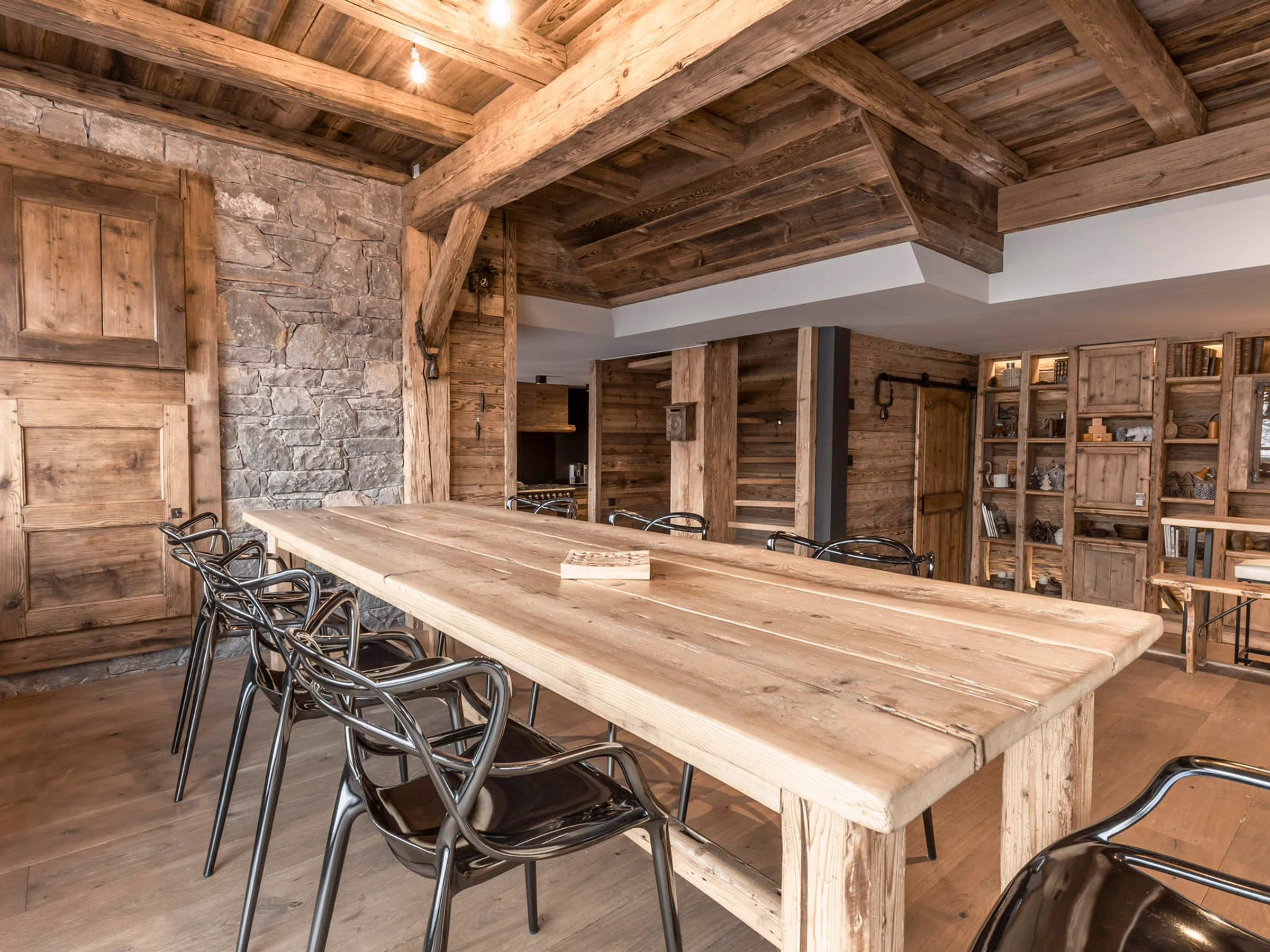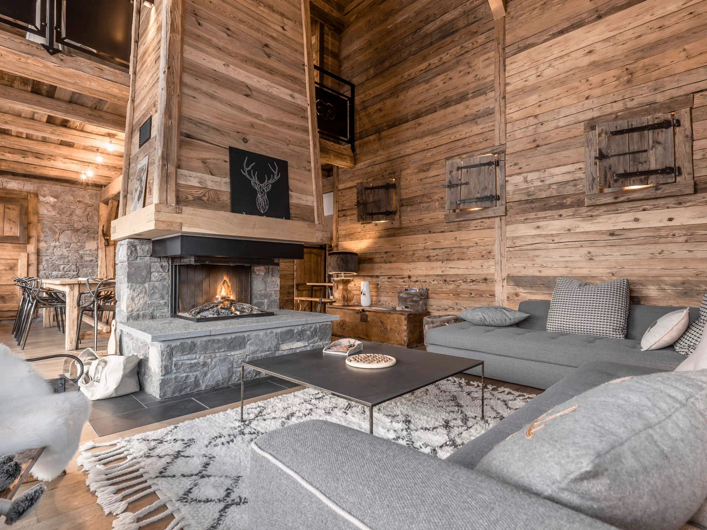 - COMEDOR (54 m²): zona de comedor, rincón de lectura, estantería, salón con chimenea, ventana orientada al norte. Vistas a zonas verdes y montañas, ventanal fijo orientado al este + ventanal corredizo orientado al este, acceso a balcón alto orientado al este, vista panorámica del pueblo y la sierra de Aravis.