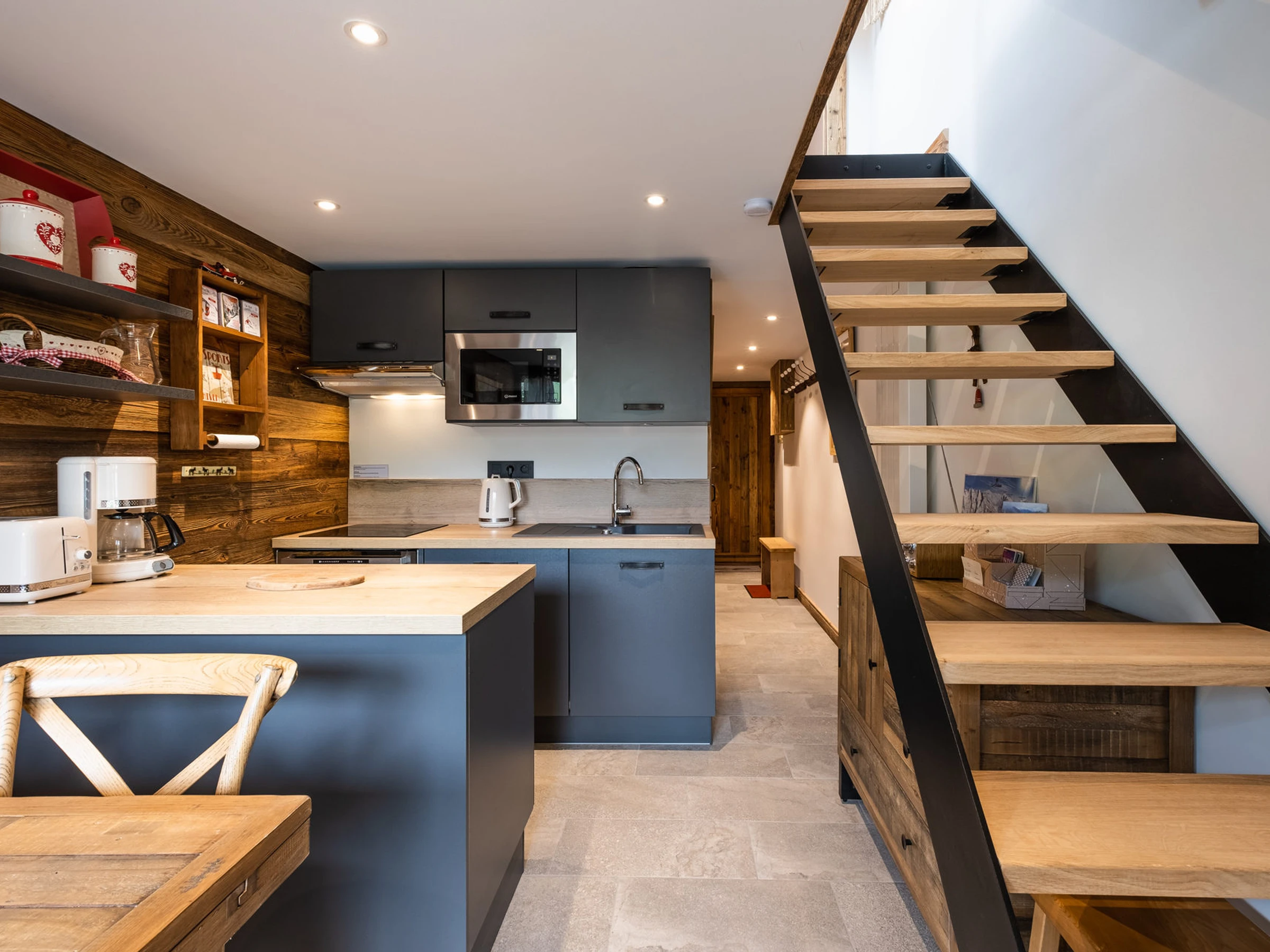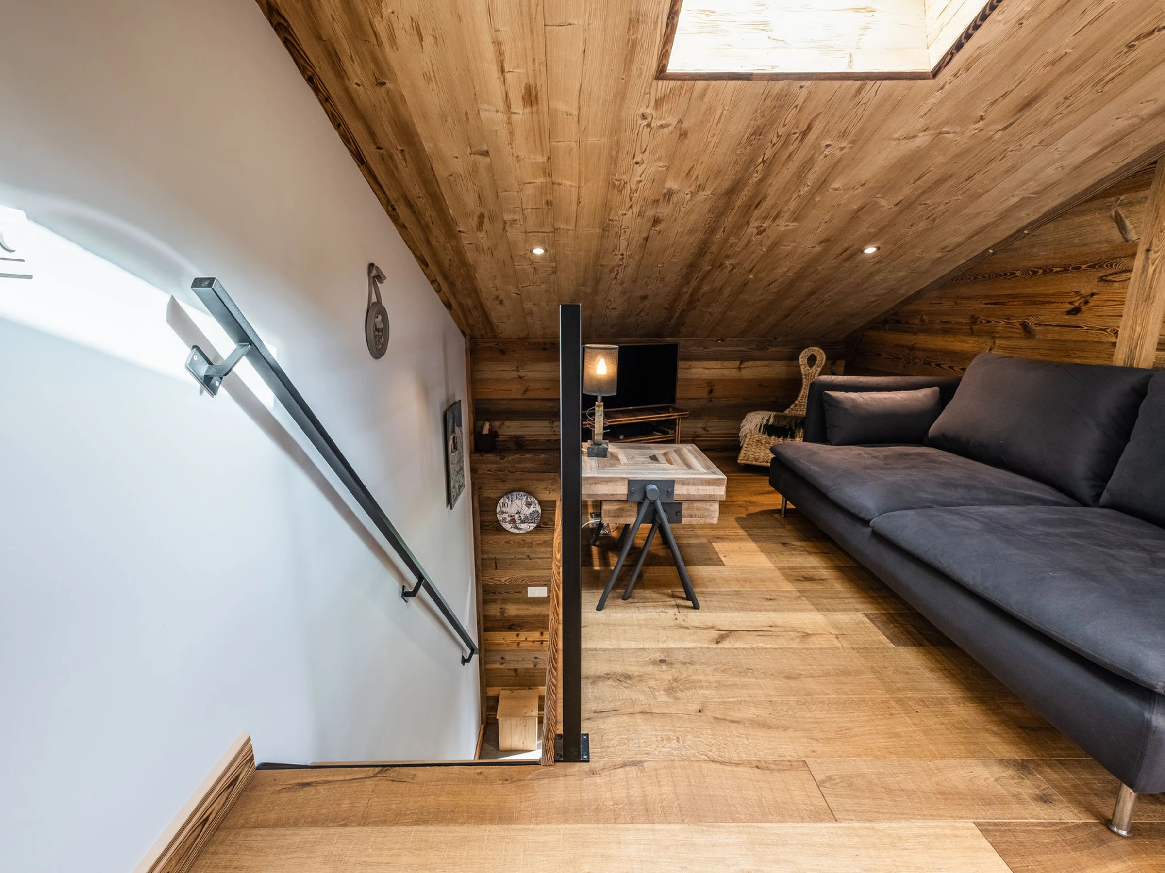 - Entreplanta (9,05 m², incluyendo 5,54 m² de buhardilla abuhardillada): rincón de relax, sofá, TV de pantalla plana, ventana de techo. Ventana pequeña orientada al oeste, con vistas al tejado/montaña.