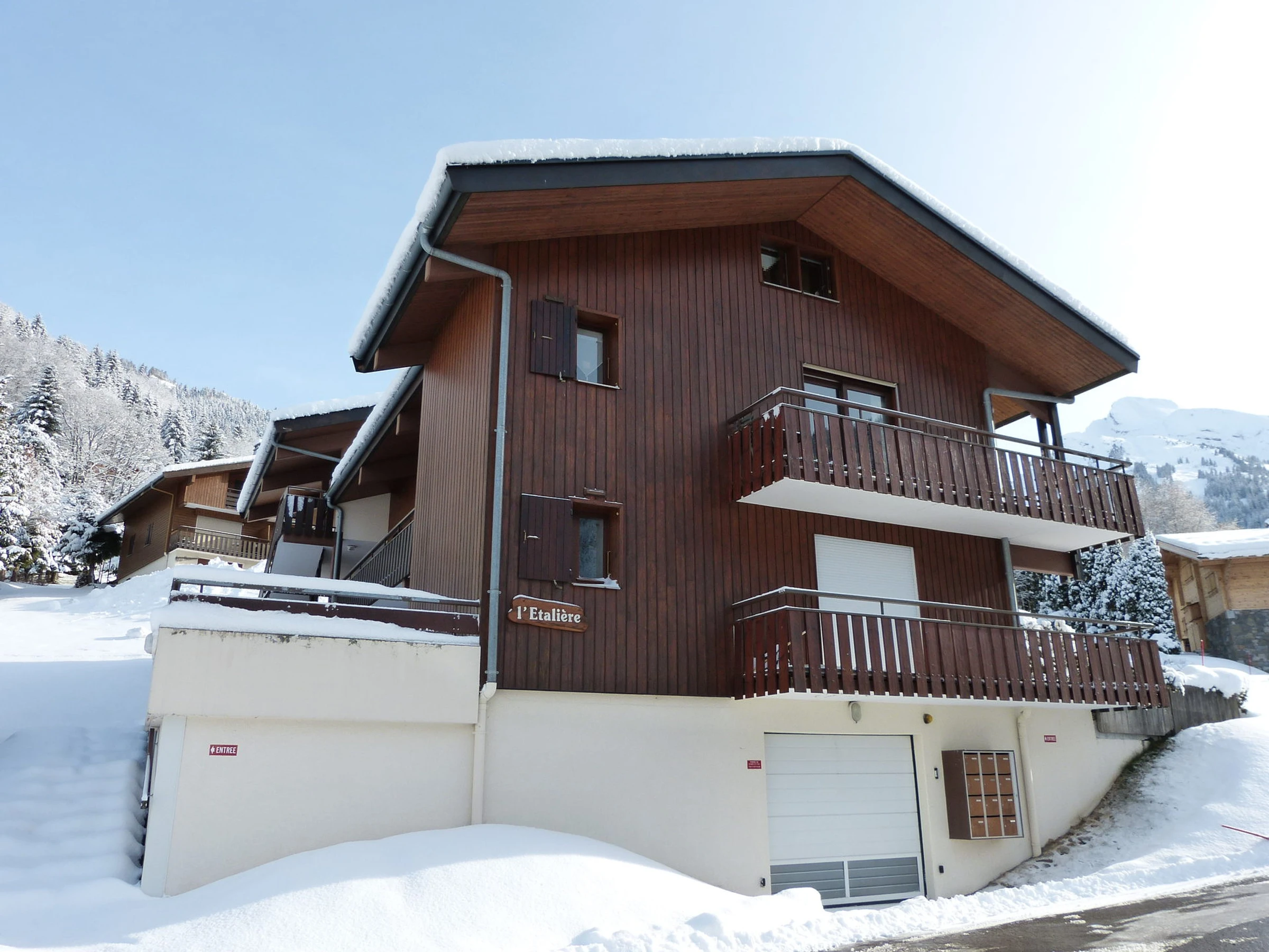 Acceso a la residencia por escalera exterior (13 escalones). Guardaesquís. Garaje (3.ª caja a la derecha).
