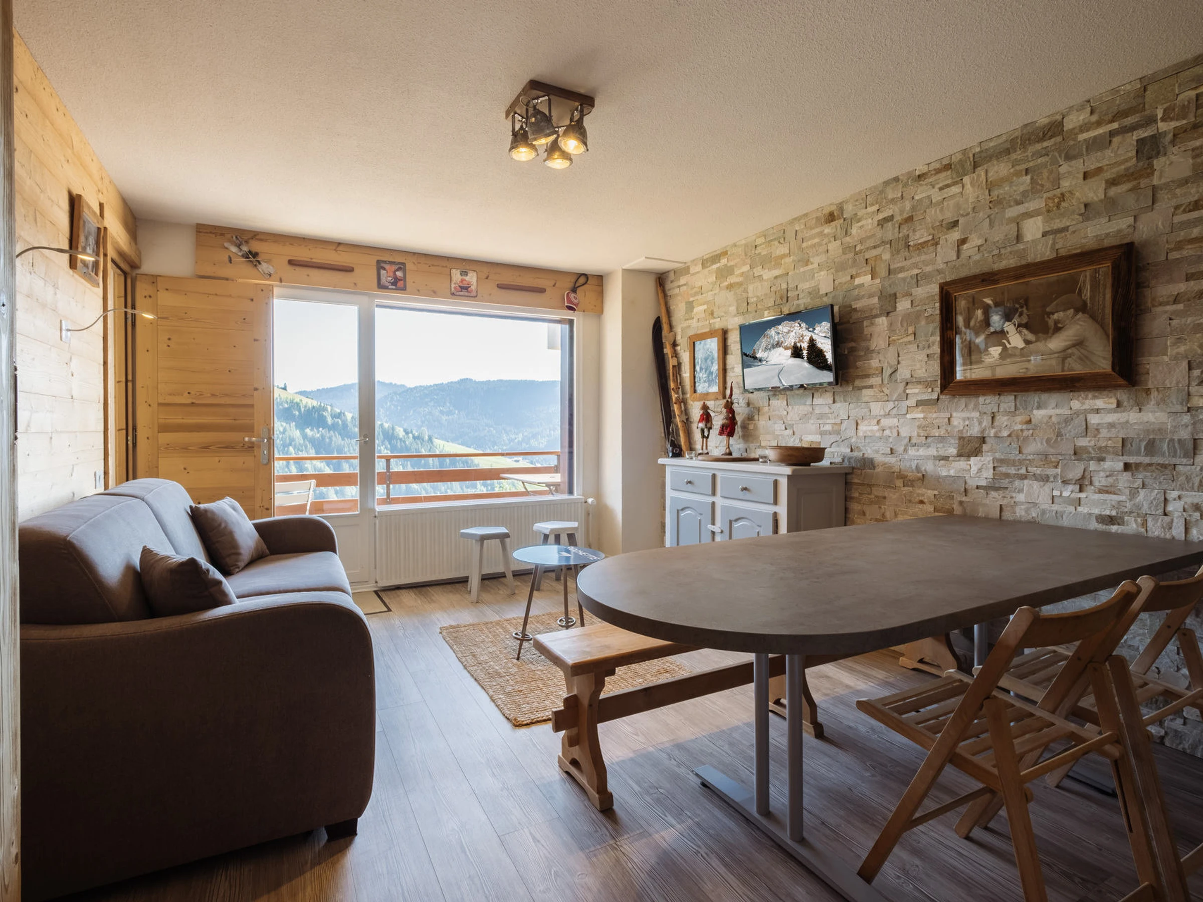 - SALÓN (16,53 m²): zona de comedor, TV de pantalla plana, 1 sofá cama doble convertible (140), ventanal + puerta-ventana, acceso al balcón sur, vistas a los chalets, pistas de esquí y montañas