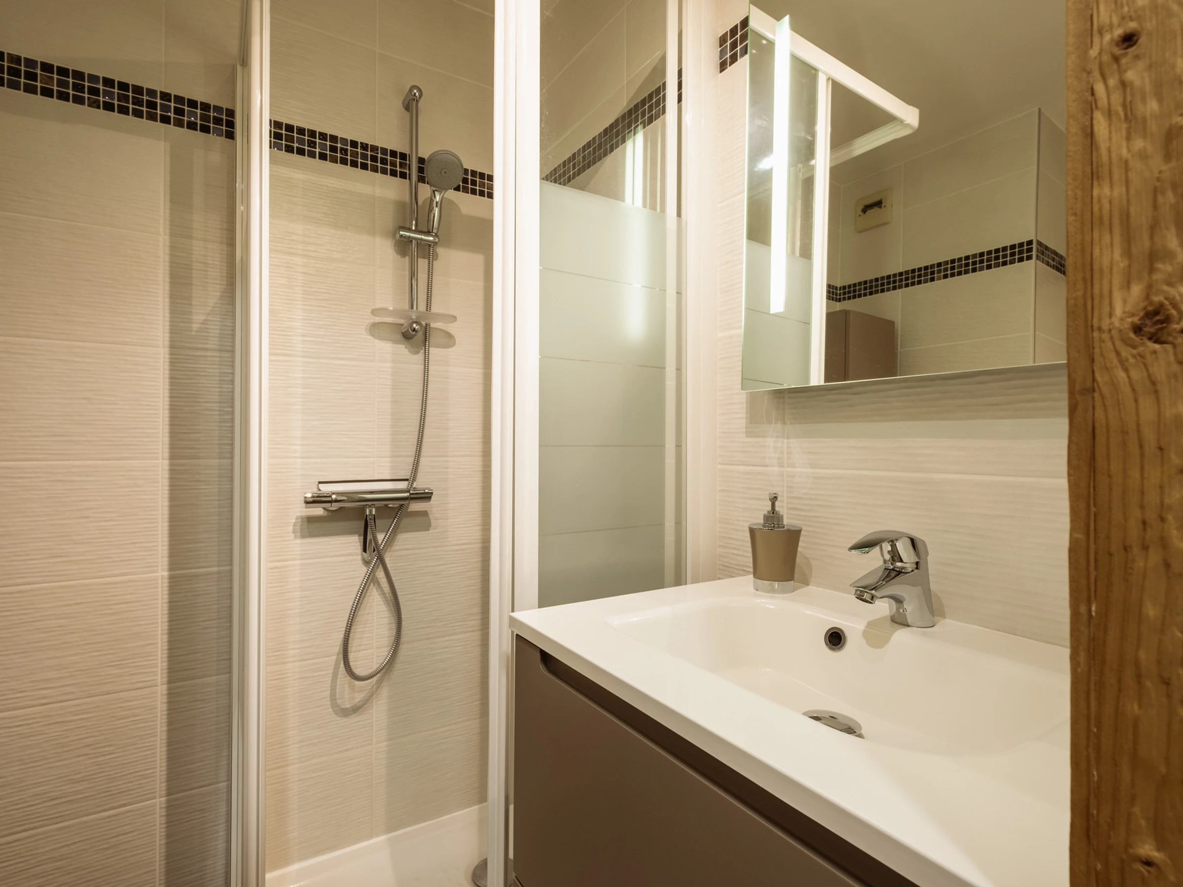 - BAÑO (2,69 m²): lavabo, ducha, radiador para secar toallas, lavadora (6 kg)