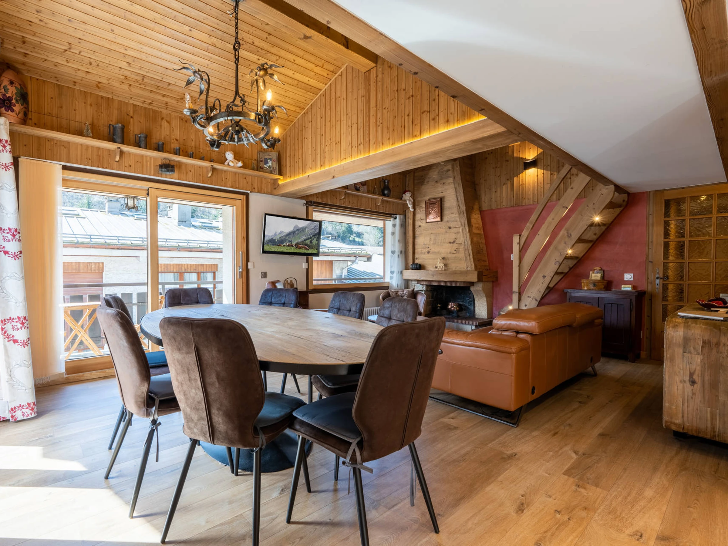 - SALÓN (36,98 m²): Zona de comedor, sofá, TV de pantalla plana, chimenea decorativa, ventanal con balcón y orientación este, aparcamiento Perrière / viviendas contiguas / vistas a la montaña, ventanal con balcón y orientación sur, viviendas contiguas / telesquíes / vistas a la montaña.
