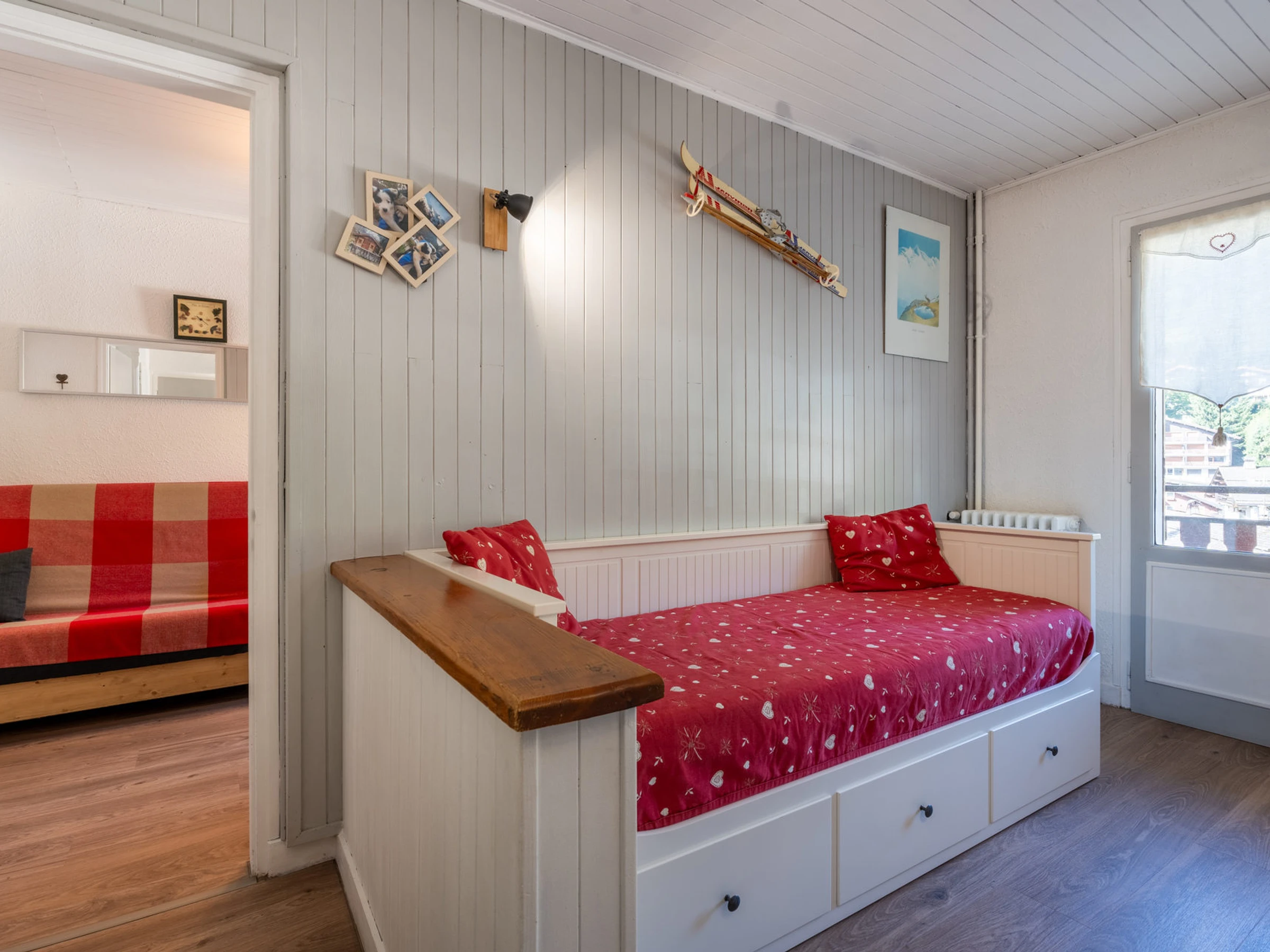- DORMITORIO (9,80 m²): 1 SOFÁ CAMA DOBLE (2 colchones de 90 cm), ventanal con orientación oeste y balcón, con vistas a las viviendas contiguas/al pueblo.
