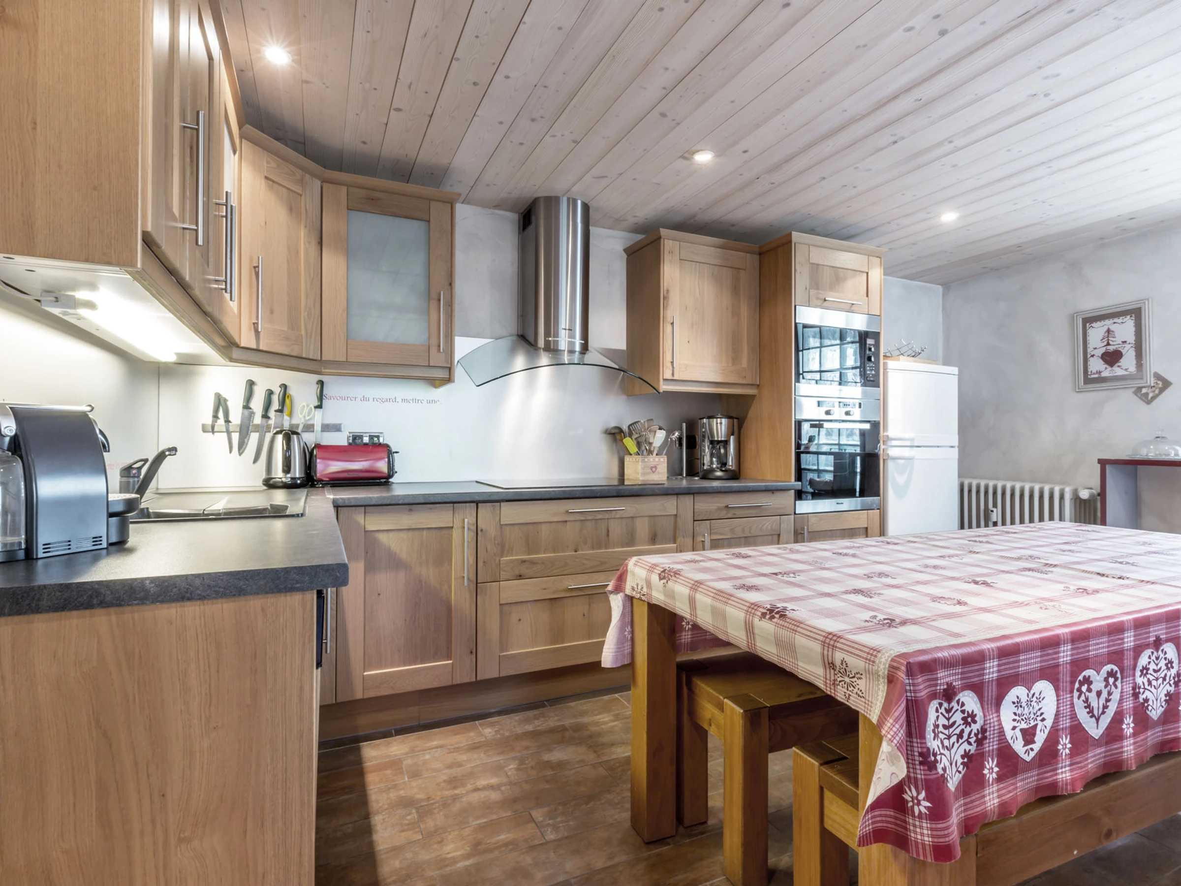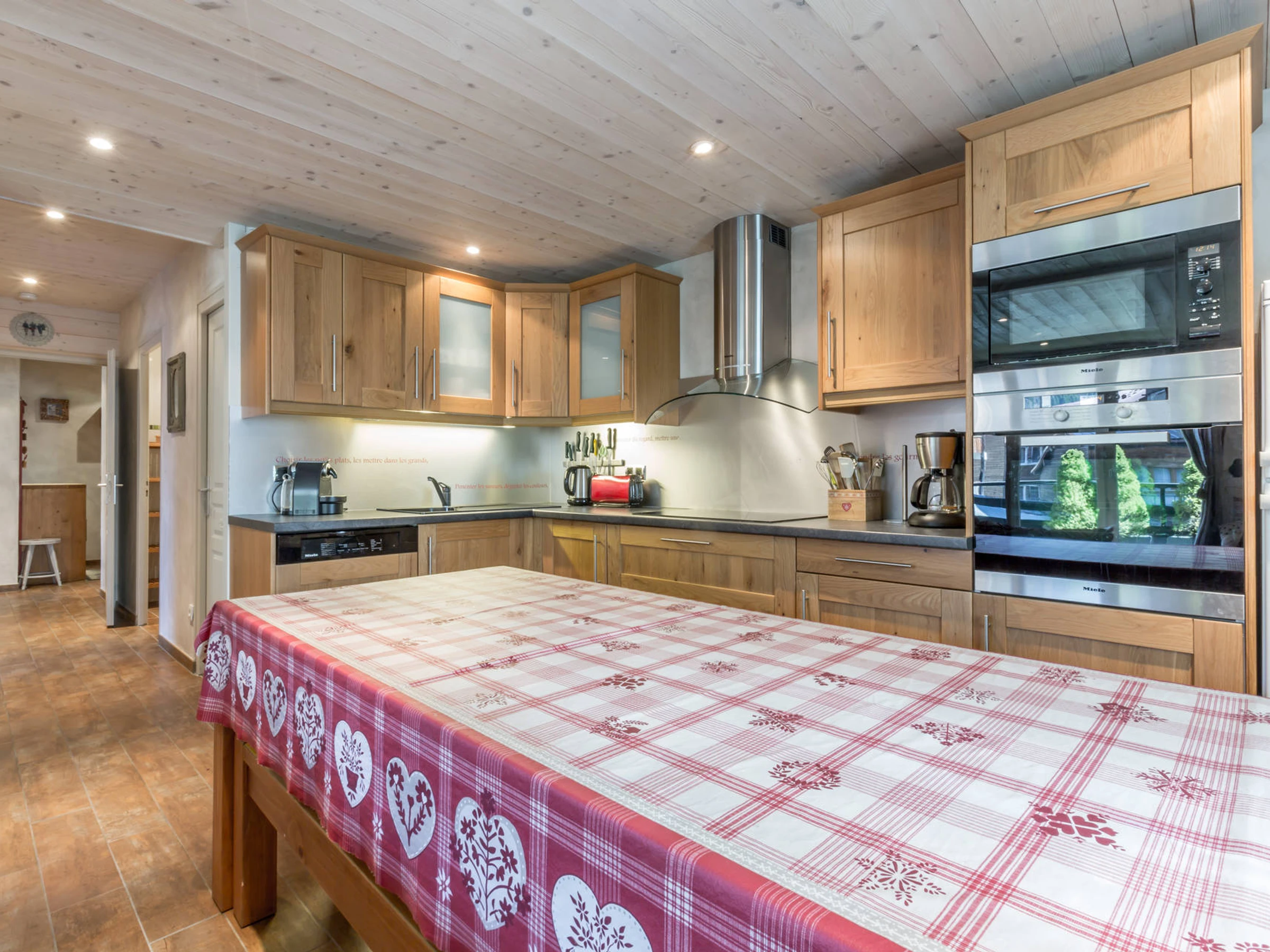 - COCINA abierta: frigorífico-congelador combinado (204 L), horno, cocina de INDUCCIÓN, microondas, lavavajillas, cafetera NESPRESSO
