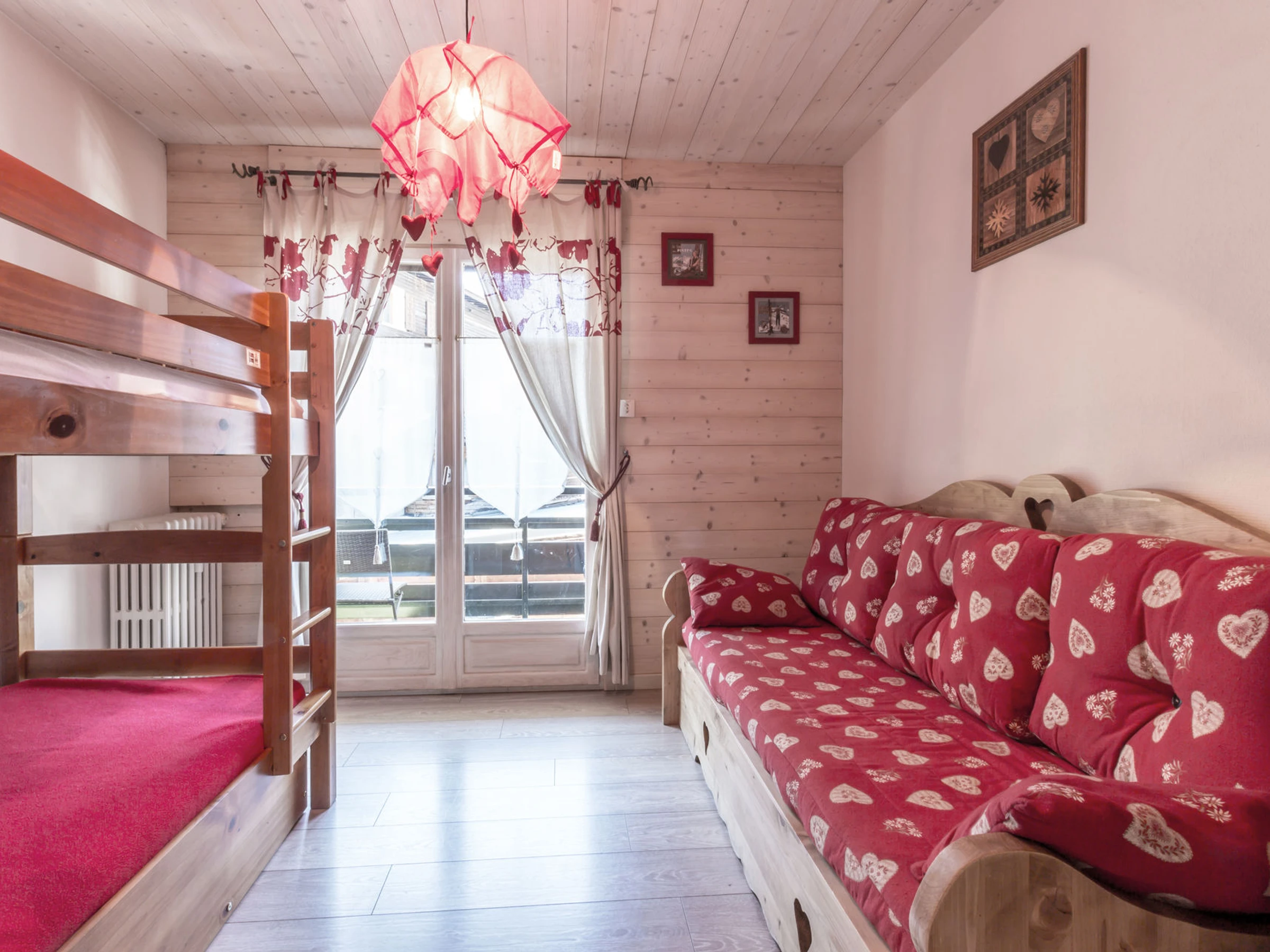 - DORMITORIO (10,08 m²): 1 SOFÁ CAMA INDIVIDUAL (80) + 1 CAMA NIDO INDIVIDUAL (80) + 2 LITERAS (90) -> cama superior prohibida para menores de 6 años, ventanal con orientación oeste y balcón, con vistas a la vivienda contigua