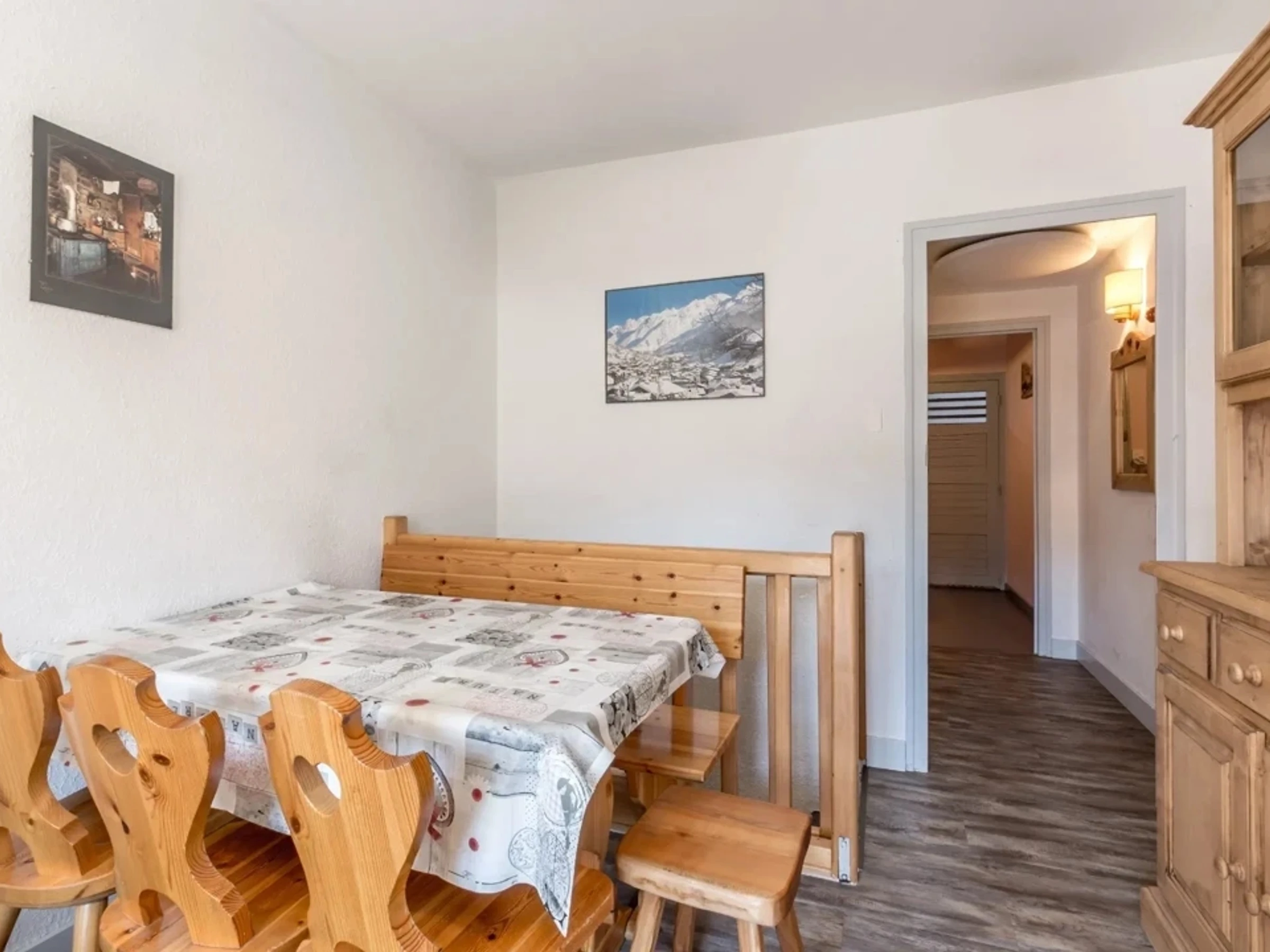 La entrada, situada en una planta baja elevada, da acceso a una cocina independiente. El luminoso salón, con orientación sur, incluye un comedor y un sofá cama (140 cm). Un ventanal francés da acceso al balcón, también orientado al sur, con vistas a las montañas y al complejo.