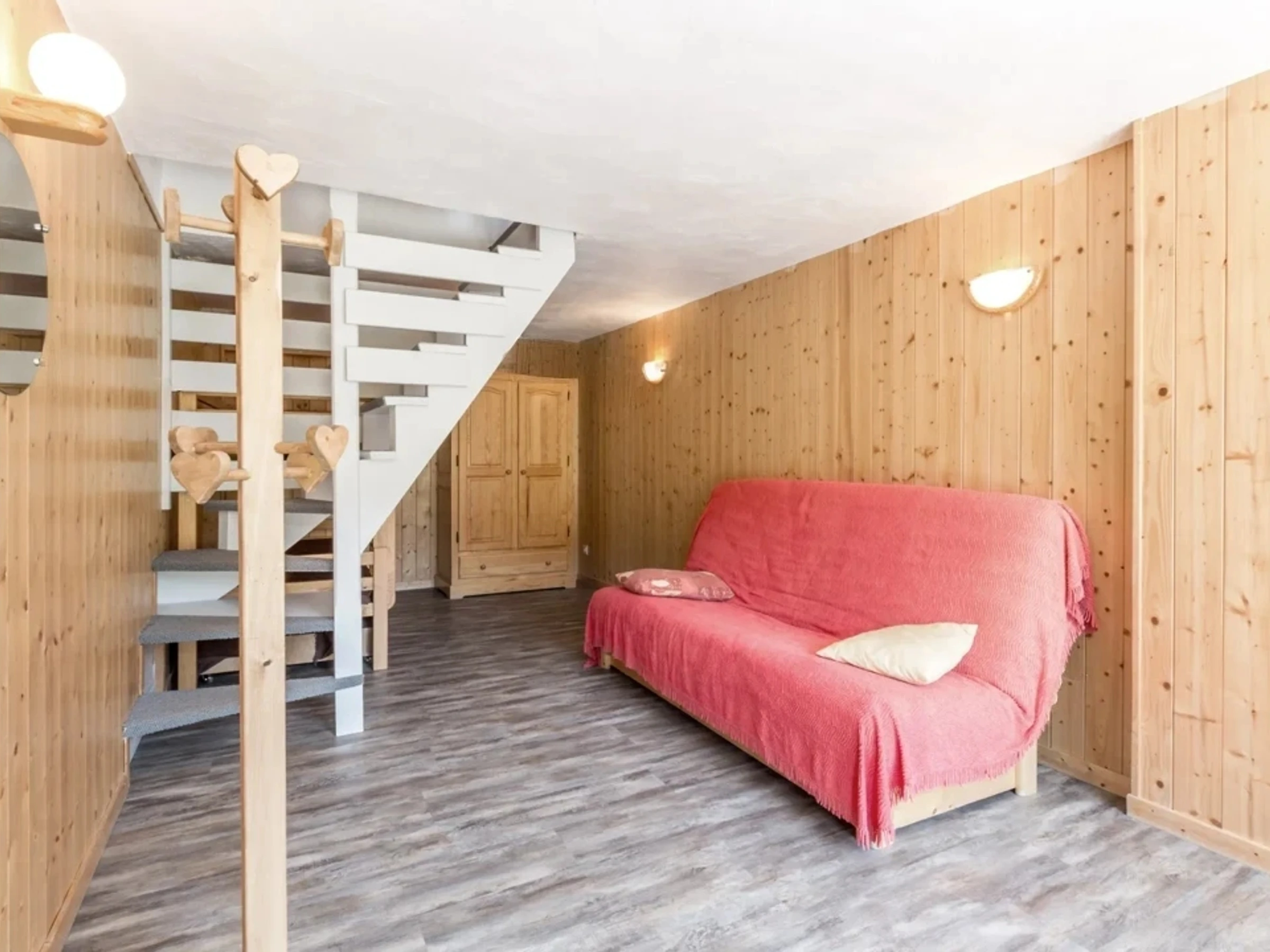 Una escalera conduce a la planta inferior, que incluye un sofá cama (130 cm), dos literas (80 cm) y una cama nido, y se abre hacia el sur.