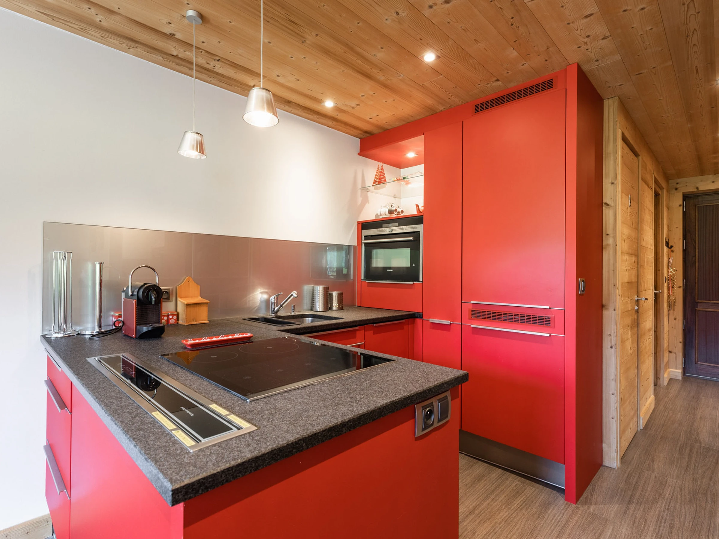 - COCINA: Frigorífico (169 L), horno, microondas, placa de inducción, lavavajillas, cafetera Nespresso