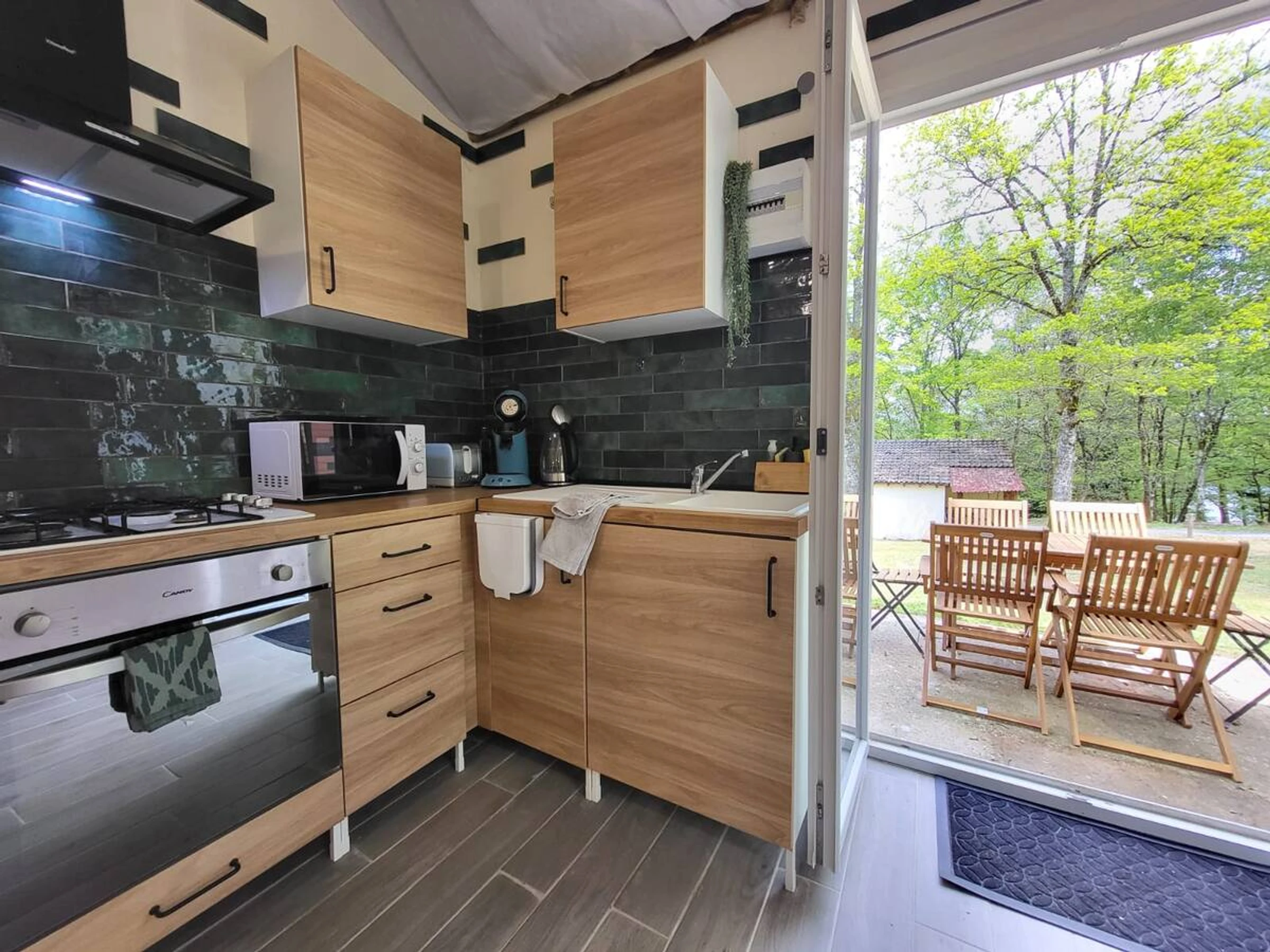 Esta casa rural de 26 m², funcional y cómoda, ha sido diseñada para maximizar el espacio: cama doble de 160 x 200 con armario empotrado; cocina equipada: vitrocerámica, microondas, nevera, vajilla y cafetera; comedor: mesa alta con taburetes; Salón con televisión; Baño independiente: ducha a ras de suelo, lavabo con espacio de almacenamiento, inodoro