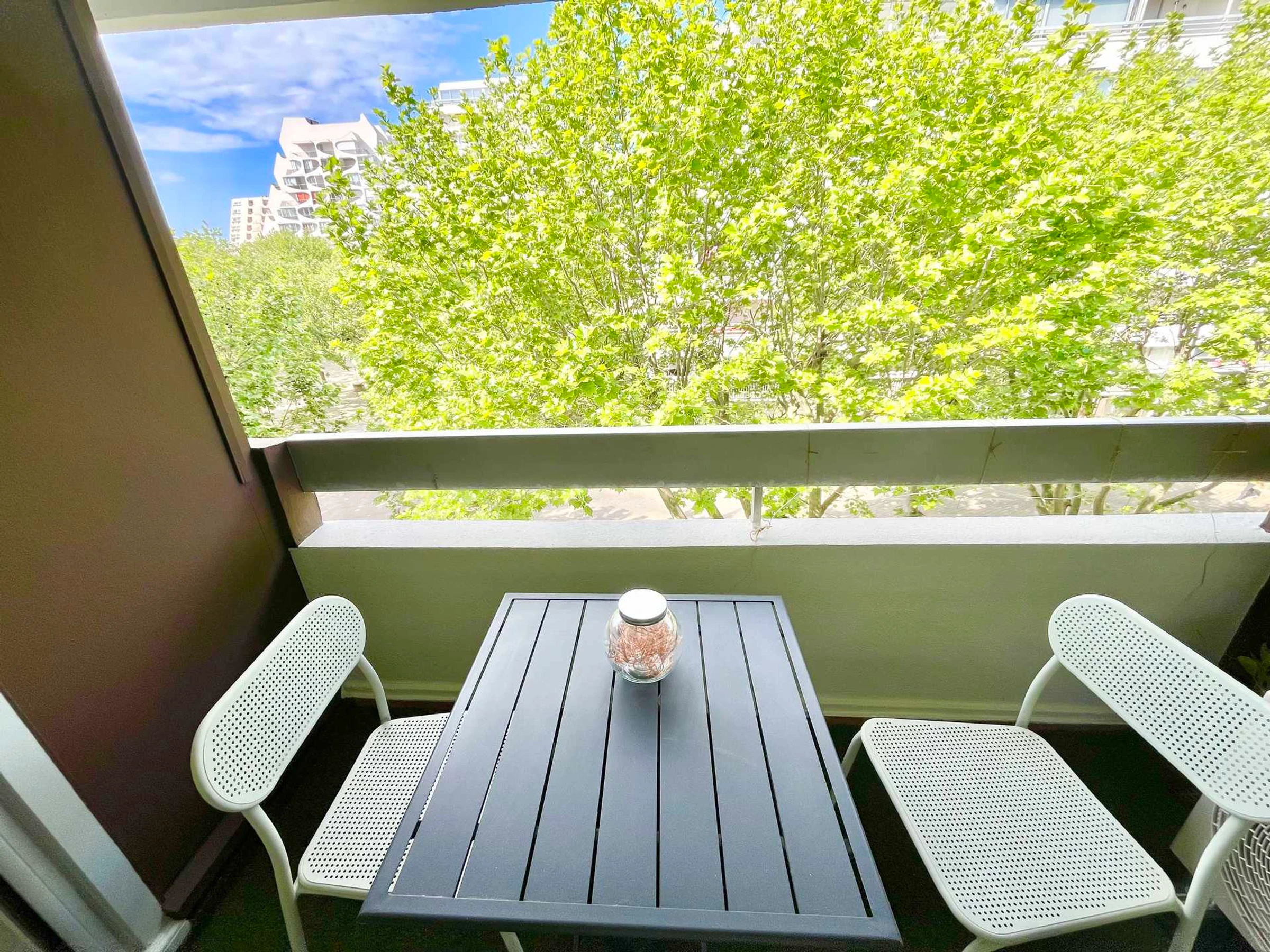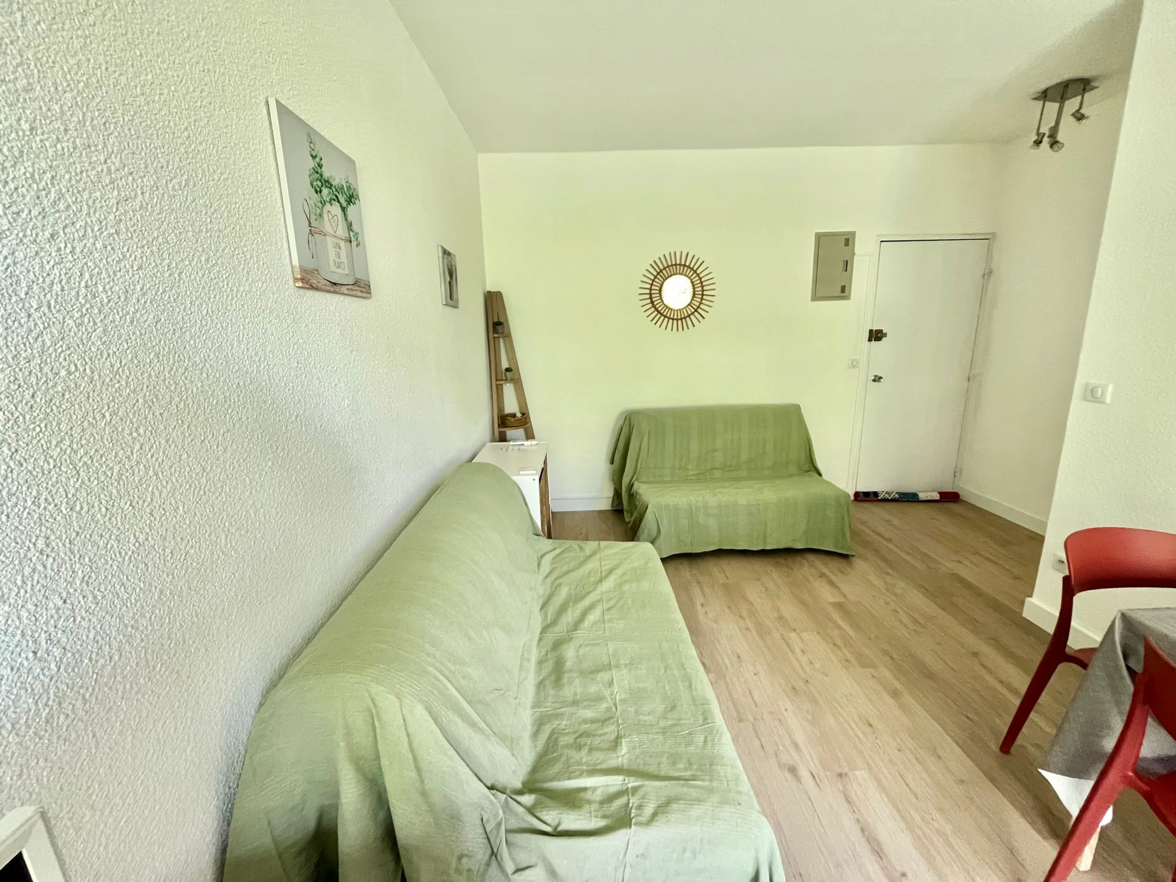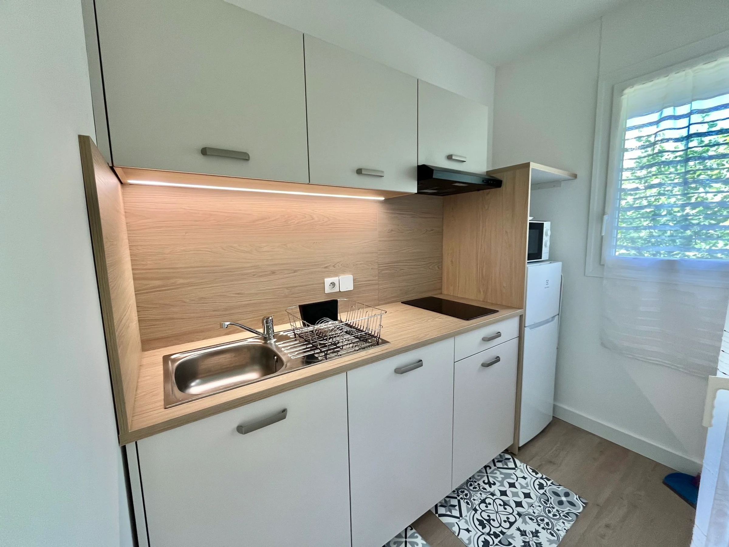 Apartamento estudio con aire acondicionado y terraza, bellamente renovado, para 4 personas, ubicado en la 2.ª planta (sin ascensor) de una residencia con piscina. Incluye: