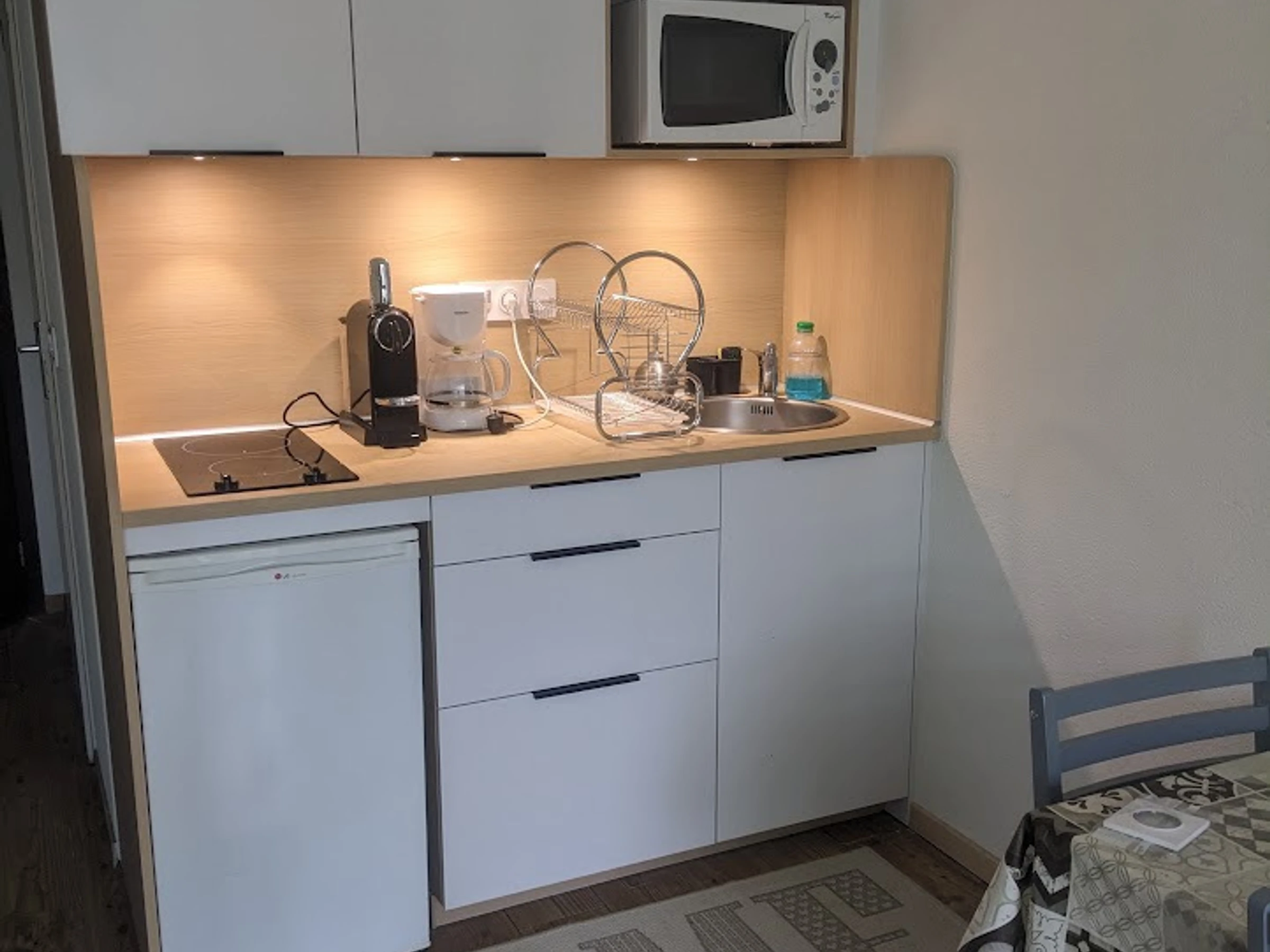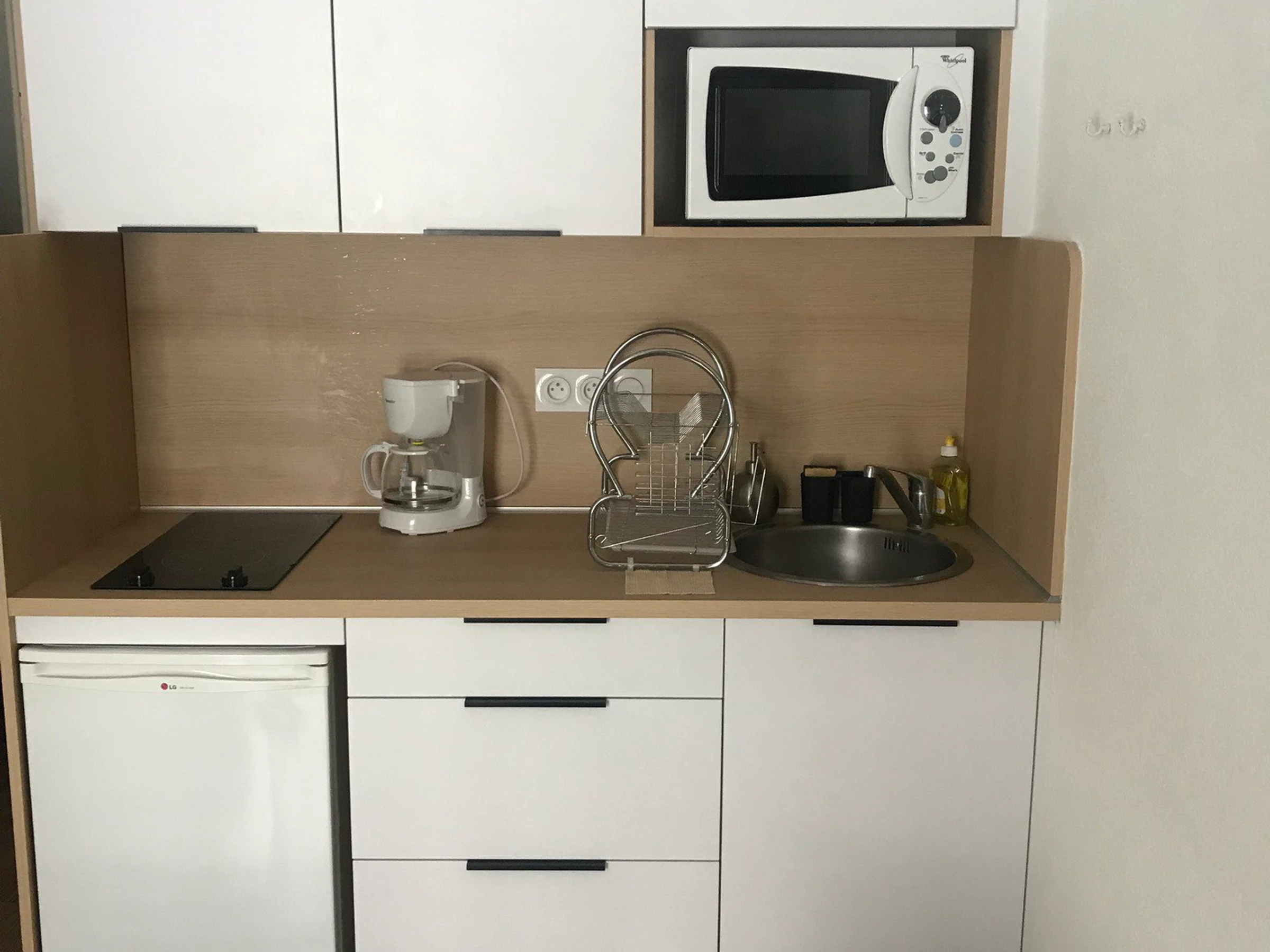 Cocina a monedas equipada con placas eléctricas, frigorífico, microondas, cuatro, cafetera con filtro, bouilloire, nécessaire de vaisselle.