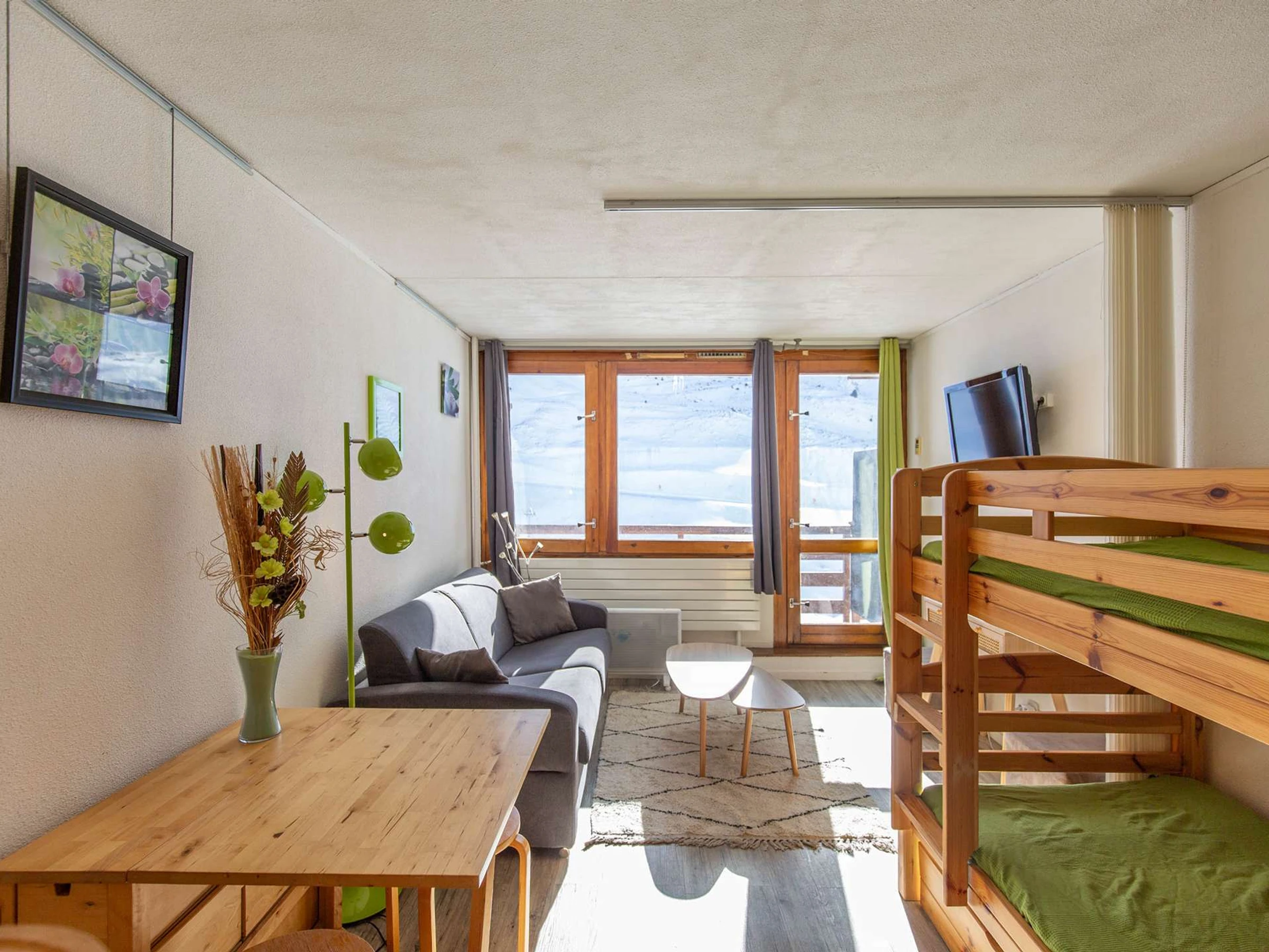 Apartamento situado en el 6º piso, superficie de 23 m² con balcón, orientación sur, frente a las montañas. Sala de estar con TV, sofá cama y literas en 90. Cocina abierta al salón con 2 placas eléctricas, microondas, mini nevera, nevera de 110 litros, cafetera de filtro, tostadora, hervidor, lavavajillas. Baño incluyendo: bañera, lavabo, aseos. Suelo de madera, lavabo de esquí frente al estudio.