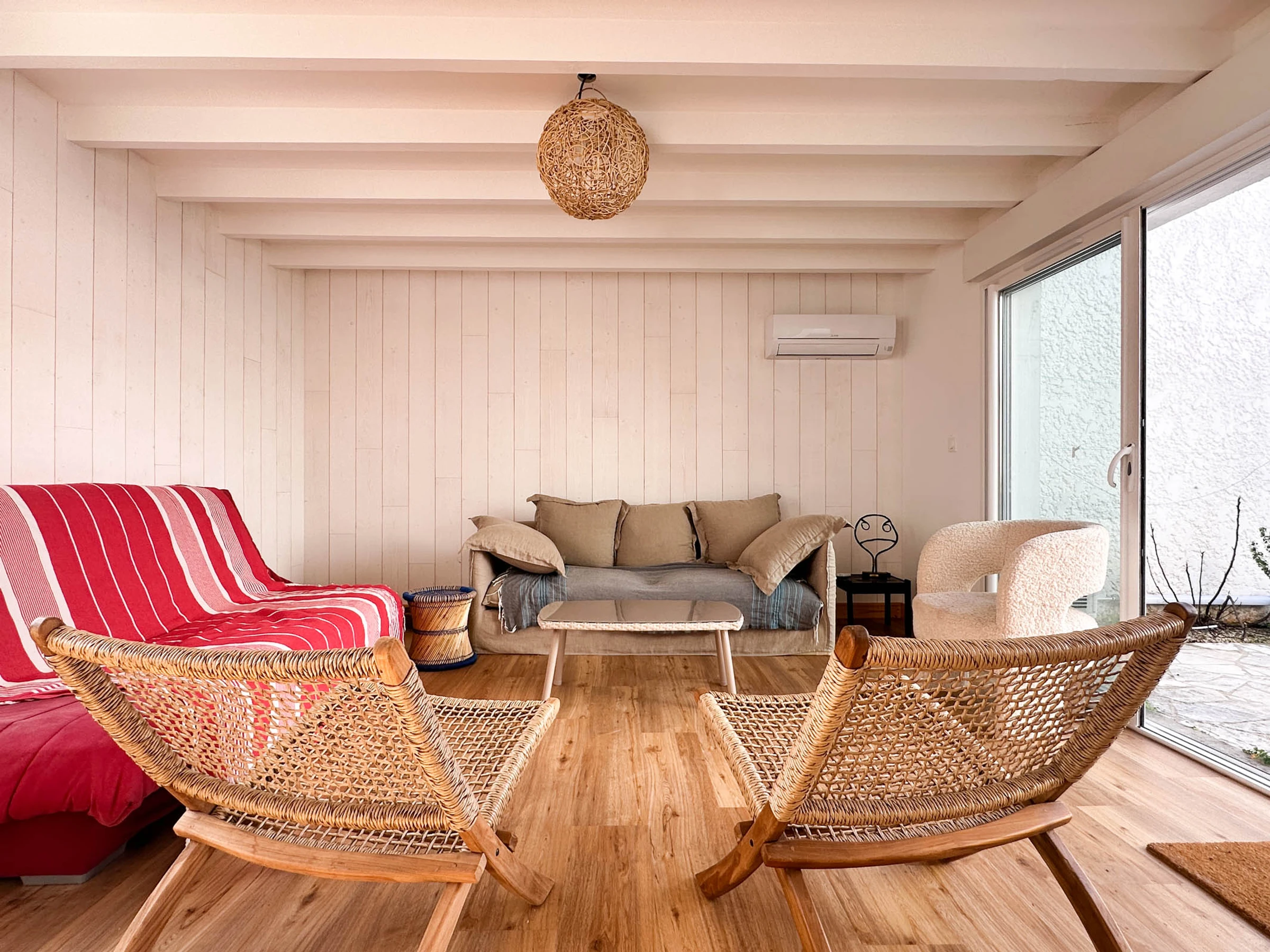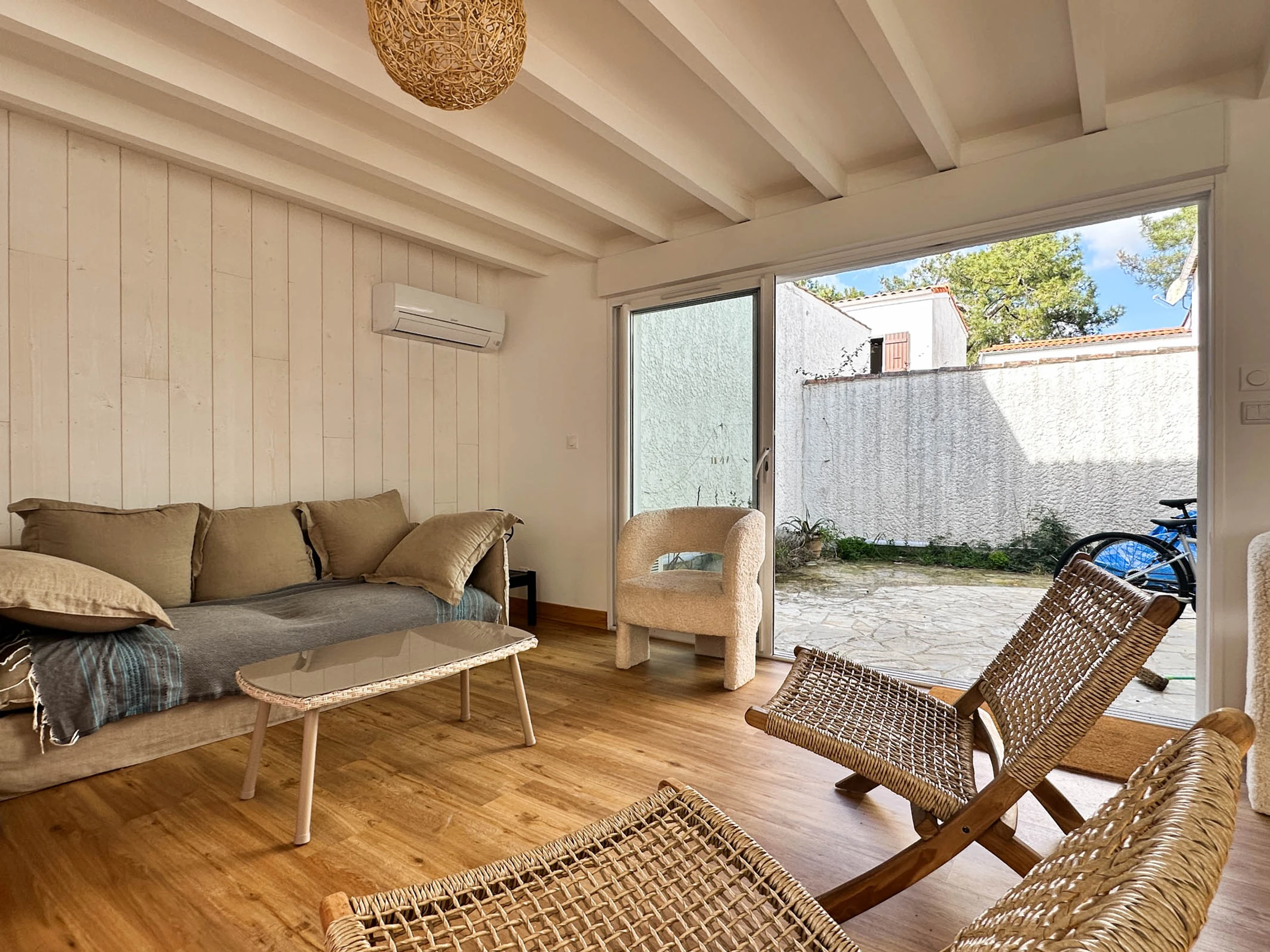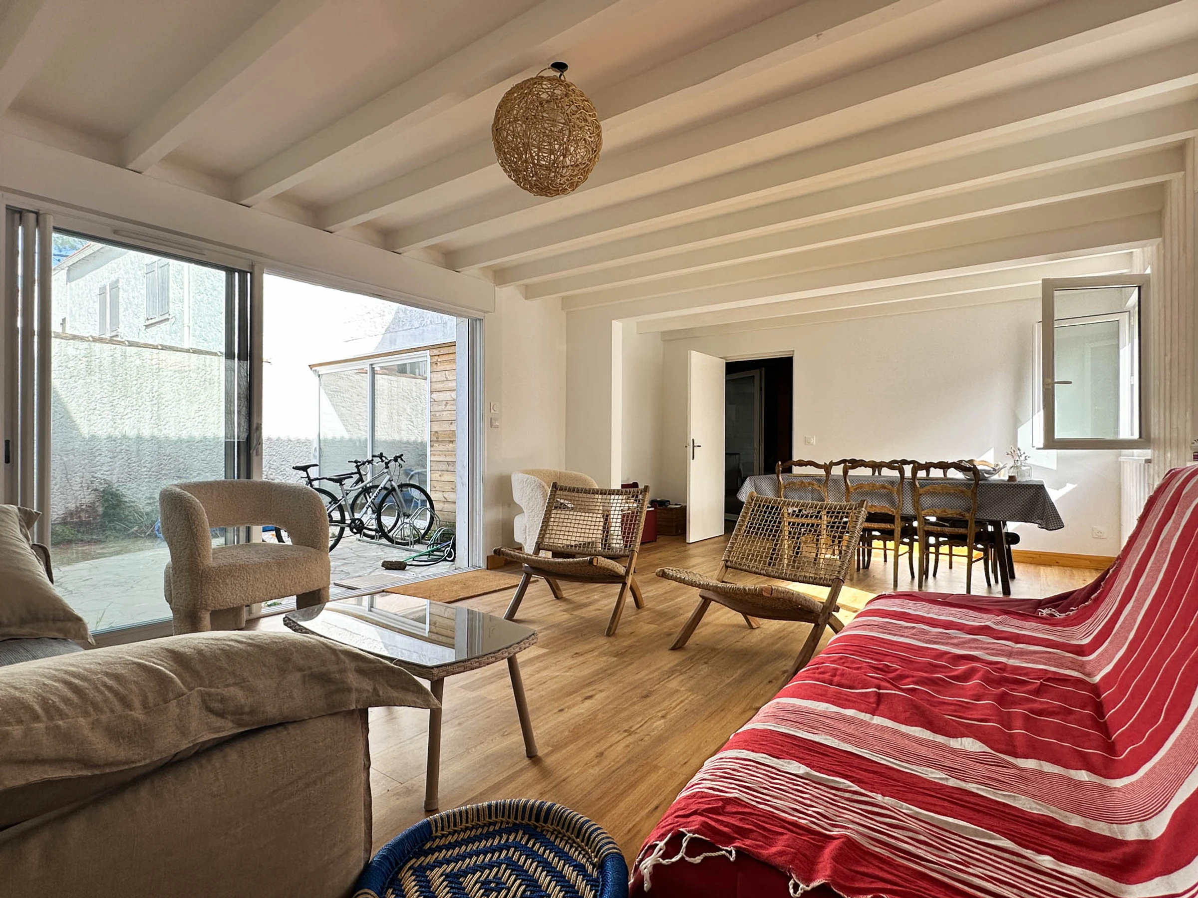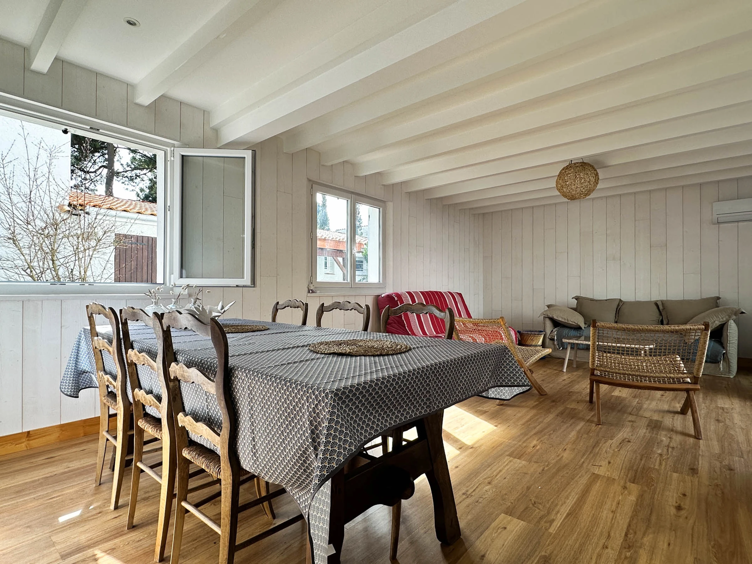 Luminoso salón climatizado con acceso a Internet (fibra), sofás, zona de comedor y ventanal que da a un patio abierto.