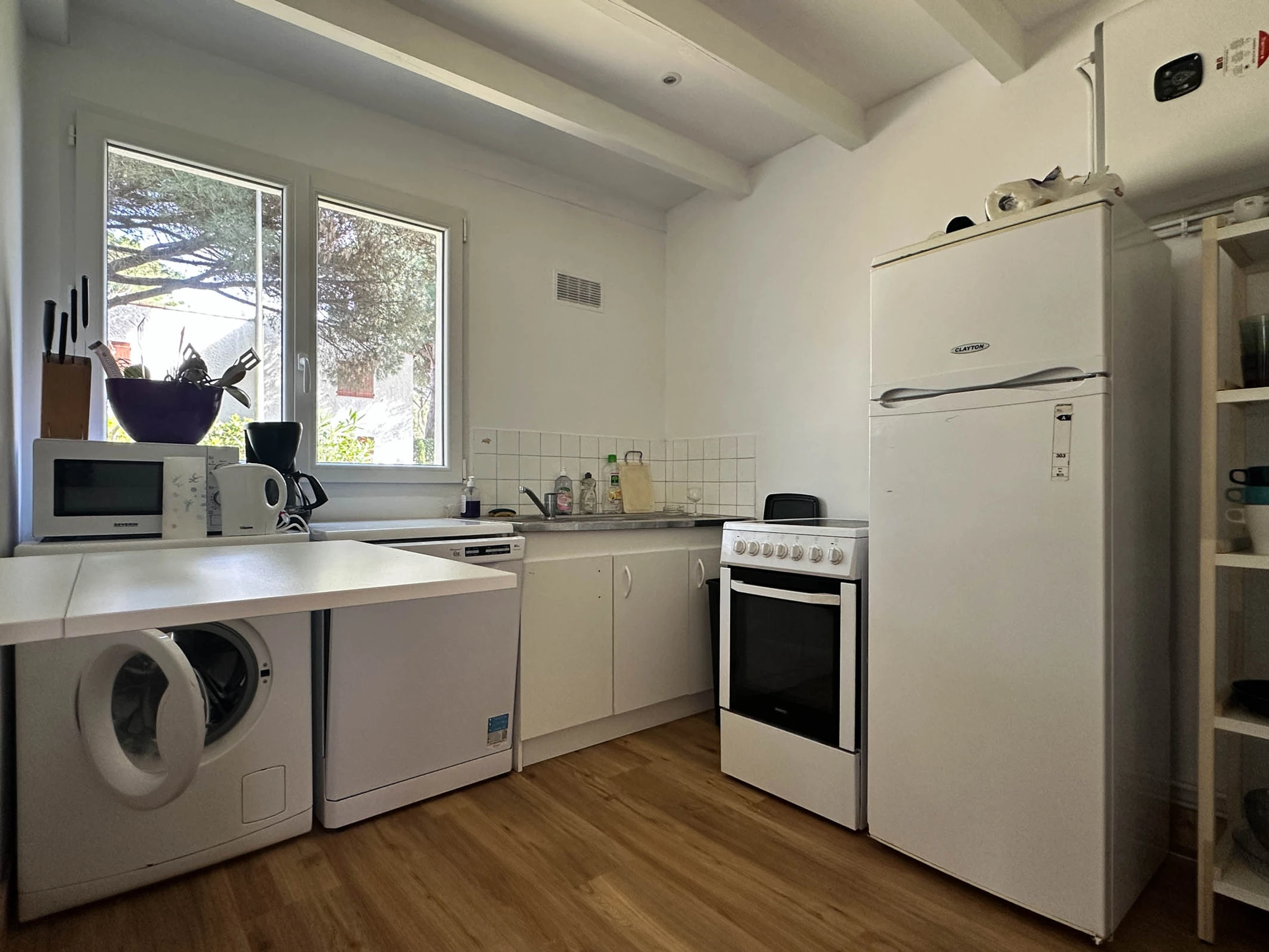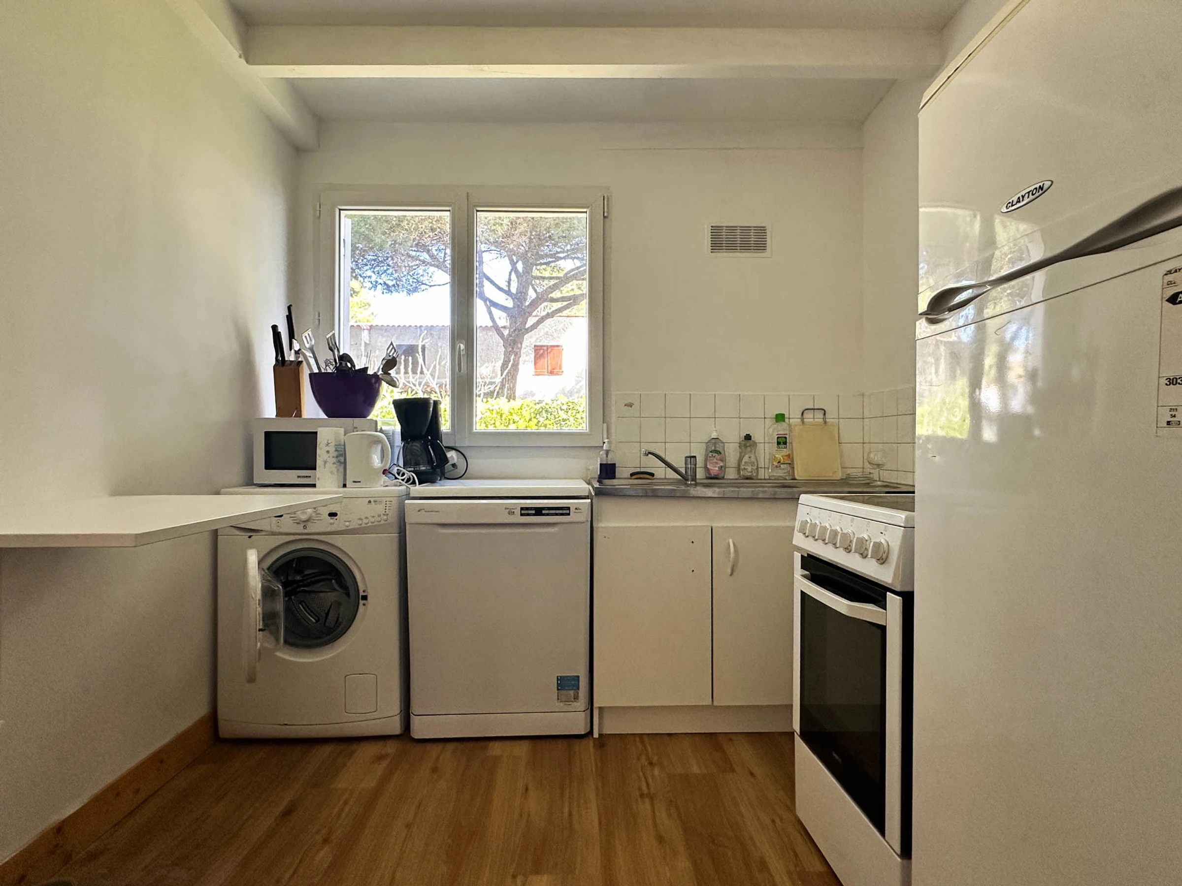 - Entrada que conduce a una cocina independiente y equipada: frigorífico/congelador, cocina eléctrica (placas de cocción + horno), microondas, hervidor de agua, cafetera, tostadora, lavavajillas y lavadora.