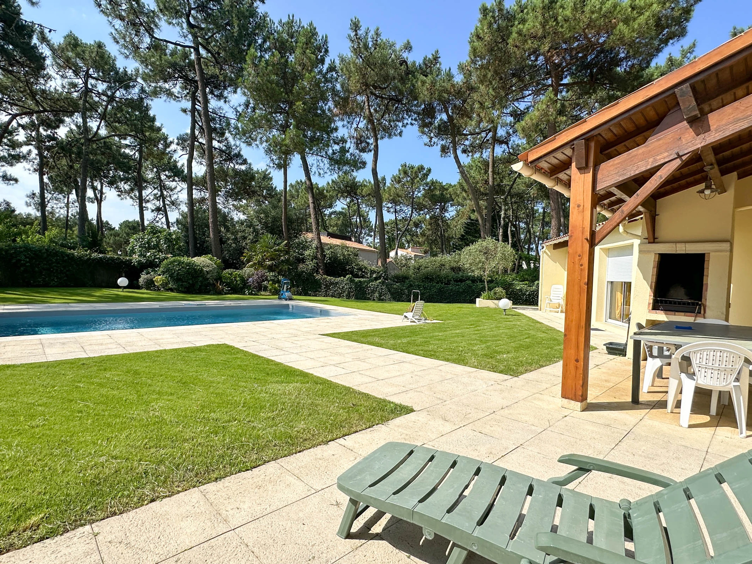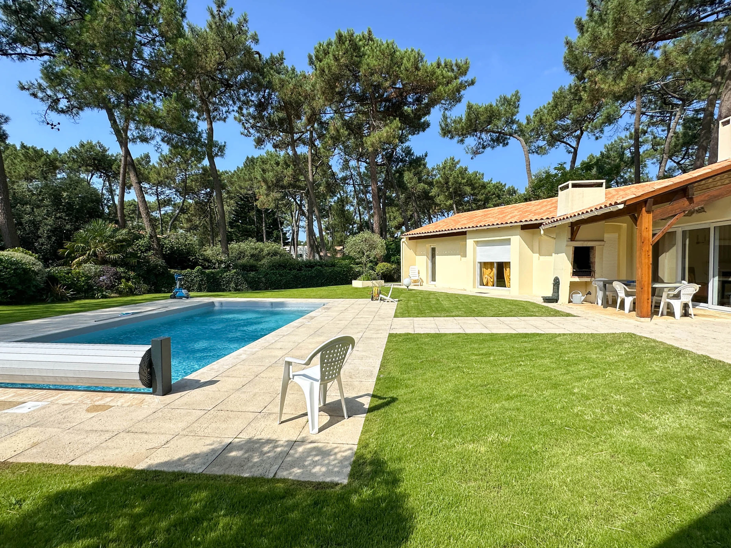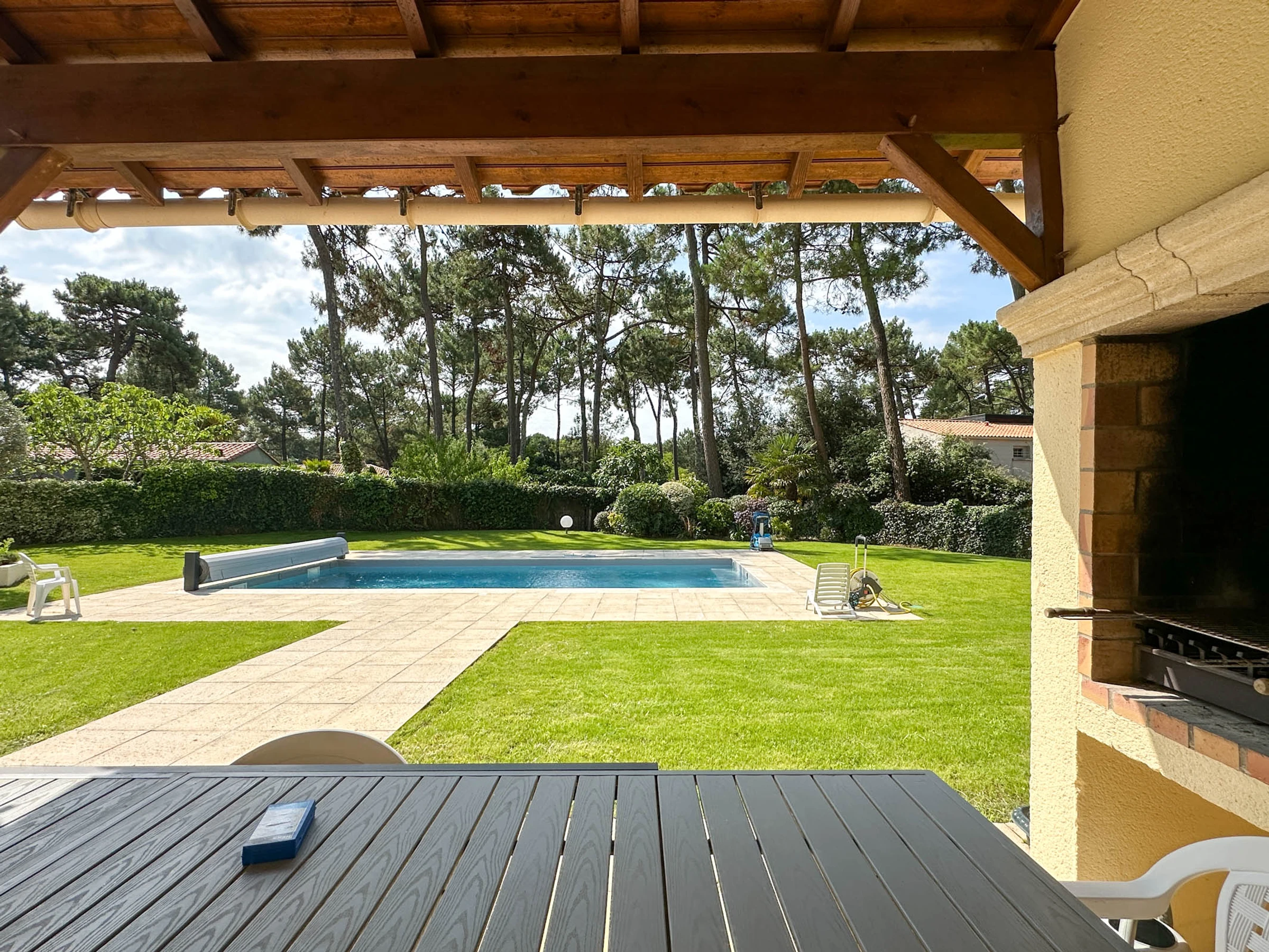 Terraza cubierta orientada al sur con barbacoa de carbón de obra. Piscina enterrada segura con cortina de superficie eléctrica.