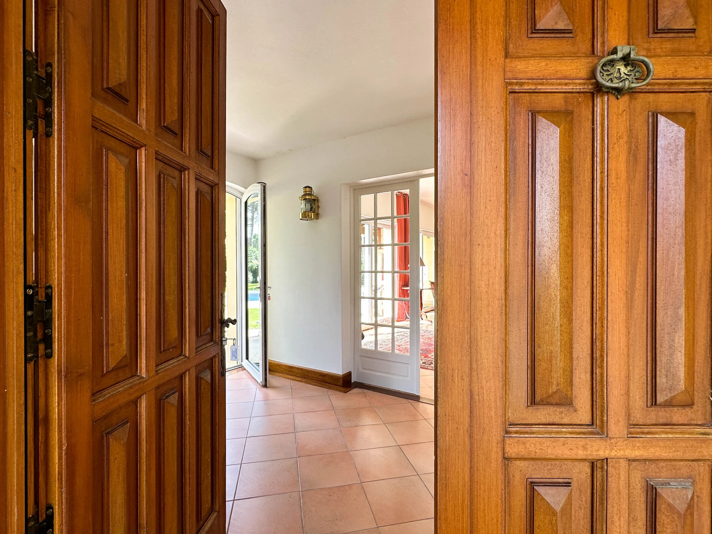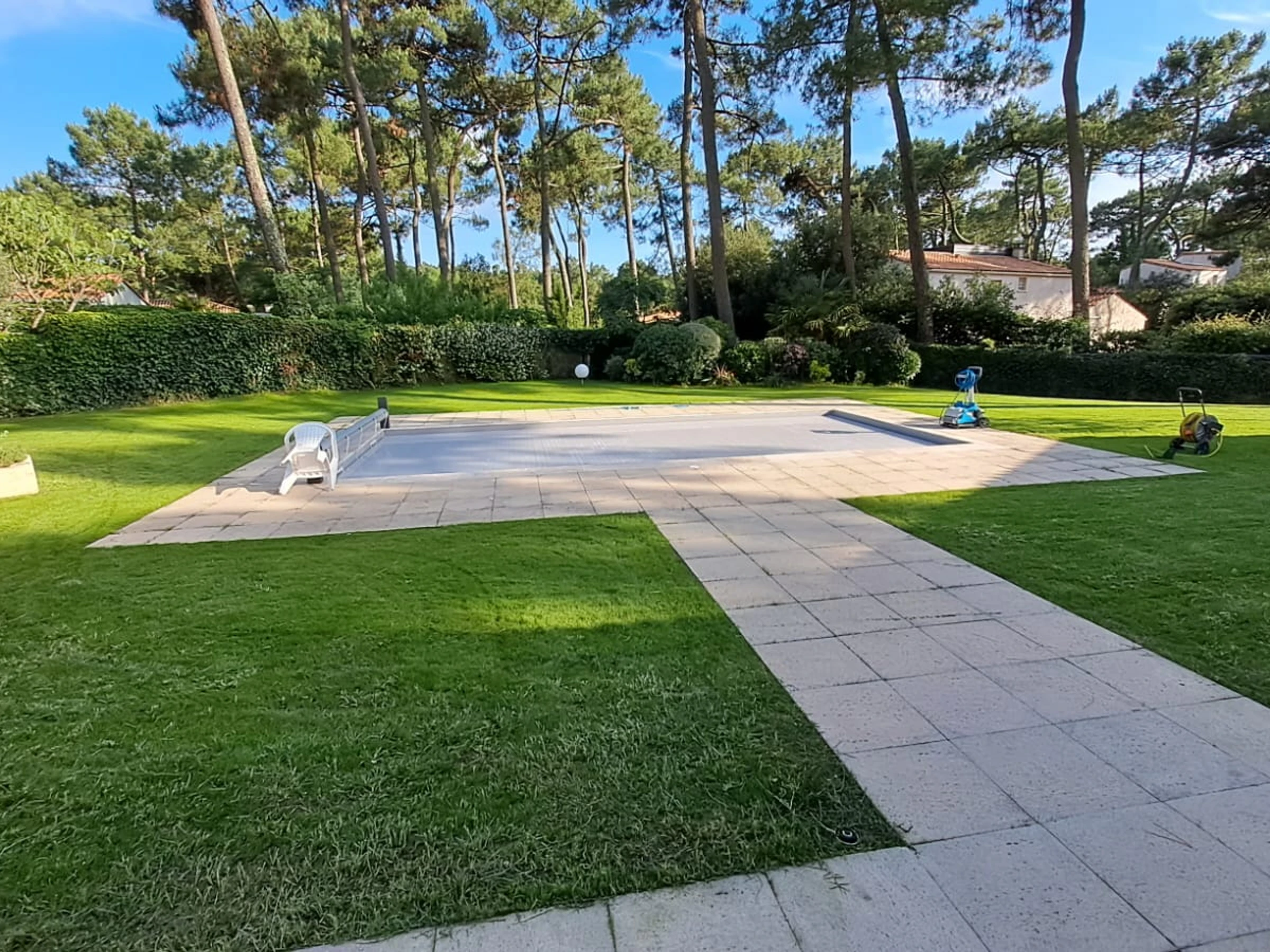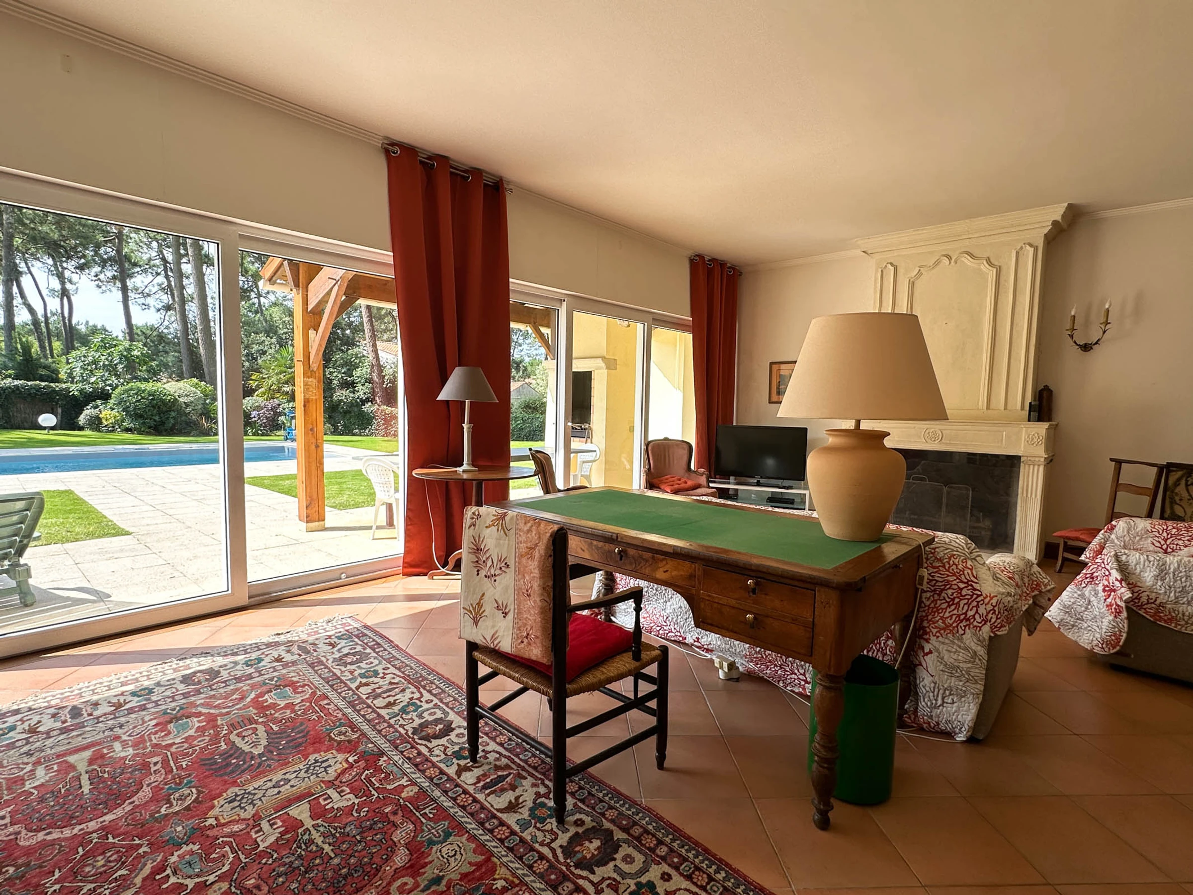 Terraza cubierta orientada al sur con barbacoa de carbón de obra. Piscina enterrada segura con cortina de superficie eléctrica.