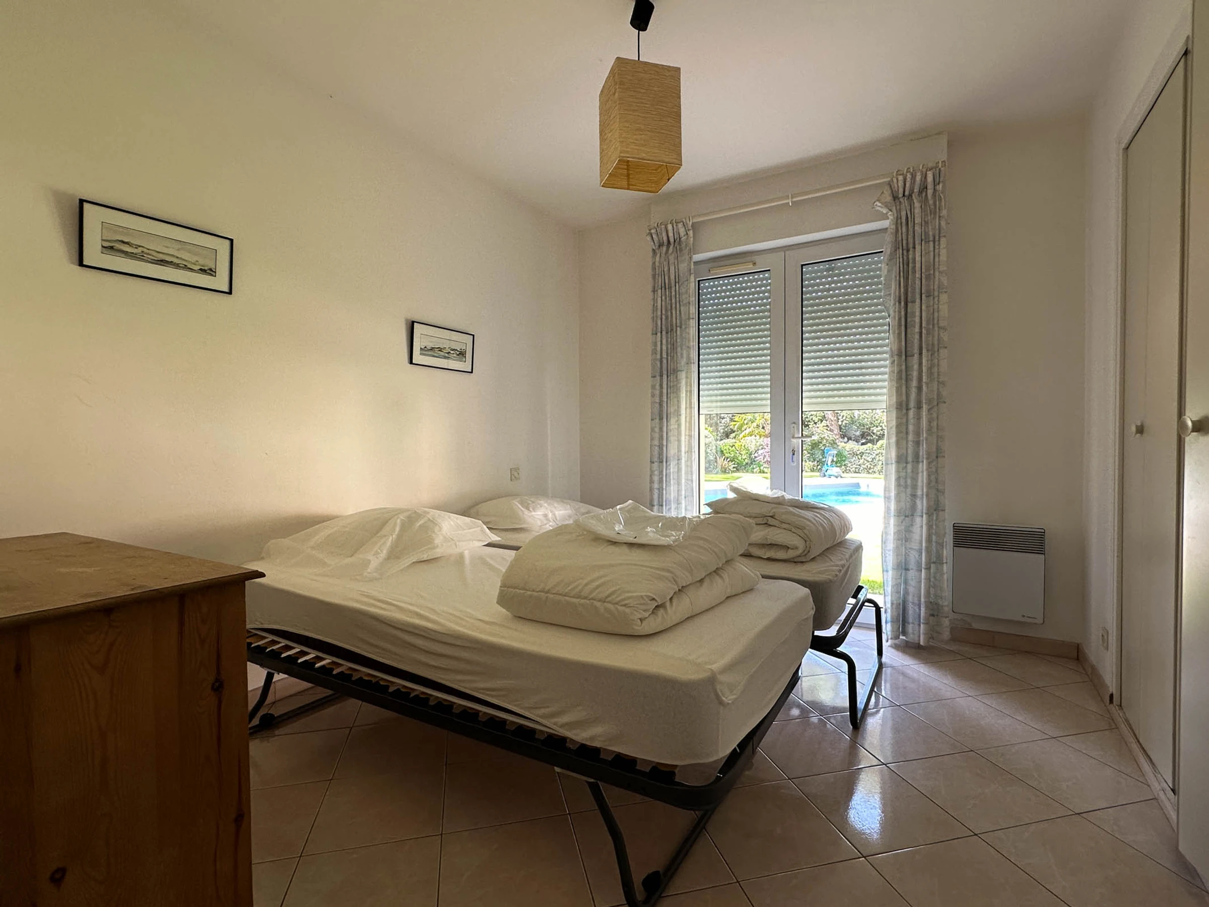 - Dormitorio con 2 camas individuales de 90 cm - Dormitorio con 1 cama individual de 160 cm o 2 camas individuales de 80 cm - - Cuarto de ducha - WC independiente